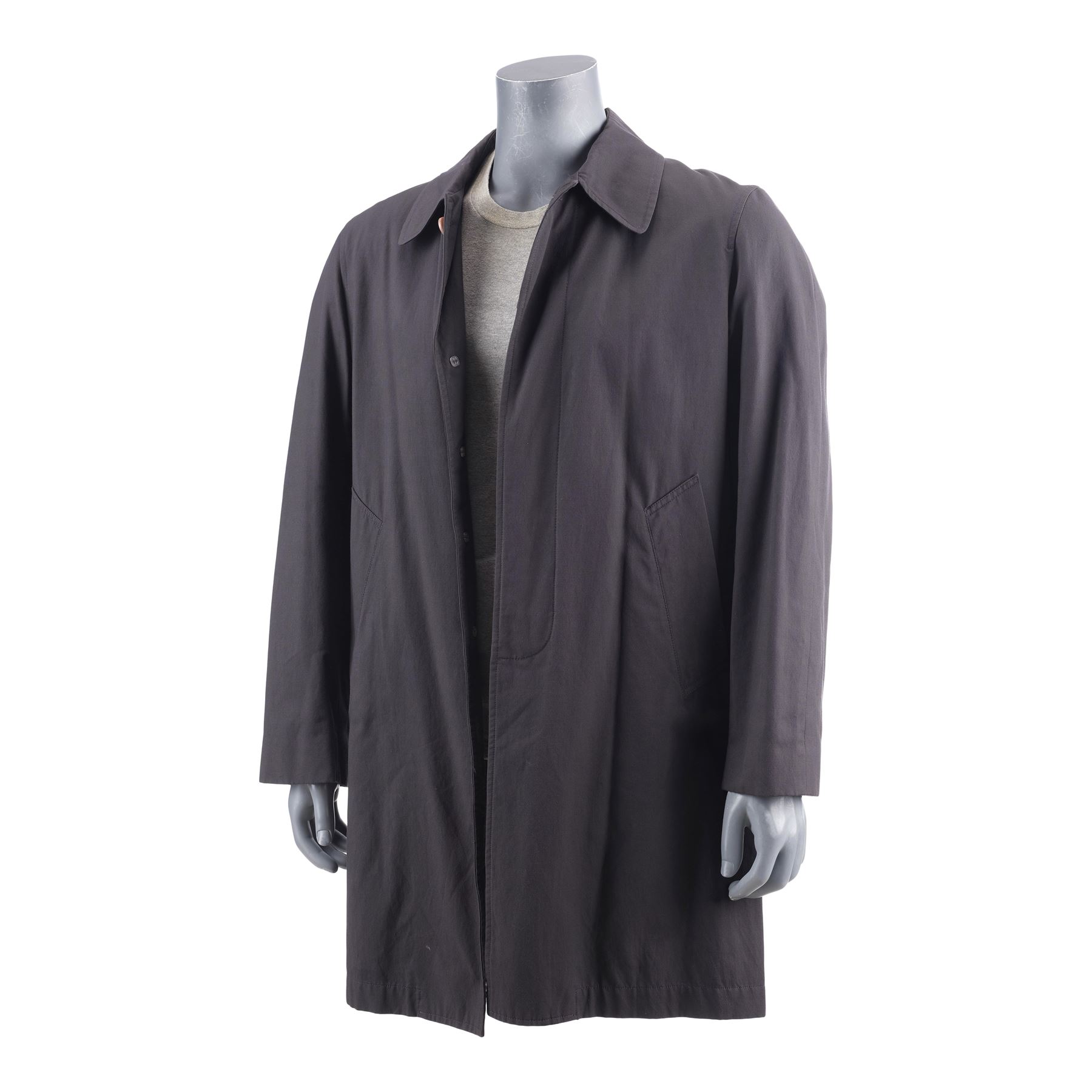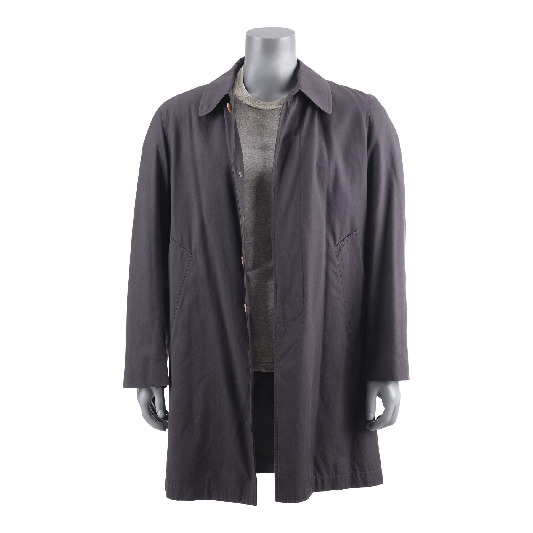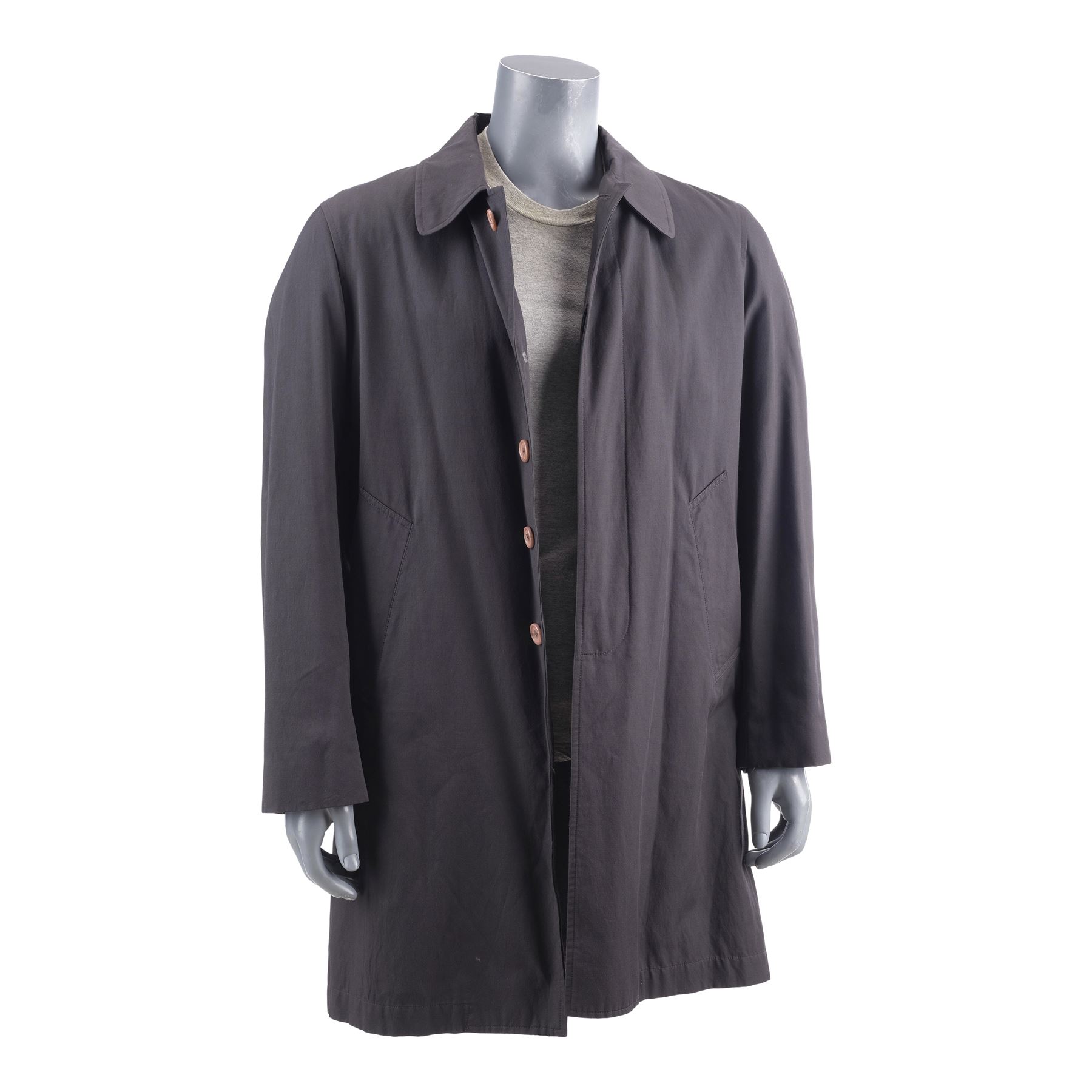 This lot consists of one black polyester trench coat with a button closure and a gray cotton T-shirt. Production intentionally distressed this shirt to appear grimy around the neck and a little bloody. This lot exhibits loose threads, distressing around the collar, and mild discoloration on the coat's interior.