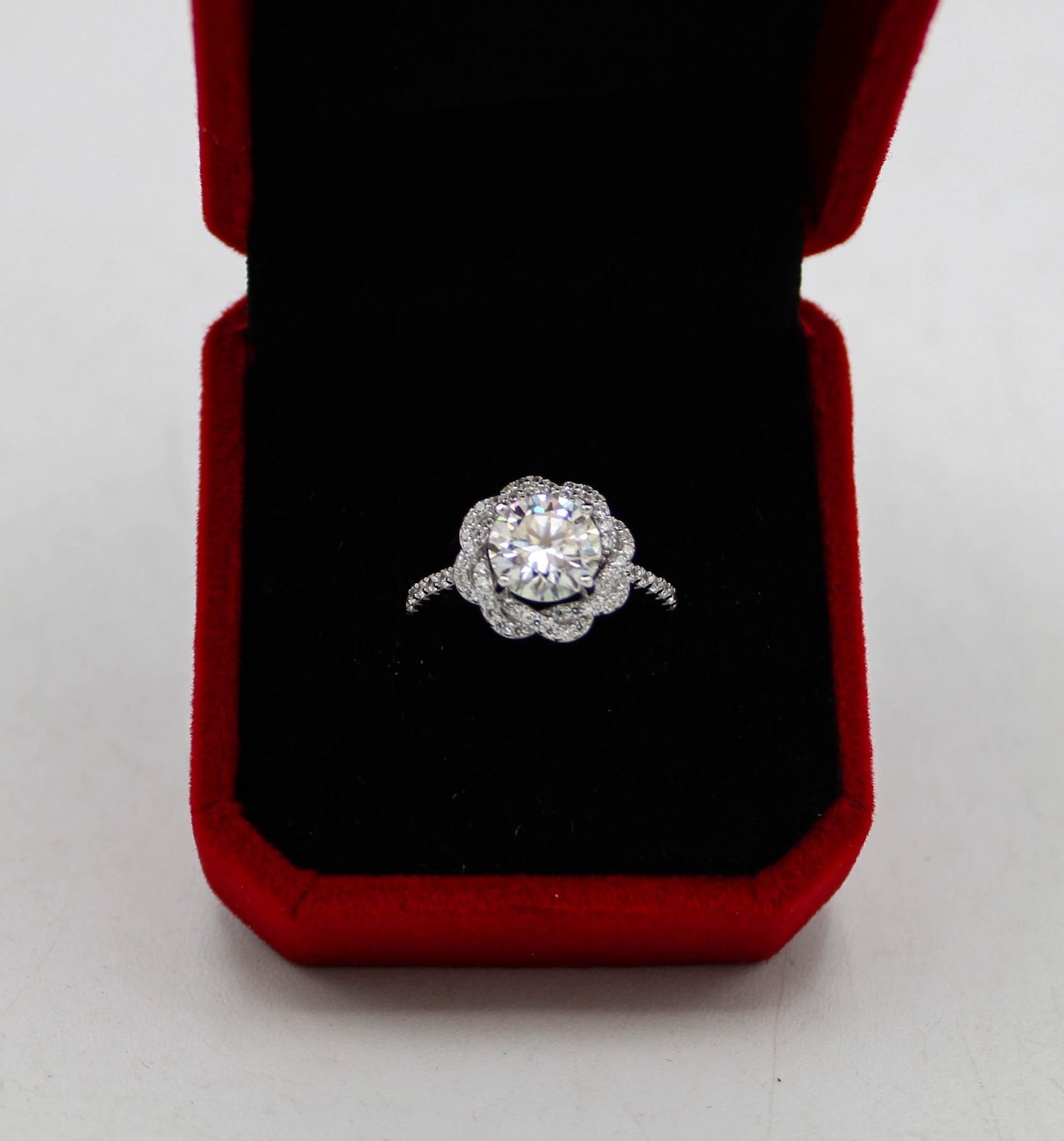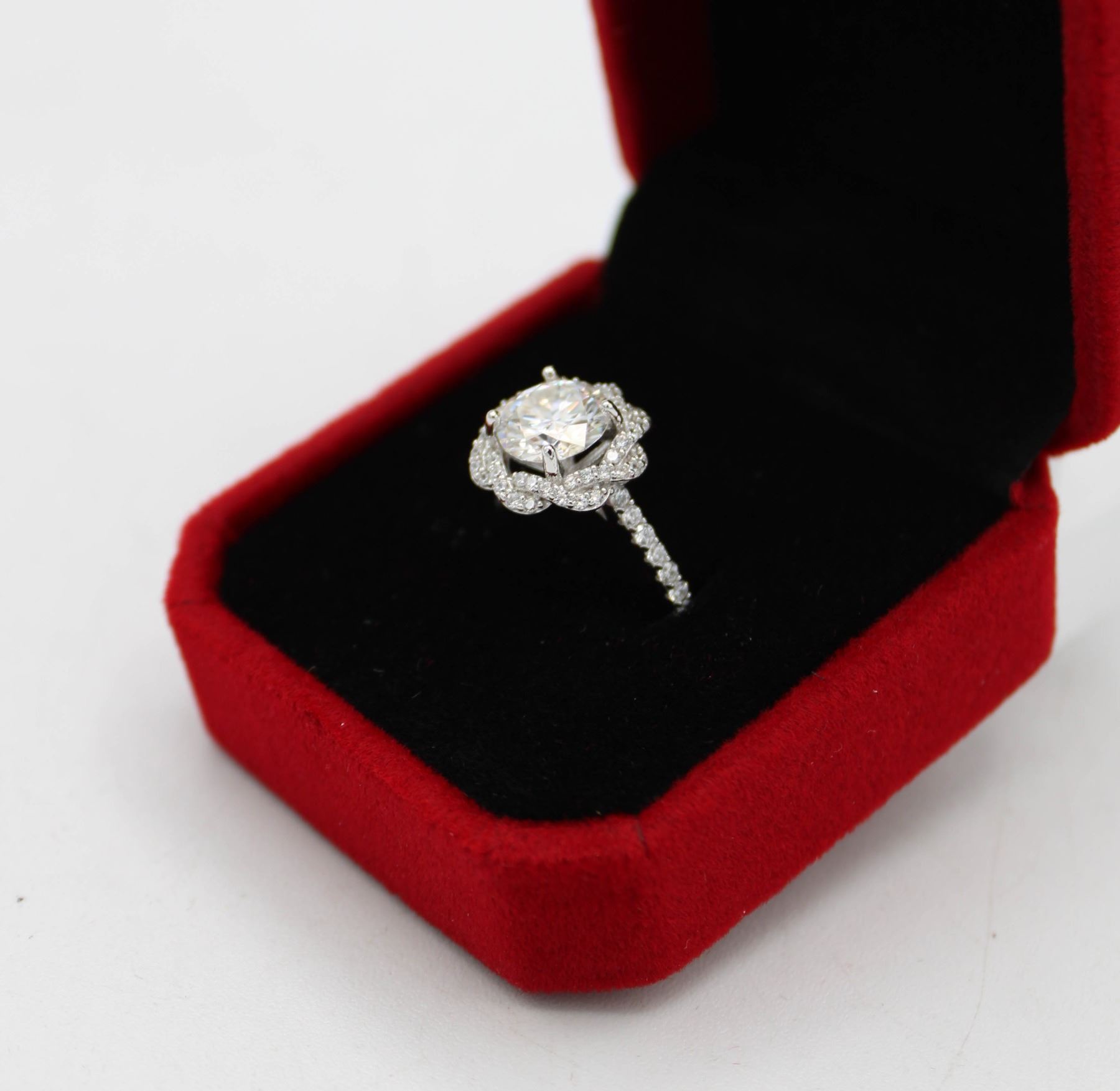 MOISSANITE STONE VVS D COLOR WITH 48 ROUND BRILLIANT CUT CUBIC ZIRCONIA SET IN HALO AND 14 SET IN SHANKS SET IN 925 SILVER RING SIZE 6