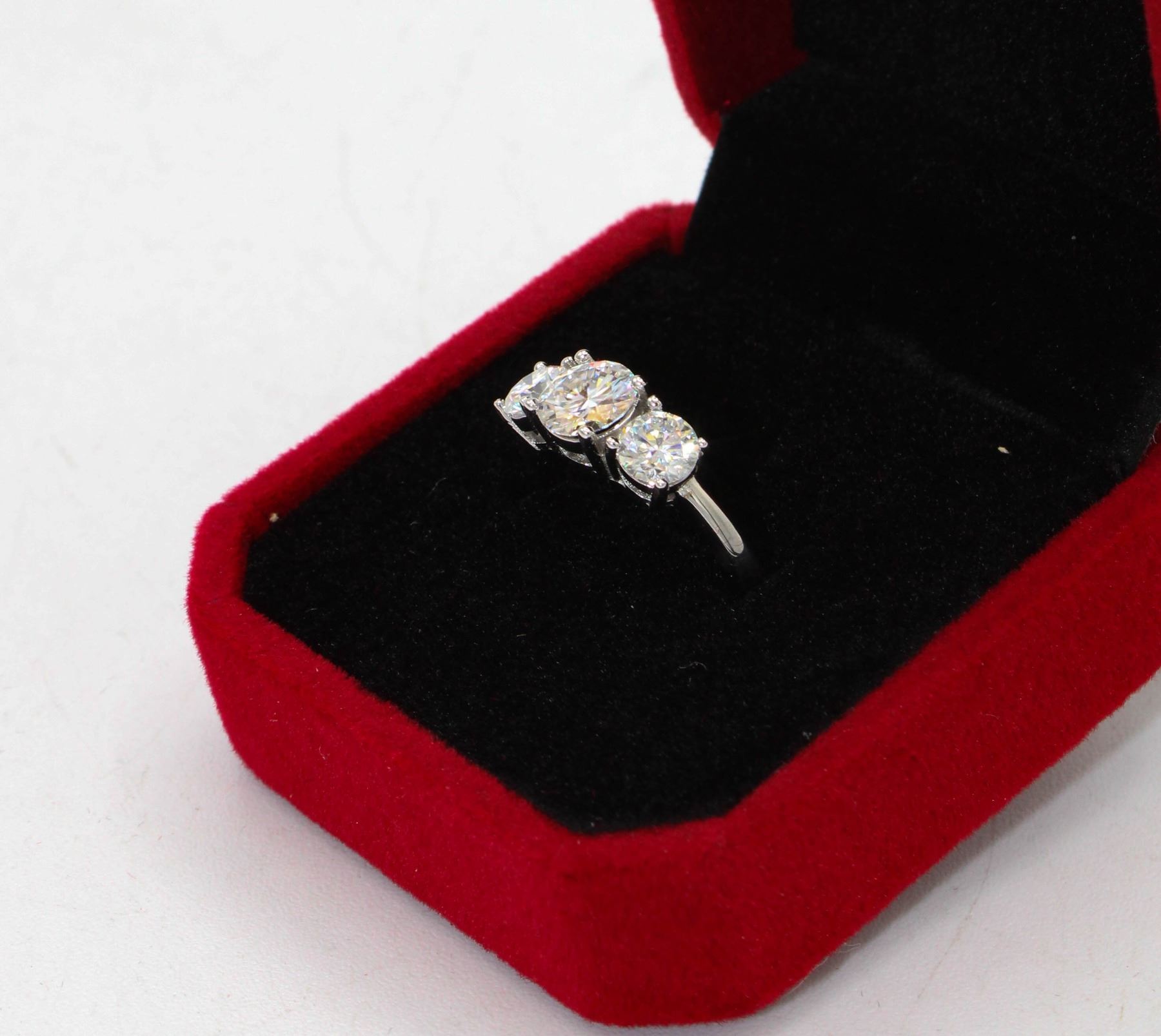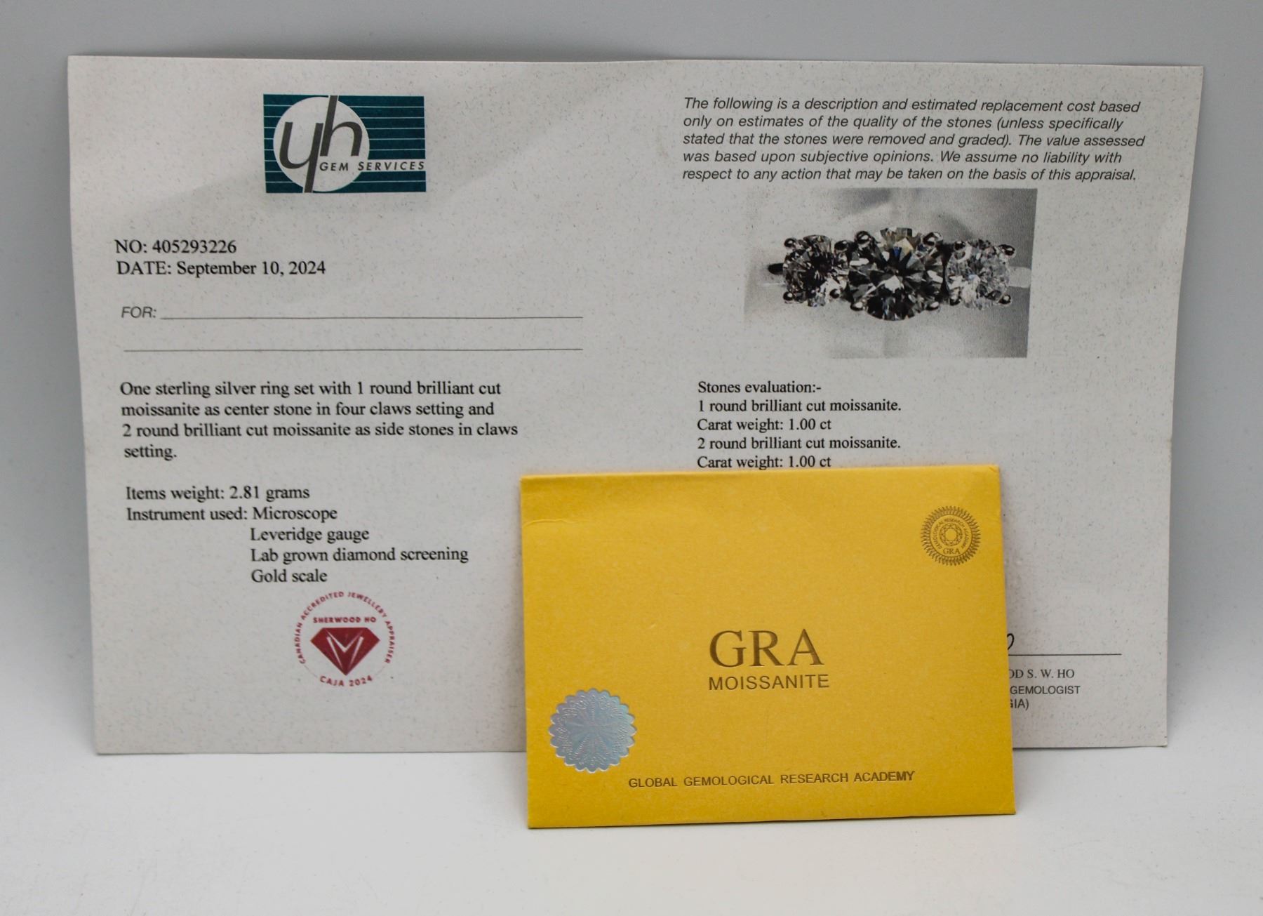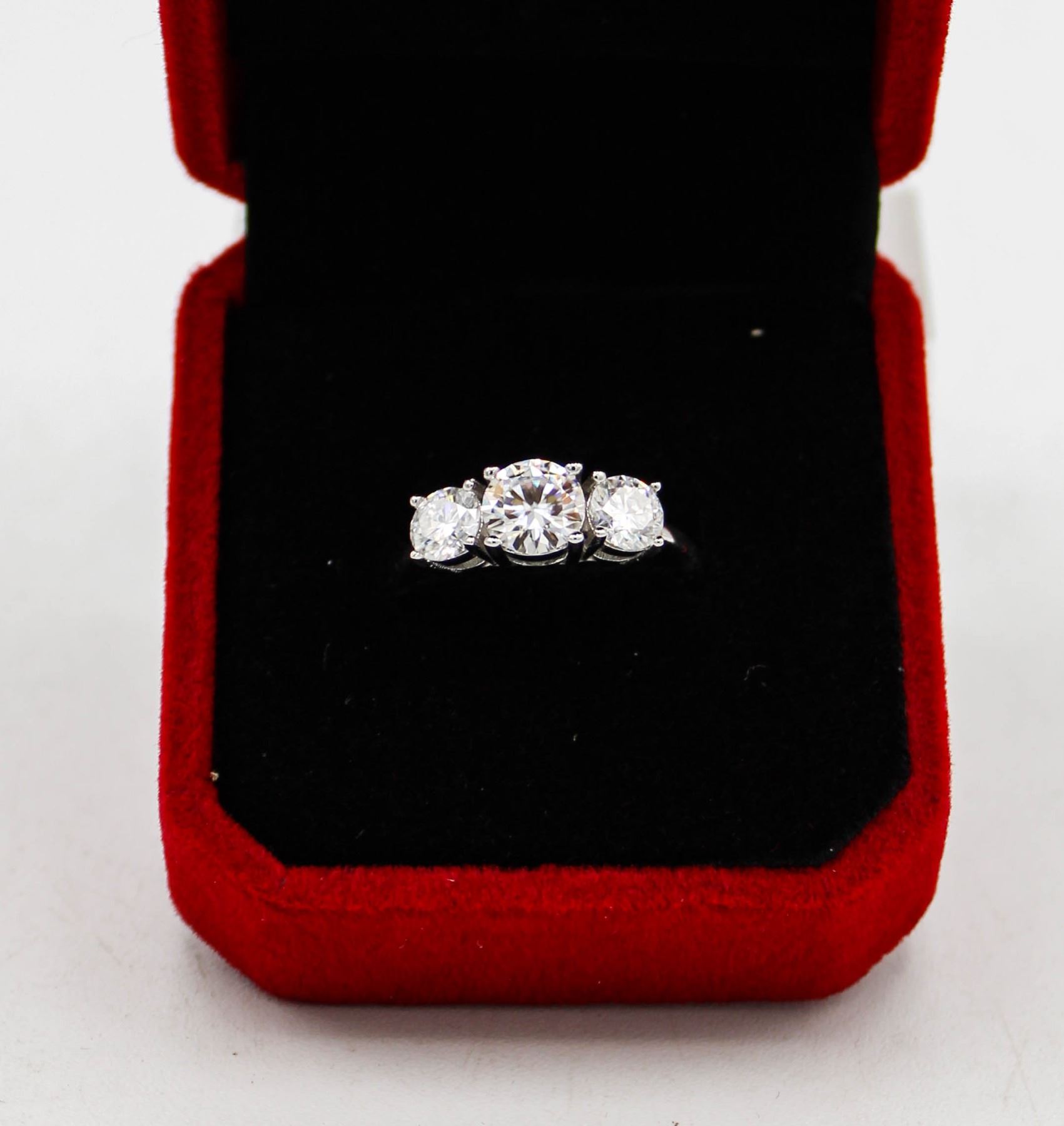 STONE VVS D COLOR WITH 1.00 CT SET IN CENTER WITH 0.50 CT SET ON EITHER SIDE SET IN 925 SILVER RING SIZE 7.5 RETAIL VALUE $975.00