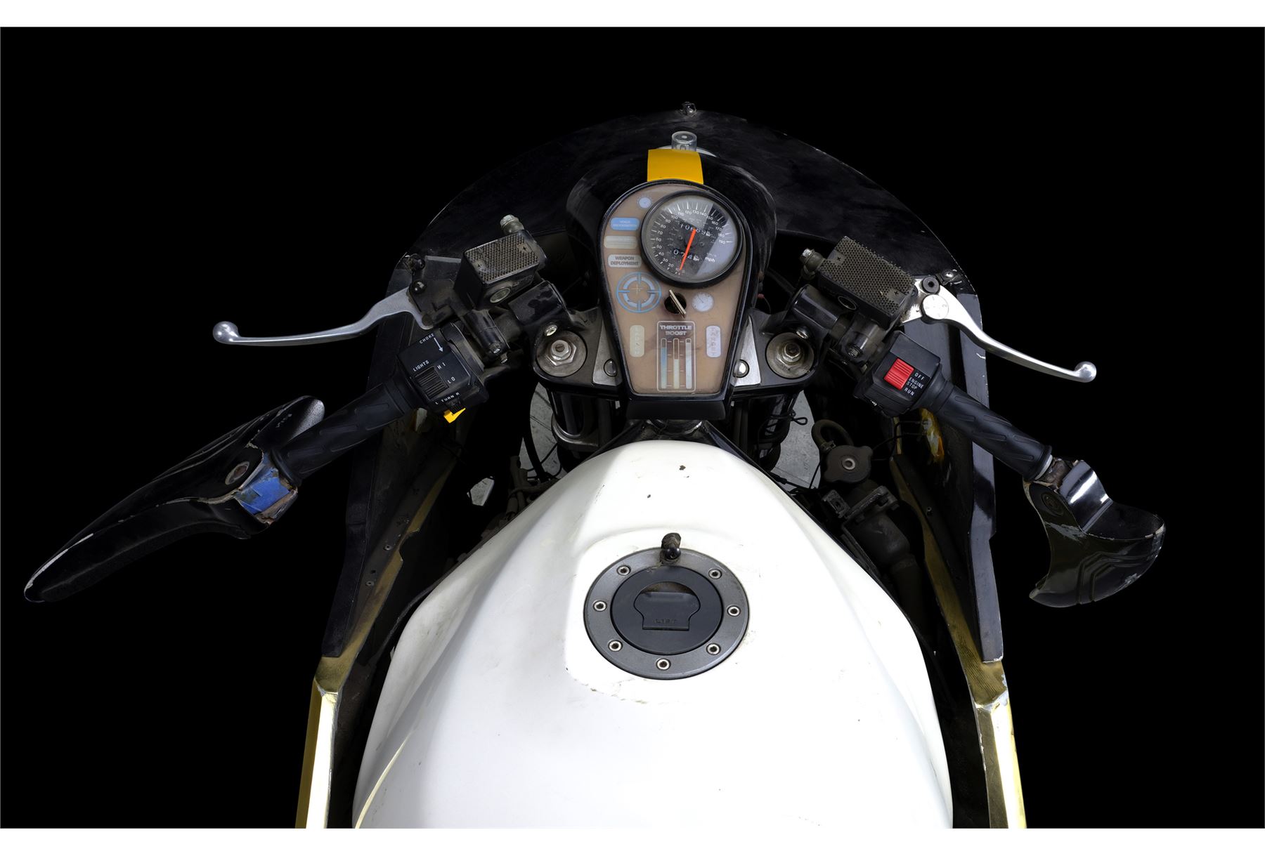 Built over a Suzuki RF900R, this yellow vector cycle features custom fiberglass body elements applied over the front and back axles and headlights, as well as gold-color stripes and futuristic symbols printed on both sides. The cycle's current functionality is unknown, and no warranty is made or implied as to this lot's road-worthiness. It exhibits scratching, scuffing, chipped paint, a build-up of grime, and a missing windscreen from production use and storage. Dimensions: 96" x 32" 45" (244 cm x 81.5 cm x 114.5 cm)