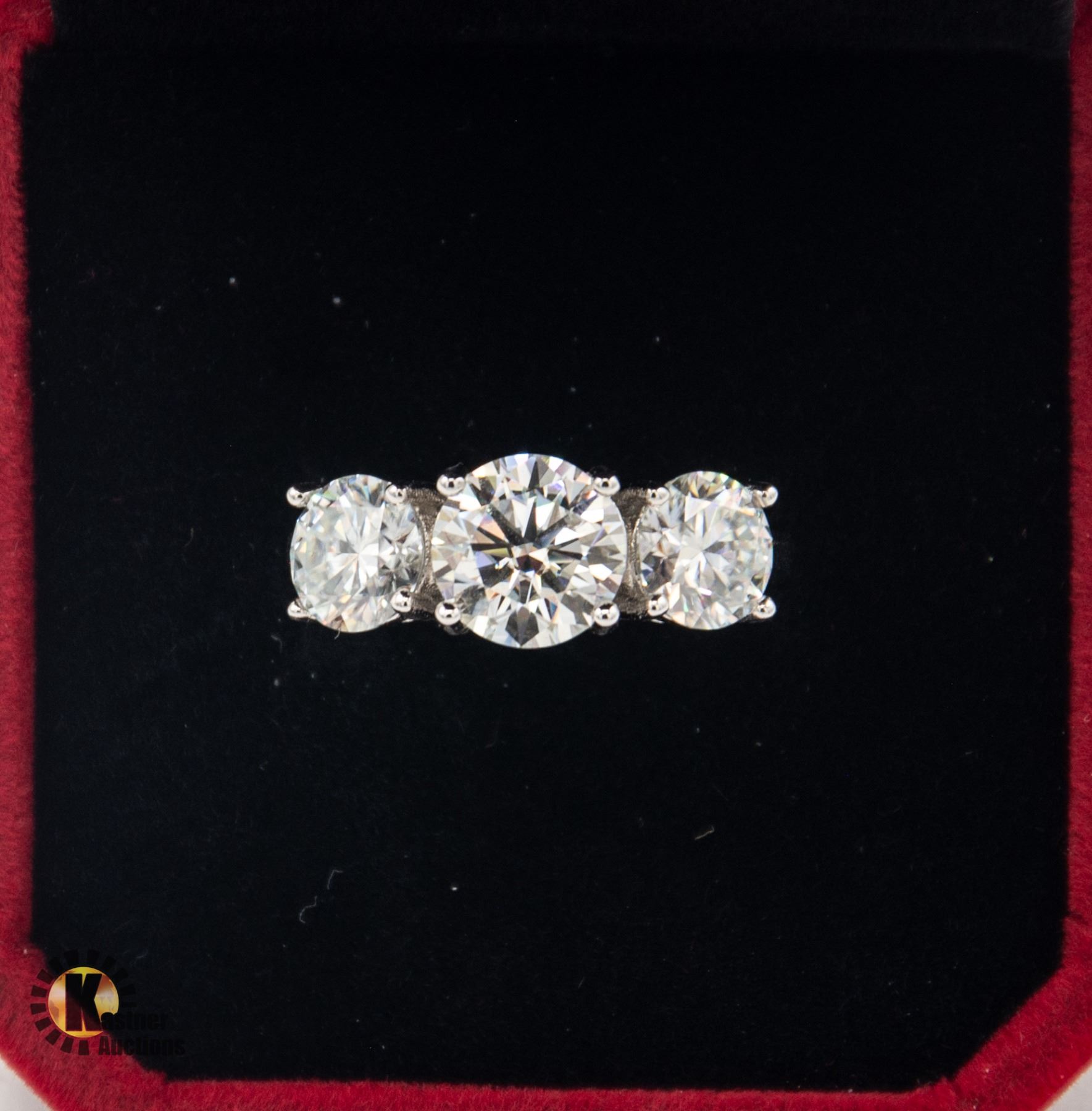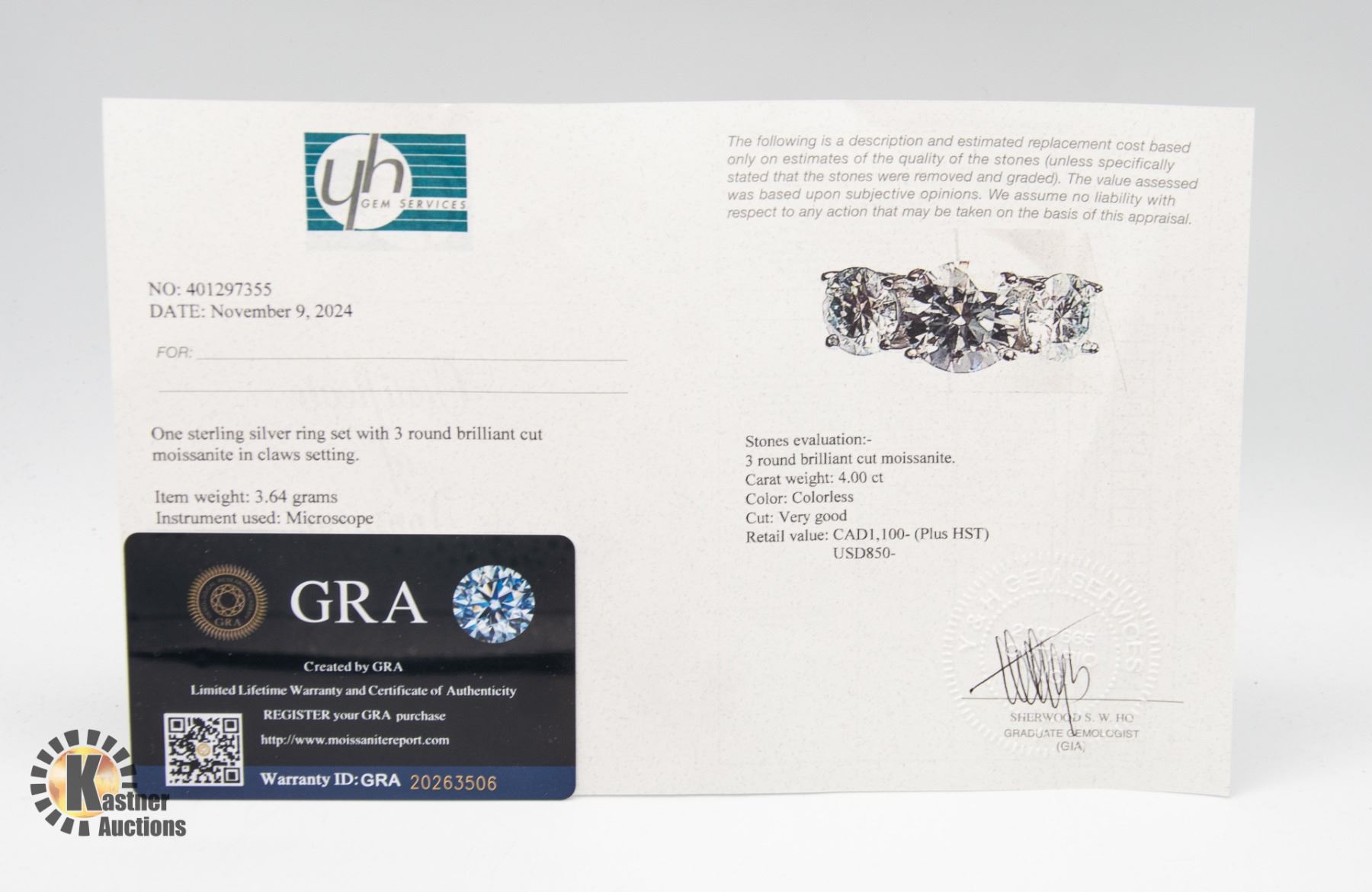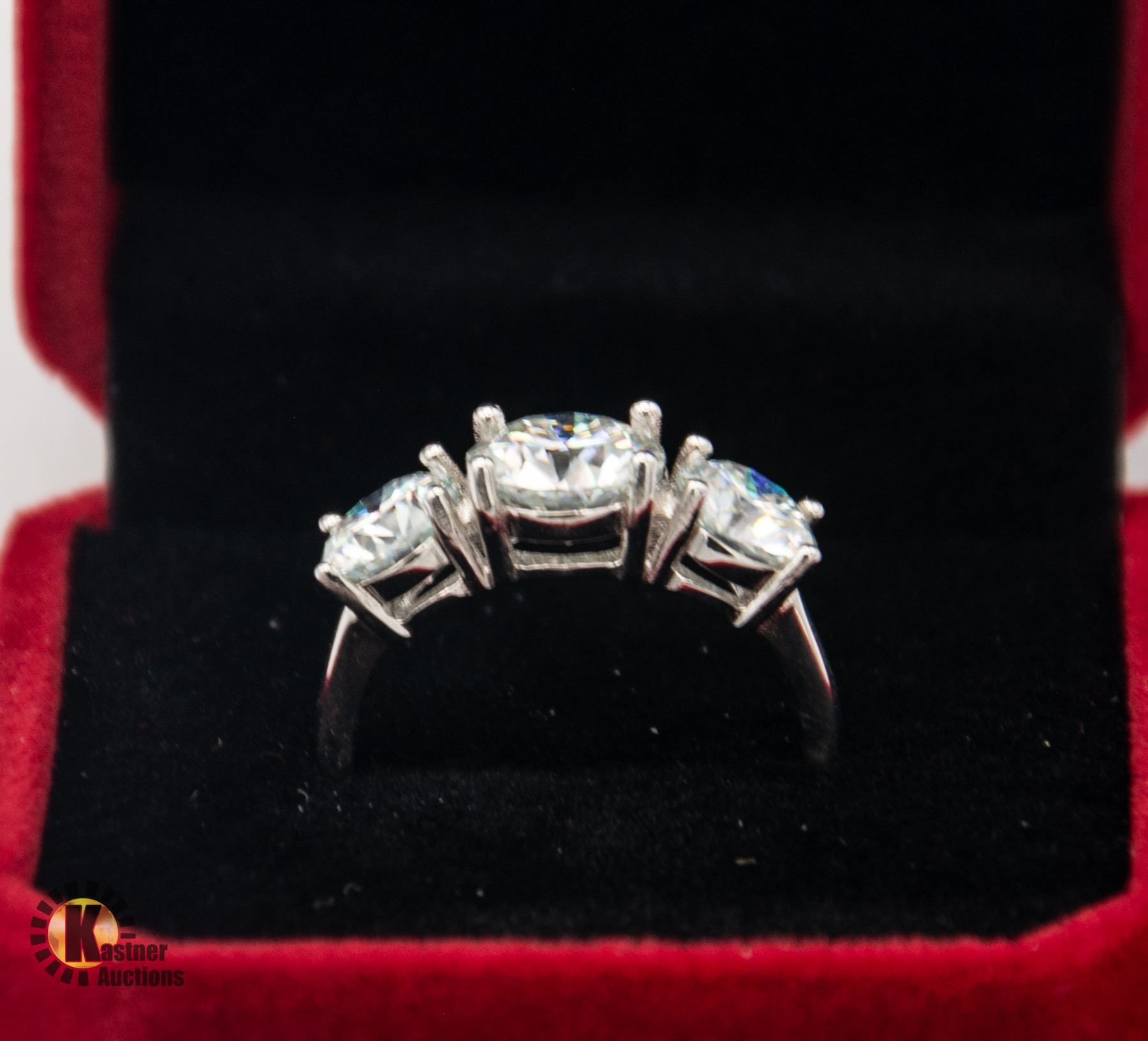 MOISSANITE STONE VVS D COLOR SET IN CENTER WITH A 2.00 CT IN CENTER AND 1.00 CT SET ON EITHER SIDE SET IN 925 SILVER RING SIZE 8 RETAIL VALUE $1,100.00 **ALL ITEMS MUST BE REMOVED BY 5PM SATURDAY, DECEMBER 21ST 2024. ALL REMAINING ITEMS WILL BE SUBJECT TO A $6.00 PER DAY STORAGE CHARGE. ANY ITEMS REMAINING AFTER MONDAY, JANUARY 6TH 2025 WILL BE CONSIDERED FORFEITED. NO REFUNDS WILL BE ISSUED FOR FORFEITED ITEMS. TO SCHEDULE A PICK UP APPOINTMENT CLICK HERE