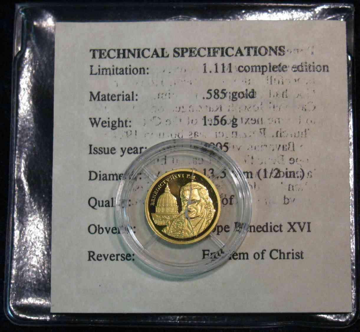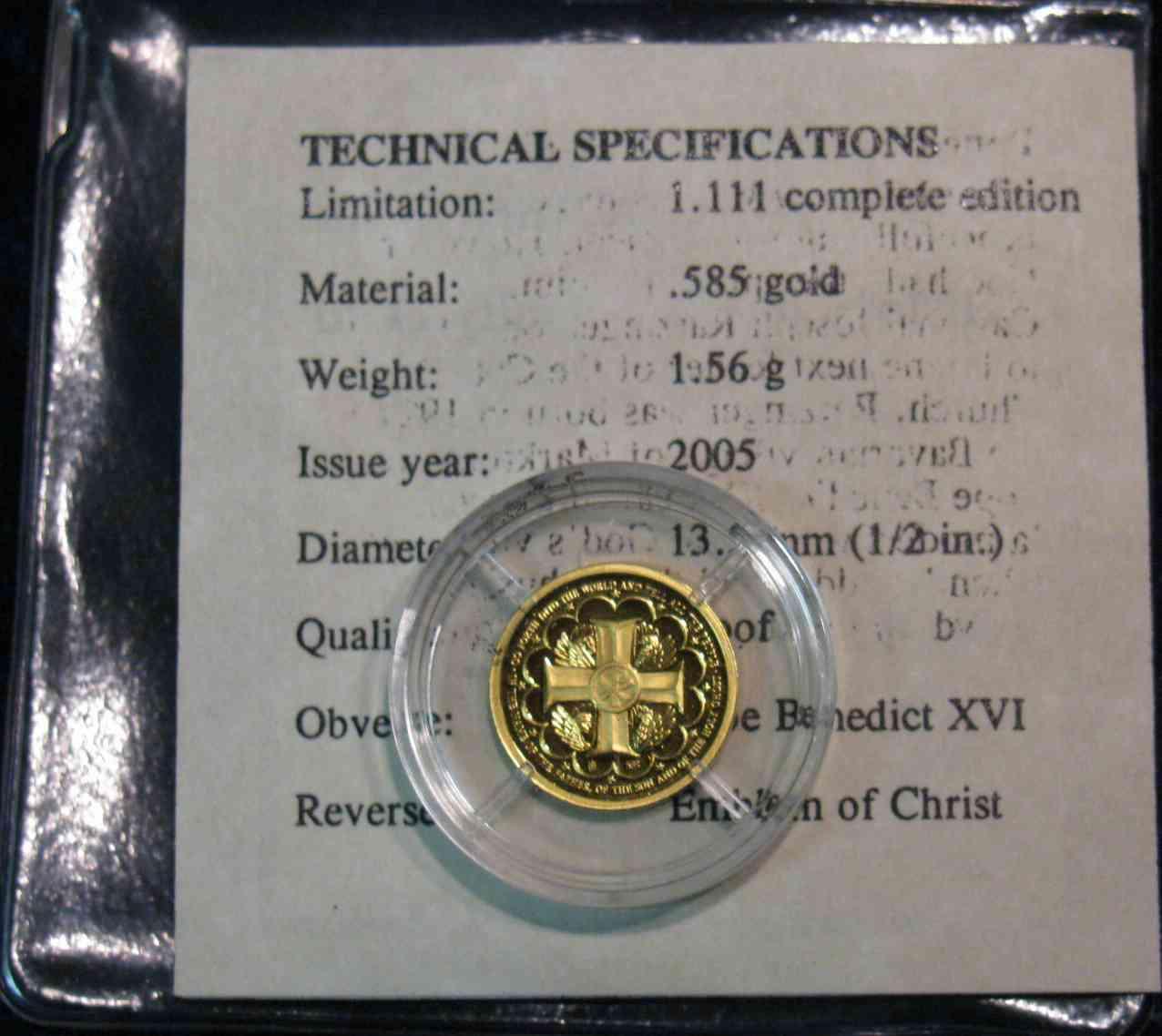 1186. 2005 History of Christianity Gold Coin. Pope Benedict XVI 1.56 Grams of .585 Fine Gold, Proof.