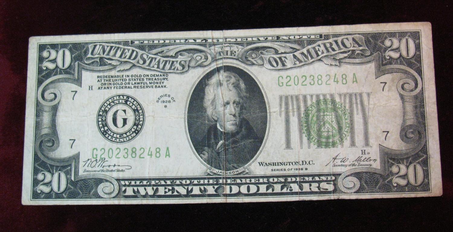 1186. Series 1928B $20 "Redeemable in Gold on Demand…" Federal Reserve Note. Signed Woods & Mellon.