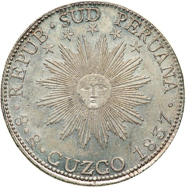Peru - South Peru. Specimen 8 Reales, 1837-BA (Cuzco). WR-19 var. (raised edge); note KM-170.1. 27.44 grams. State Coinage. Large letters "FEDERACION" type. Radiant sun face, row of stars above. Reverse: Scene of crowned fortress, volcano, and ship at sea, and cornucopia below, all within wreath. Crisp, detailed strike on choice flan. Satiny to bright fields, with excellent cartwheel luster, the devices softly lustrous to matte. Simply superb quality for this issue.
