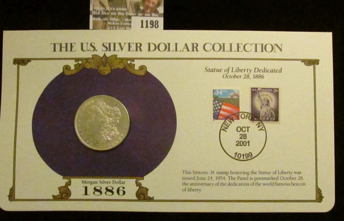 1886 P Philadelphia Mint Morgan Silver Dollar in a special protected cover with post marked commemorative cover and stamps.