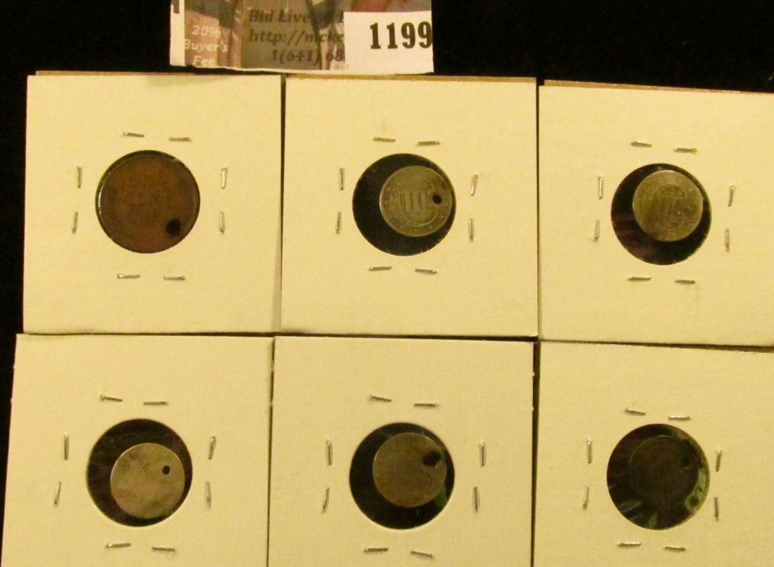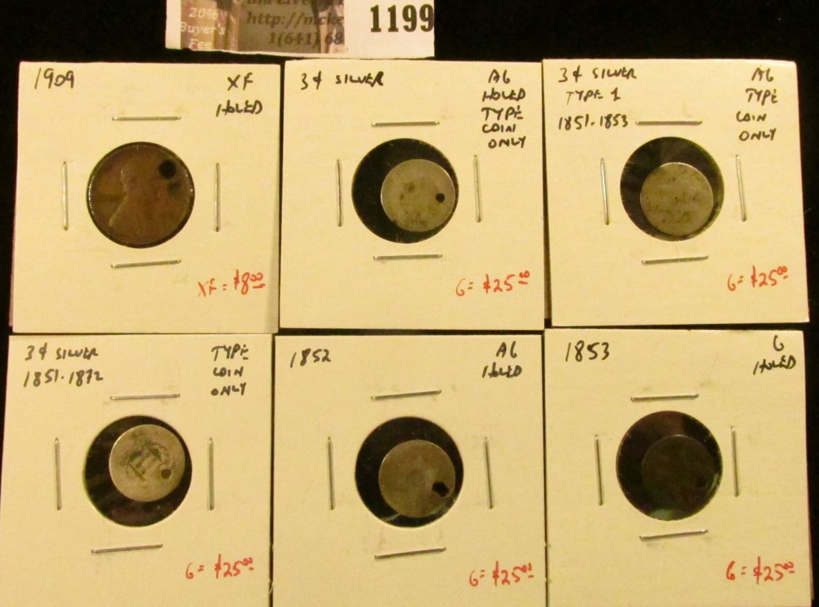 (6) damage / problem / low grade type coins, 1909 Lincoln Cent, XF holed & 5 (five) 3 Cent Silver Pieces, 3 illegible date type coins & an 1852 & 1853, bot holed. Bid accordingly, problem free group value $130+