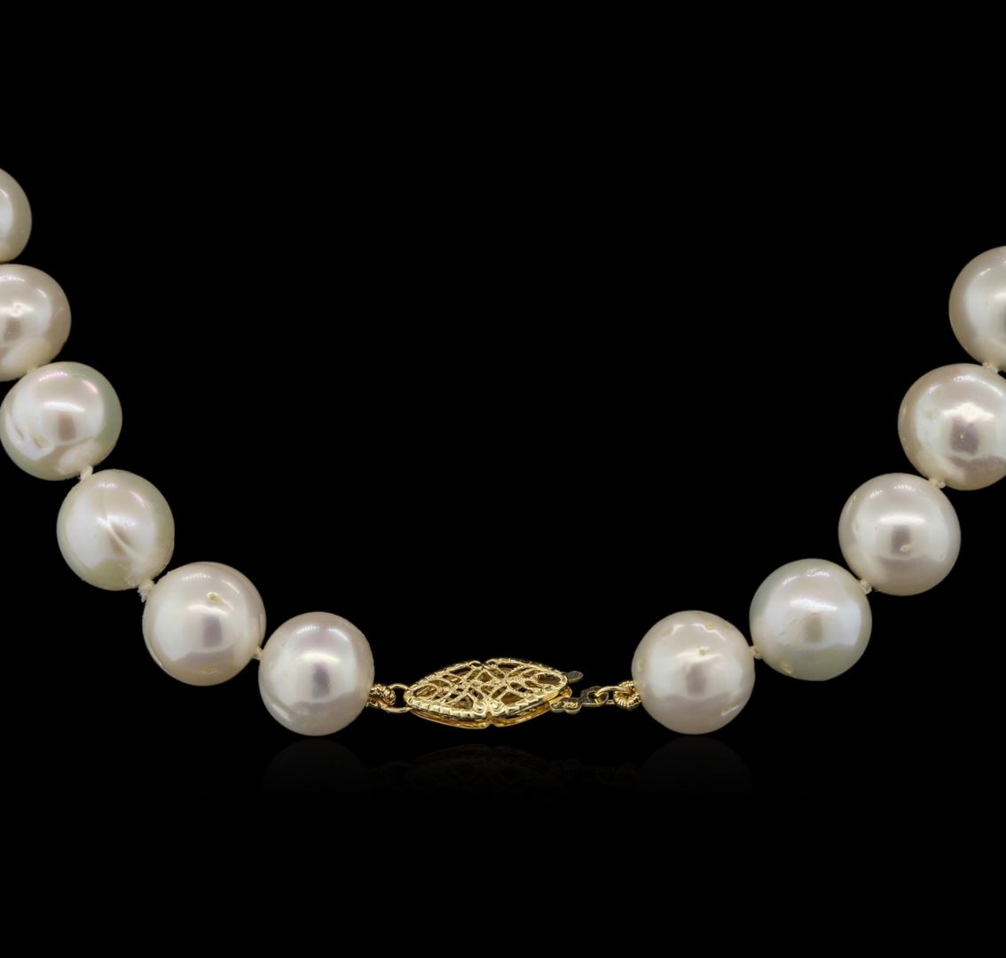 One freshwater pearl necklace completed by a 14KT yellow gold clasp. The pearls measure approximately 11mm.