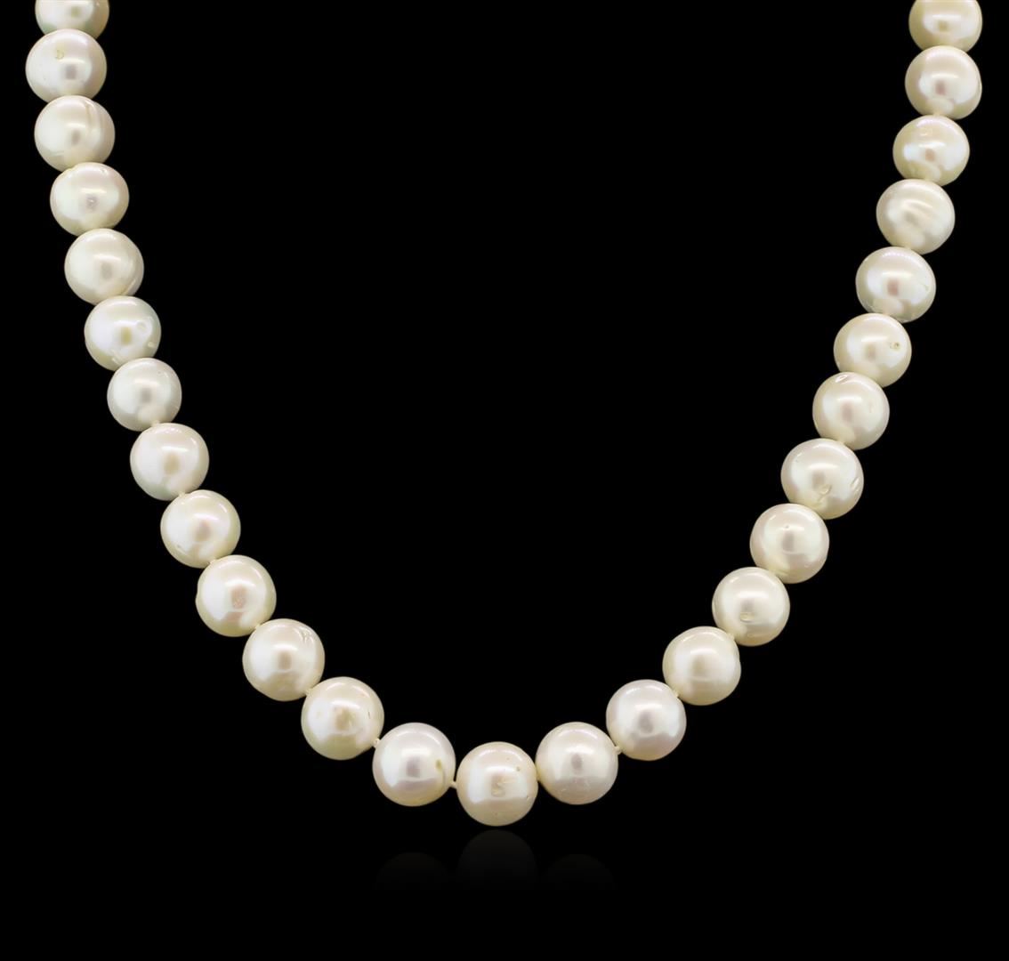 One freshwater pearl necklace completed by a 14KT yellow gold clasp. The pearls measure approximately 11mm.