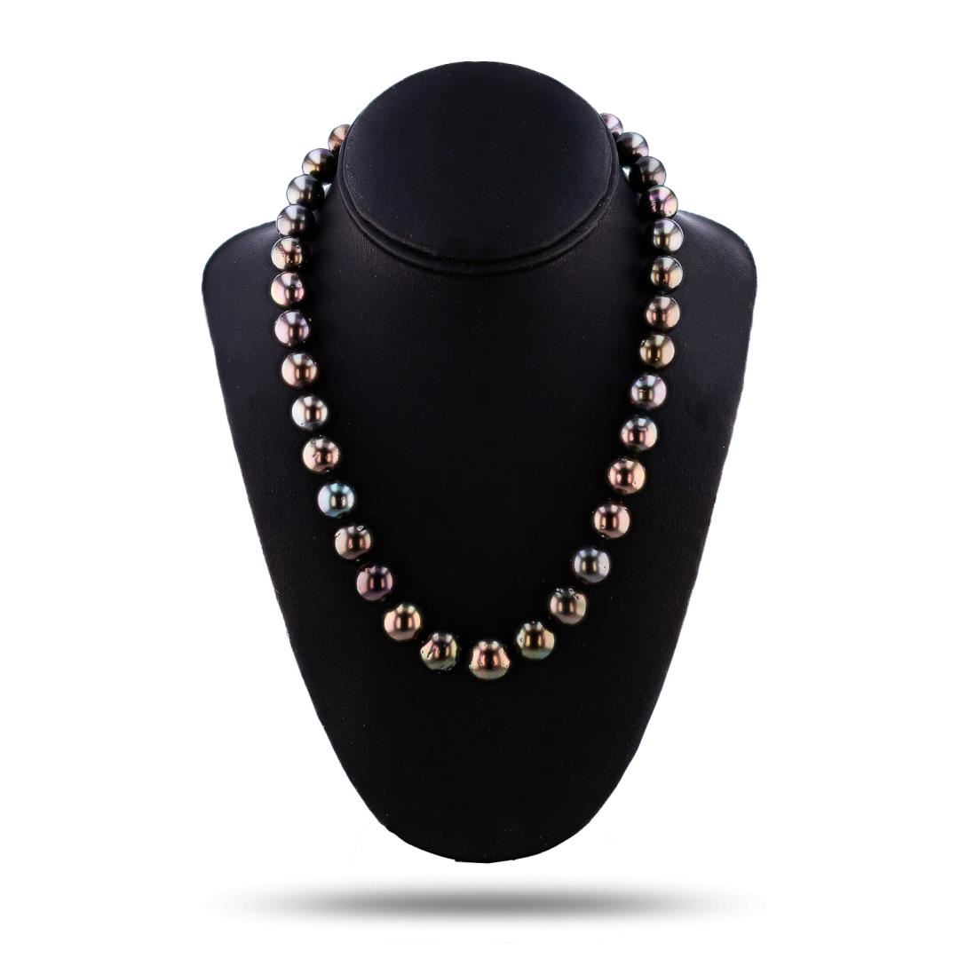 One graduated, single strand Cultured Tahitian Pearl necklace. The strand has each pearl individually hand knotted and measures 17.5 inches in length. The necklace is finished with a scalloped 14K white gold plunger style bead clasp. #MAIN GEMSTONES# Identity: Tahitian Pearl Species: Cultured Pearl Shape: Round Quantity: 35 Pearls Measurements: 11 - 14mm Body Color: Very Dark Gray Overtone: Pinkish Purple Luster: Excellent Matching: Good Surface Grade: Lightly to Moderately Spotted Refractive Index: 1.530 - 1.685 DR Birefringence: 0.155 Specific Gravity: 2.72 - 2.78 #35 TAHITIAN PEARLS: 11 - 14mm WEIGHT OF ITEM: 85.8 grams GOLD CONTENT: 14K White Gold Size: 17 1/2