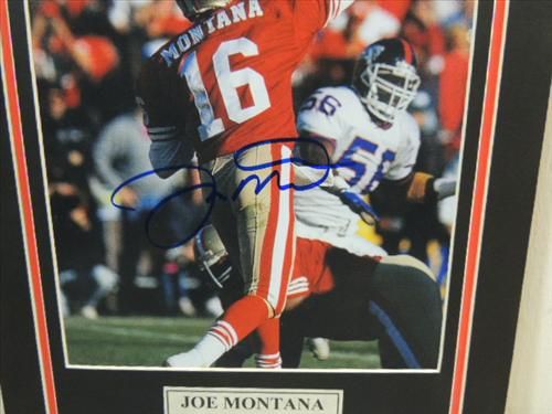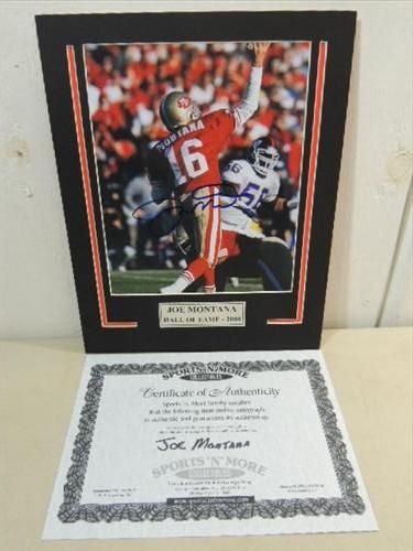 11X14 FOOTBALL PHOTO AUTOGRAPHED JOE MONTANA COA. INCLUDES COA FROM SPORTS N MORE. AS SHOWN. VIEW PICTURE FOR DETAIL. PLEASE BE ADVISED, AND INFORMED REGARDING SIGNATURES OR AUTOGRAPHS THAT WE SELL AT AUCTION: WE ARE NOT AUTHENTICATORS, AND WE DO NOT AUTHENTICATE, OR VALIDATE ANY AUTOGRAPHS OR SIGNATURES THAT WE OFFER AT AUCTION. SOME AUTOGRAPHS OR SIGNATURES MAY COME WITH AN AUTHENTICATION FROM ANY ONE OF LITERALLY HUNDREDS OF AUTHENTICATORS ACROSS THE COUNTRY, AND AROUND THE WORLD. WE DO NOT ENDORSE ANY AUTHENTICATOR, NOR DO WE GUARANTEE THAT ANY AUTOGRAPH OR SIGNATURE IS AUTHENTIC, OR THAT IT WILL PASS AUTHENTICATION BY ANY AUTHENTICATOR. ALL AUTOGRAPHS OR SIGNATURES ARE SOLD