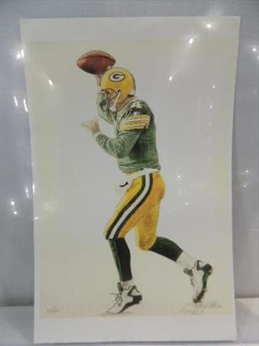 11X17 FOOTBALL ARTIST PROOF, LARRY PETERSON, BRETT FARVE, SIGNED & NUMBERED. GREEN BAY PACKERS. AS SHOWN. VIEW PICTURE FOR DETAIL.