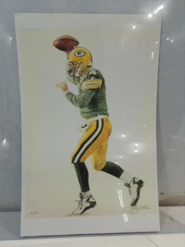 11X17 FOOTBALL ARTIST PROOF, LARRY PETERSON, BRETT FARVE, SIGNED & NUMBERED. GREEN BAY PACKERS. AS SHOWN. VIEW PICTURE FOR DETAIL.