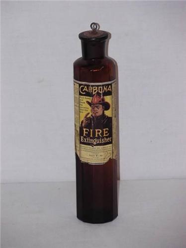 11" AMBER GLASS CARBONA FIRE EXTINGUISHER W/ ORIGINAL PAPER LABEL - LOSSES TO LABEL;