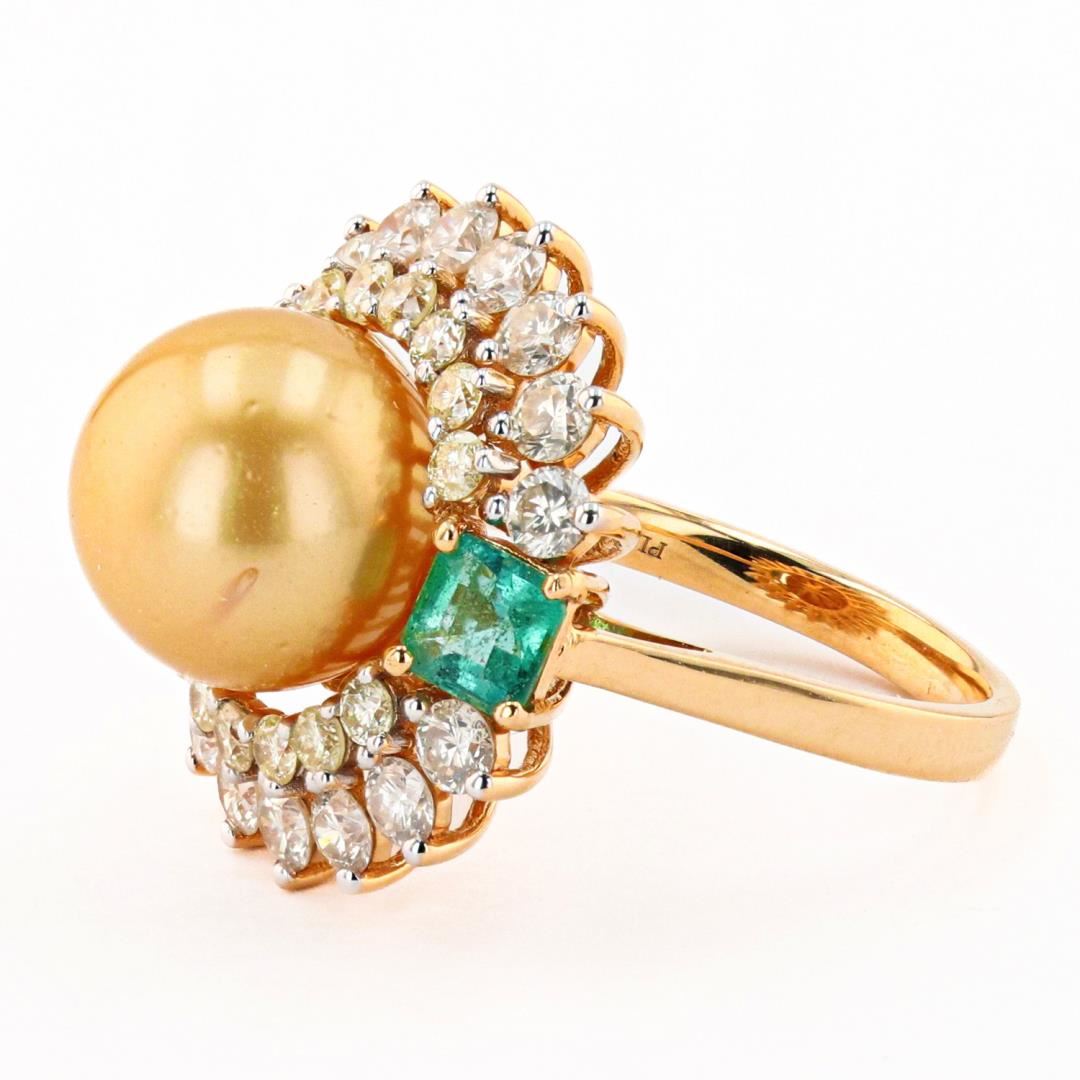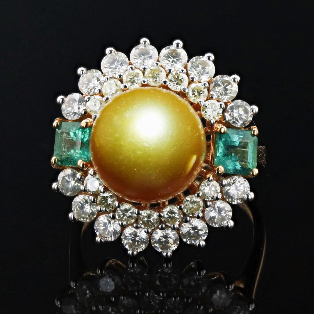 18K Gold South Sea Pearl, Emerald & Diamond Ring one polished, stamped, and tested I8K yellow gold ring marked Oscar briedman. I he ring is mounted with: I genuine cultured South Sea Pearl, 2 genuine faceted emeralds weighing approximately 0.80 carats, and 30 genuine round diamonds weighing approximately 1.83 carats. This item weighs 8.1 grams, condition is new, excellent workmanship #MAIN GEMSTONE# Identity: South Sea Pearl Species: Cultured Pearl Shape: Round Quantity: 1 South Sea Pearl Measurements: 11mm Body Color: Gold Overtone: Light Pink Surface Grade: Lightly Spotted Luster: Excellent Refractive Index: 1.530 - 1.685 DR Birefringence: 0.15 Specific Gravity: 2.72 - 2.78 #ADJACENT GEMSTONES ON RING# Identity: Natural Diamond Shape: Round Cutting Style: Brilliant Cut Quantity: 30 Diamonds Measurements: 2.0 - 2.8mm Total Weight: 1.83 carats Clarity Grade: VS2 - SI1 Color Grade: G - H Refractive Index: 2.417 Hardness: 10 #ADJACENT GEMSTONES ON RING# Species: Natural Beryl Variety: Emerald Shape: Square Cut Cornered Cutting Style: Step Cut Quantity: 2 Emeralds Measurements: 4 x 4mm Total Weight: 0.80 carats Color: Green Refractive Index: 1.564 - 1.595 DR Birefringence: 0.005 to 0.009 Hardness: 7.5 - 8 SOUTH SEA PEARL: 11mm TOTAL EMERALD WEIGHT: 0.80 cts TOTAL DIAMOND WEIGHT: 1.83 cts WEIGHT OF ITEM: 8.1 grams GOLD CONTENT: 18K Yellow Gold Size: 6 3/4