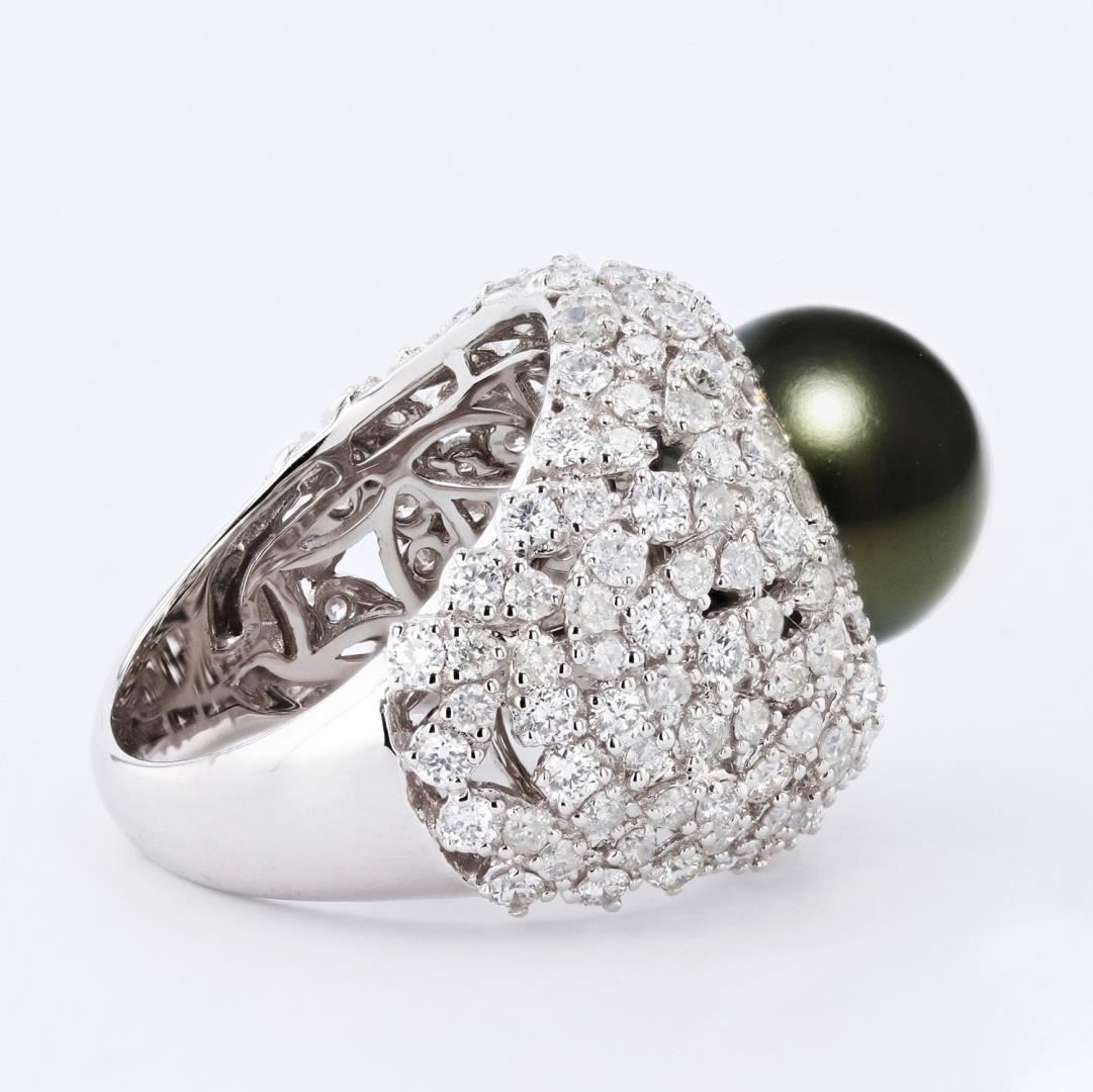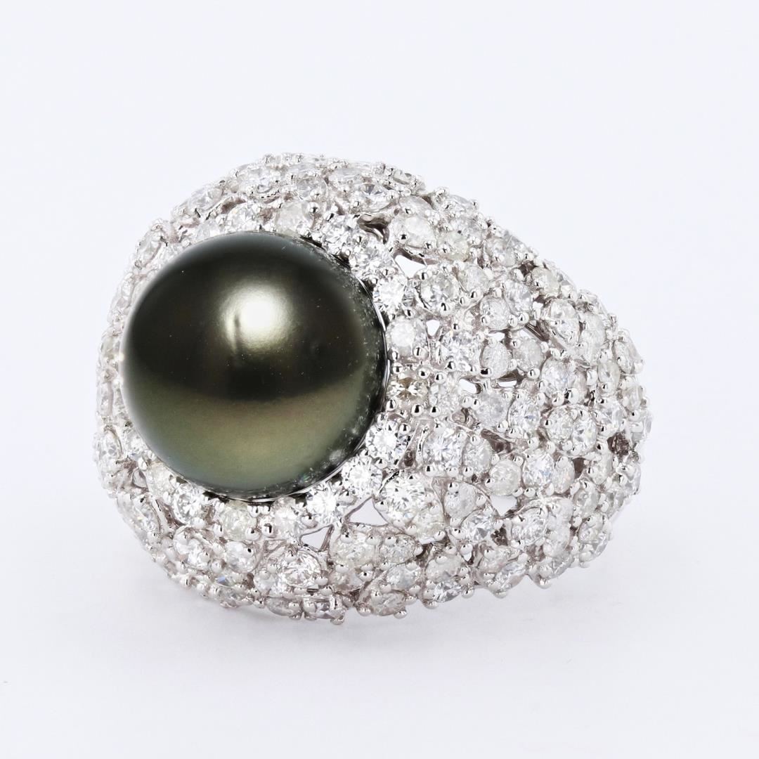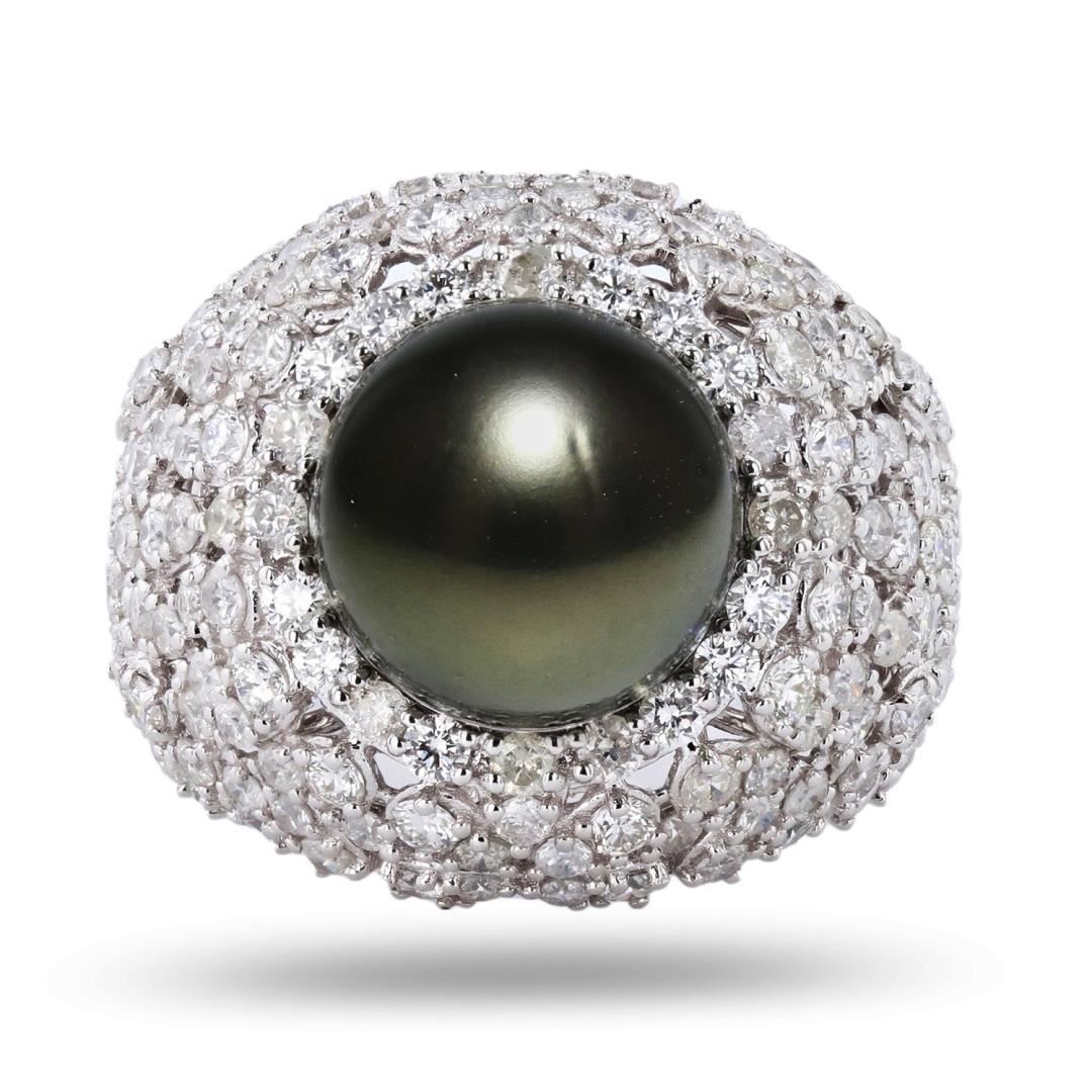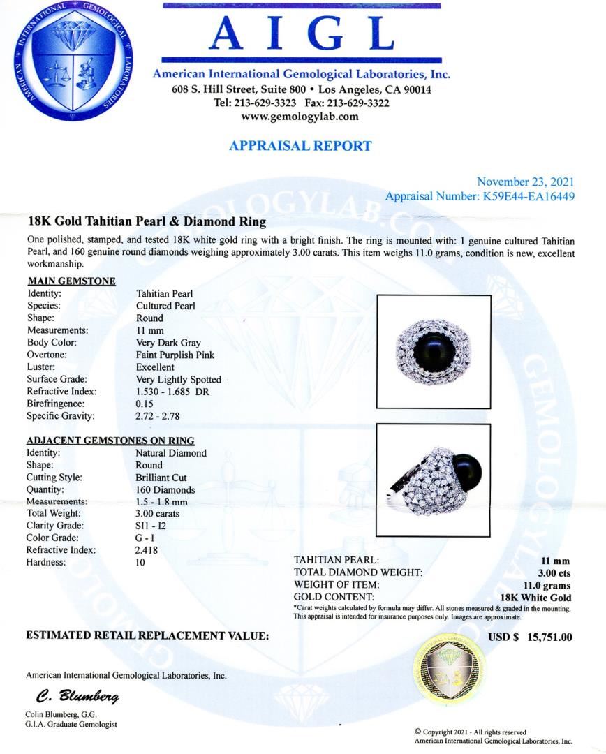 One polished, stamped, and tested 18K white gold ring with a bright finish. The ring is mounted with: 1 genuine cultured Tahitian Pearl, and 160 genuine round diamonds weighing approximately 3.00 carats. This item weighs 11.0 grams, condition is new, excellent workmanship. MAIN GEMSTONE Identity: Tahitian Pearl Species: Cultured Pearl Shape: Round Measurements: 11mm Body Color: Very Dark Gray Overtone: Faint Purplish Pink Luster: Excellent Surface Grade: Very Lightly Spotted Refractive Index: 1.530 - 1.685 DR Birefringence: 0.15 Specific Gravity: 2.72 - 2.78 ADJACENT GEMSTONES ON RING Identity: Natural Diamond Shape: Round Cutting Style: Brilliant Cut Quantity: 160 Diamonds Measurements: 1.5 - 1.8mm Total Weight: 3.00 carats Clarity Grade: SI1 to I2 Color Grade: G - I Refractive Index: 2.418 Hardness: 10 TAHITIAN PEARL: 11mm TOTAL DIAMOND WEIGHT: 3.00ctw WEIGHT OF ITEM: 11.0 grams GOLD CONTENT: 18K White Gold #Size: 6 1/2