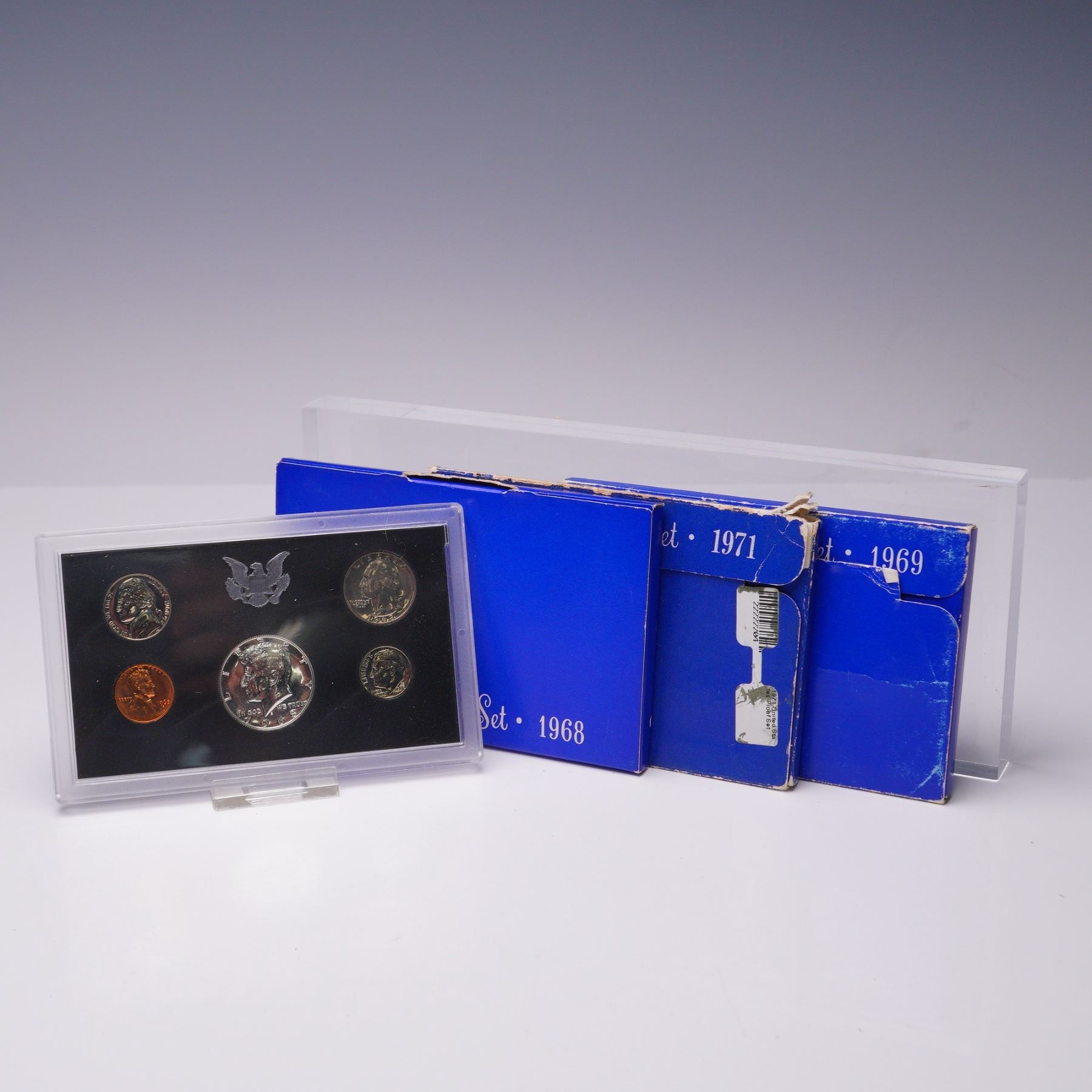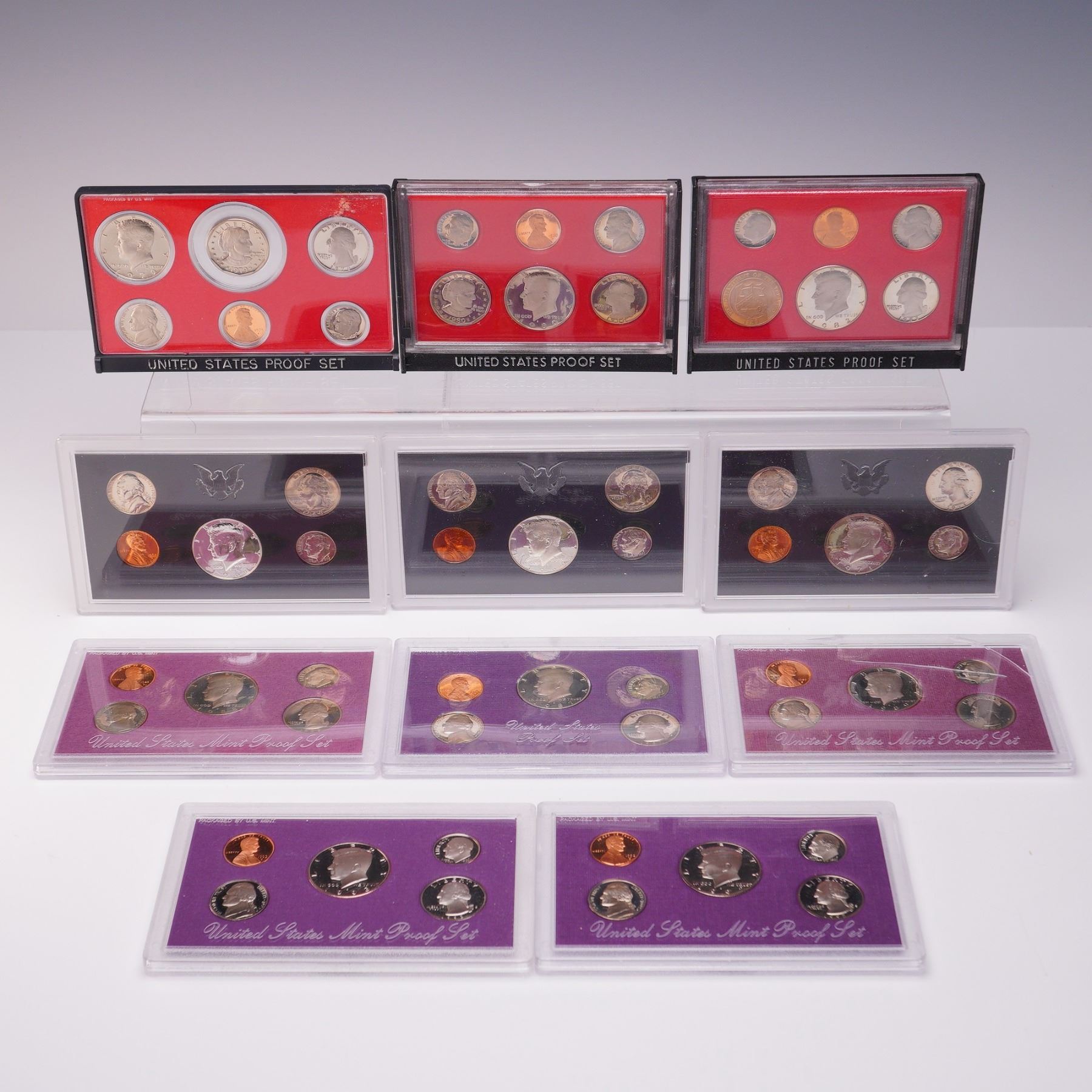 United States Mint Proof Sets collection containing eleven individual sets dated from 1968 to 1993. Each set includes the standard circulating denominations for its respective year, struck in proof quality with sharp details and mirrored fields. The included years are 1968, 1969, 1971, 1980, 1982, 1987, 1988, 1989, 1992, and 1993. The coins are sealed in their original U.S. Mint packaging, which varies by year and includes blue, black, and purple holders. Each set includes a Lincoln Cent, Jefferson Nickel, Roosevelt Dime, Washington Quarter, and Kennedy Half Dollar. United State Mint box: 5.5"L x 3.5"W x 0.5"H.