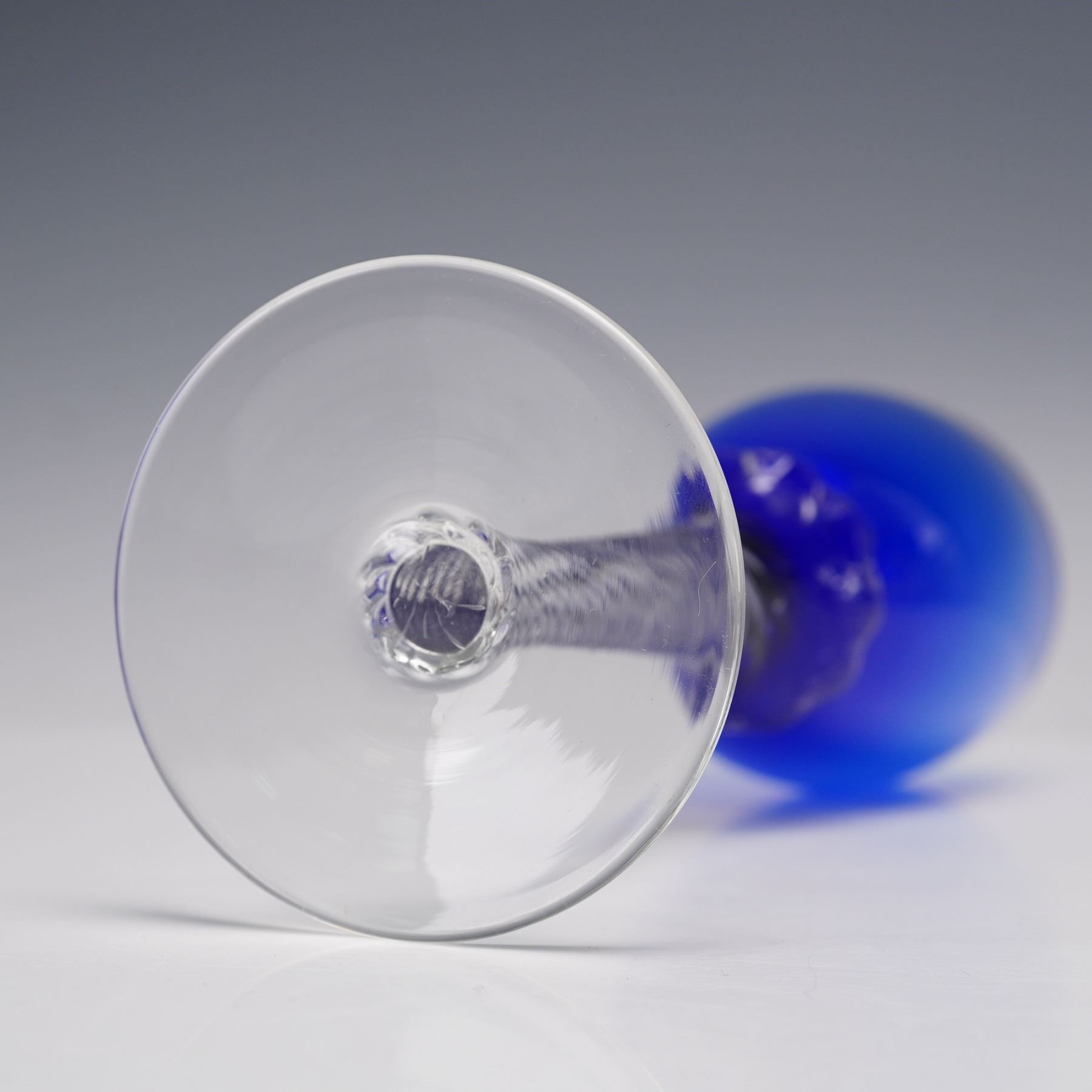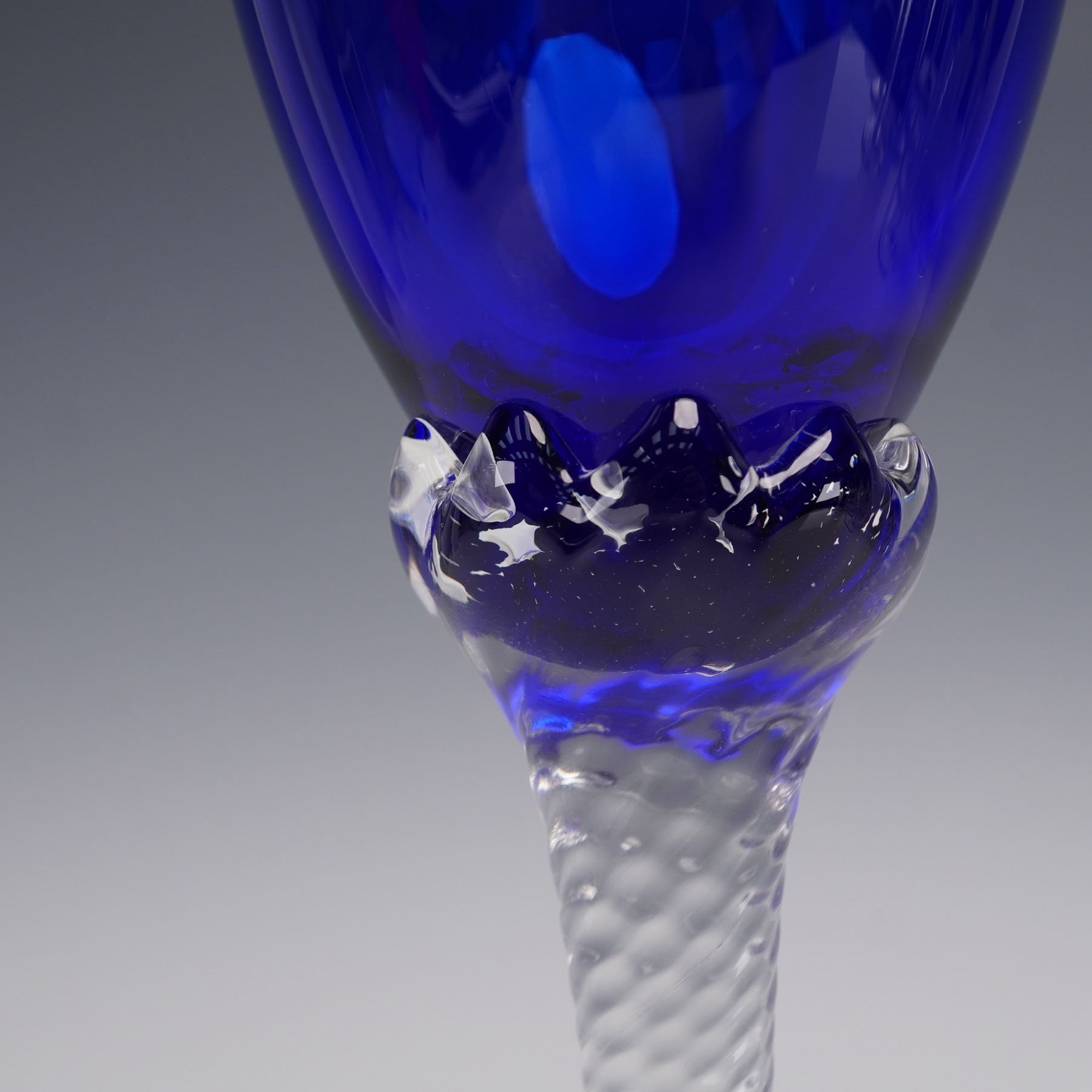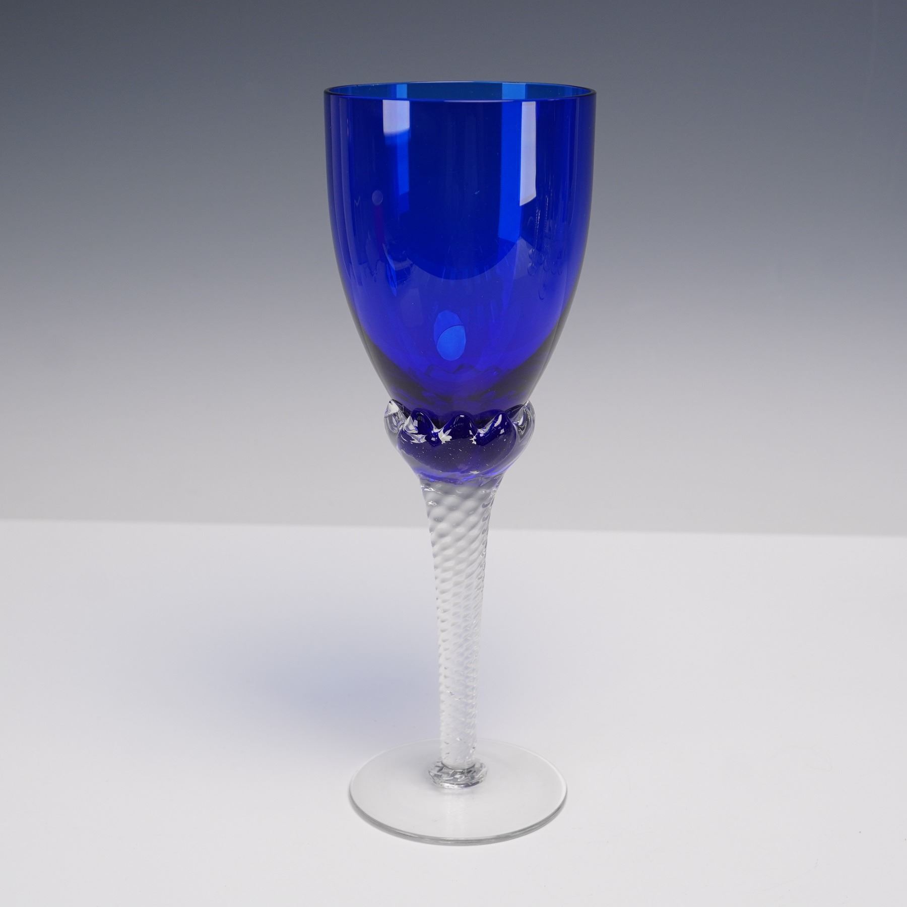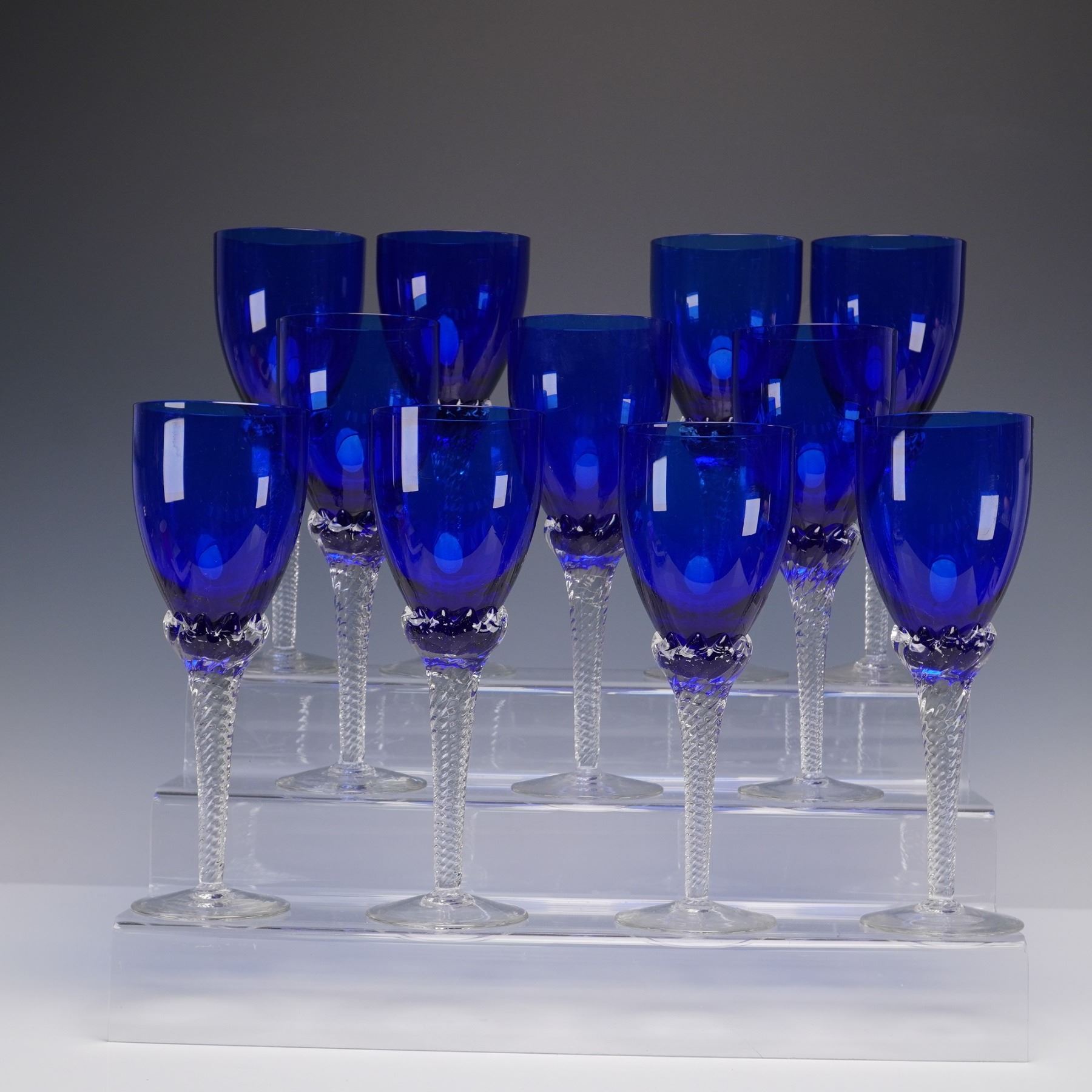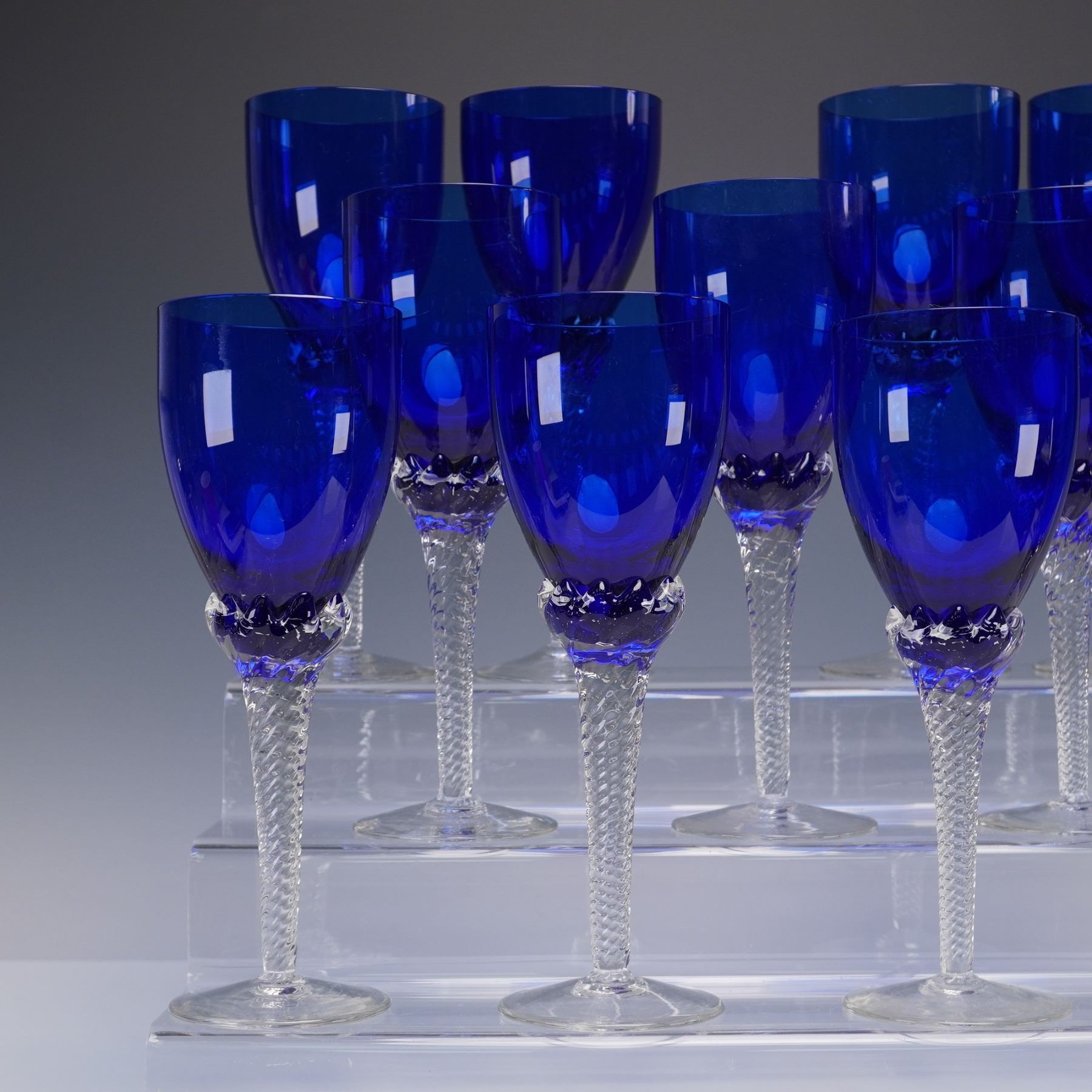 A set of 11 cobalt blue crystal wine glasses, each featuring a deep blue bowl atop a clear stem with an intricate twist design and a plain circular foot. The rich coloration of the bowl contrasts beautifully with the precision-cut stem, giving each piece an elegant and striking presence.