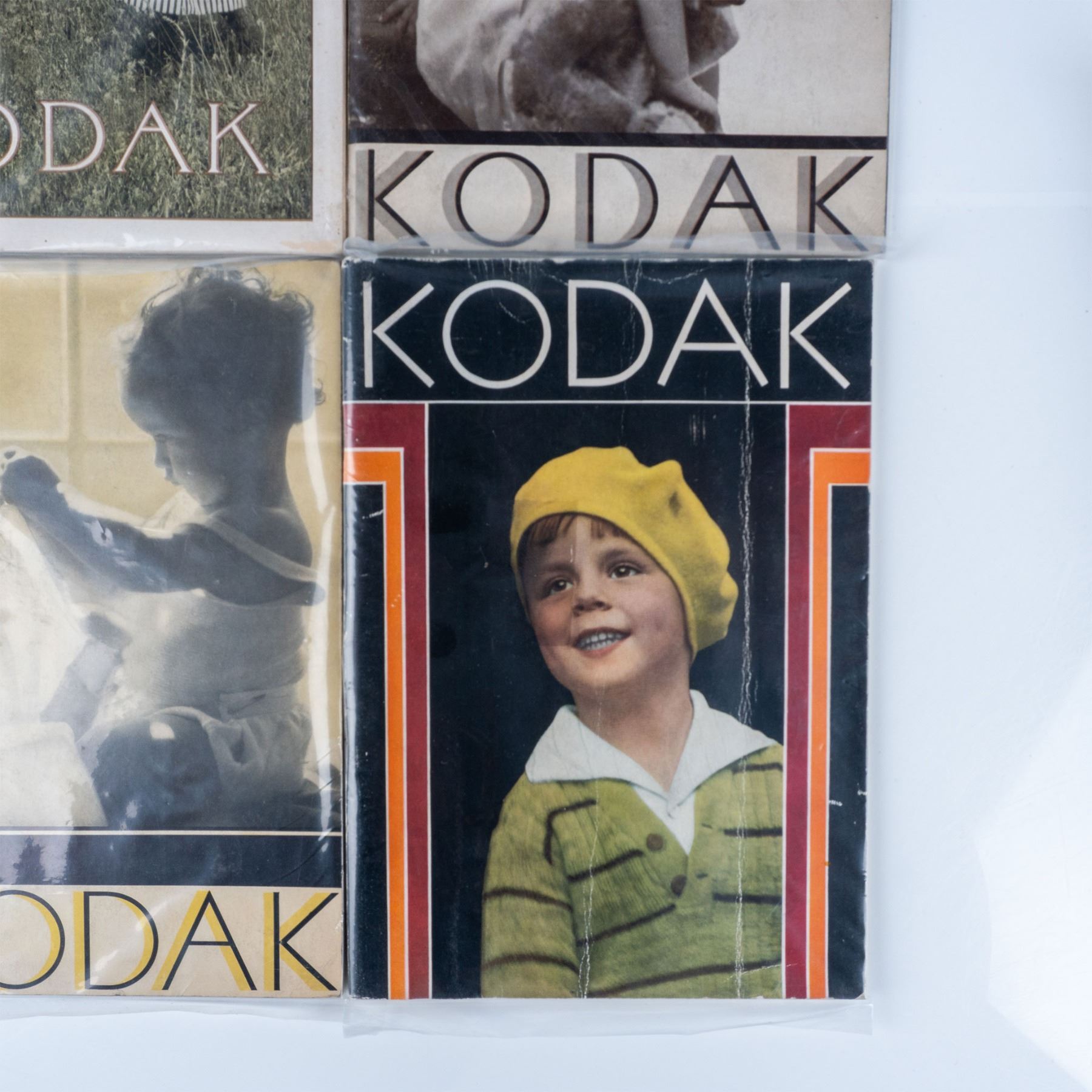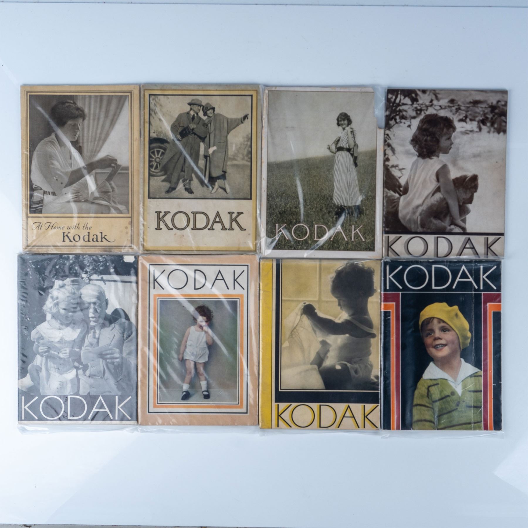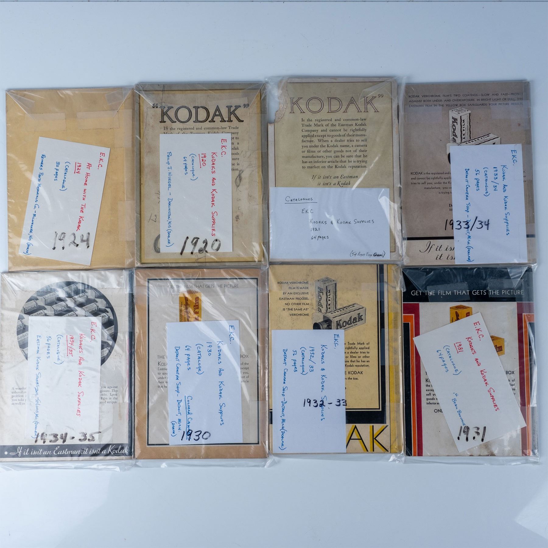 This lot features a curated collection of Kodak catalogs spanning the years 1924 to 1934, showcasing the evolution of Kodak's marketing and product offerings during the interwar period. The set includes titles such as At Home with the Kodak (1924) and various editions of Kodaks and Kodak Supplies from 1920 through 1934. These catalogs provide historical insights into photographic equipment, film development, and advertising trends of the era. Each piece is meticulously preserved in protective sleeves, with notes detailing the year and content highlights. Each catalog measures approximately: 7.75"H.