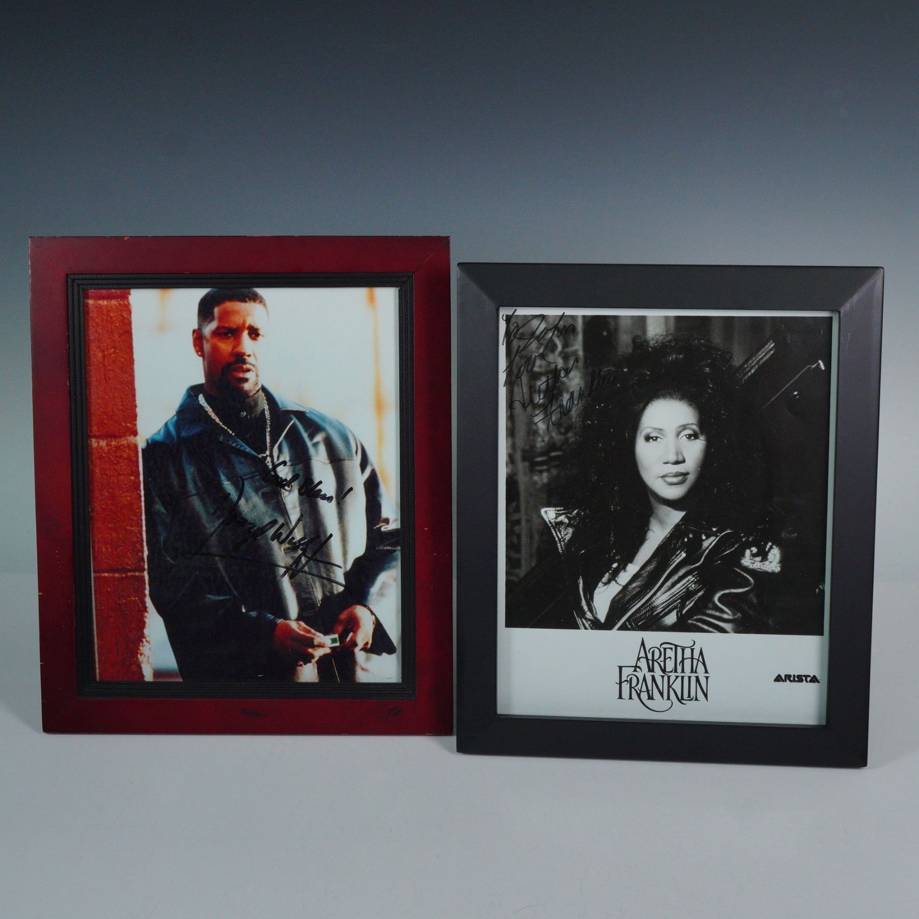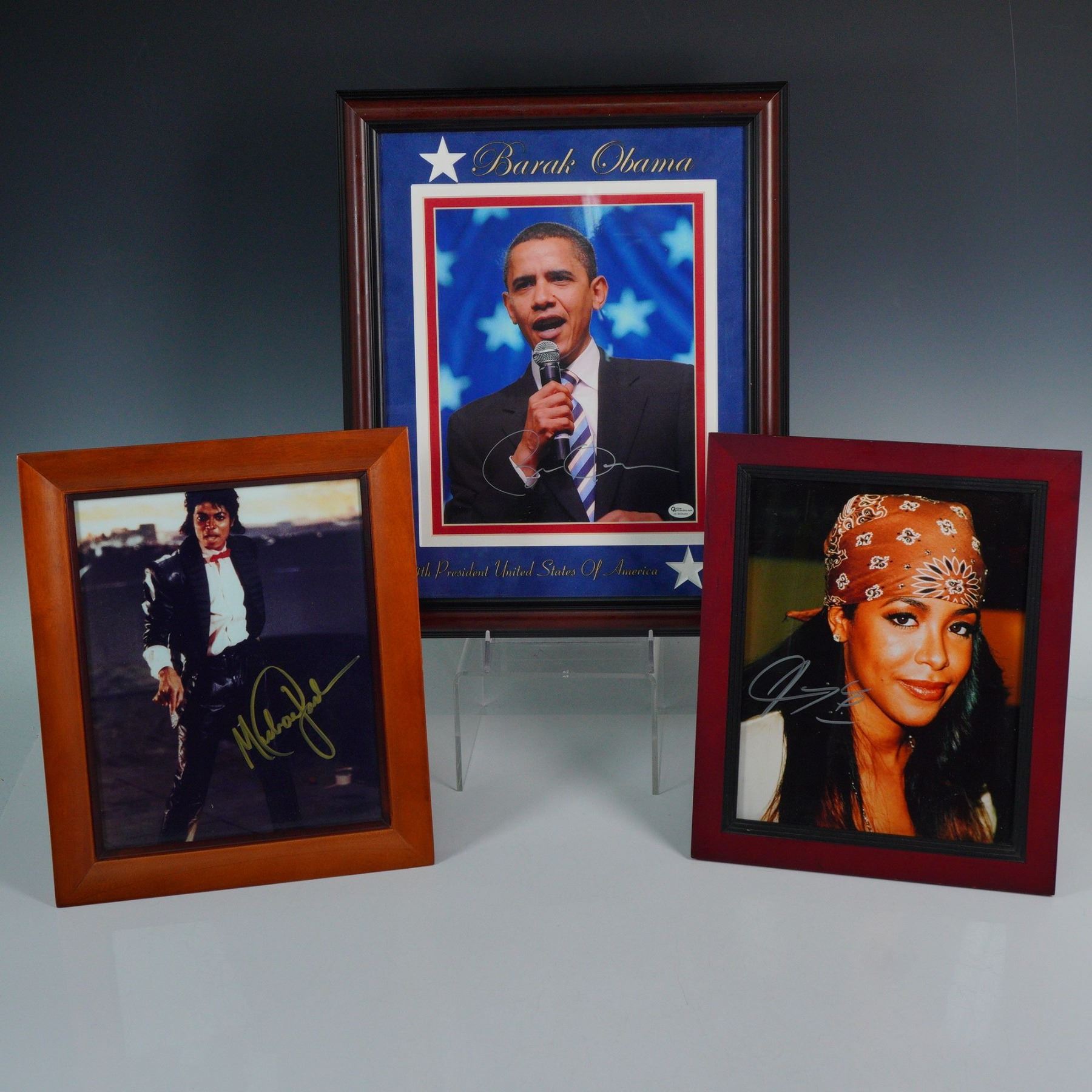 An assorted group of eleven signed celebrity photographs comprising framed and unframed. It includes photos of Michael Jackson, Aretha Franklin, Aaliyah, Barack Obama, Margaret Hamilton, and Elizabeth Taylor, several others. Also included is a Marvin Gaye and Tammi Tarrell Vinyl Record titled "You're All I Need" from 1968.