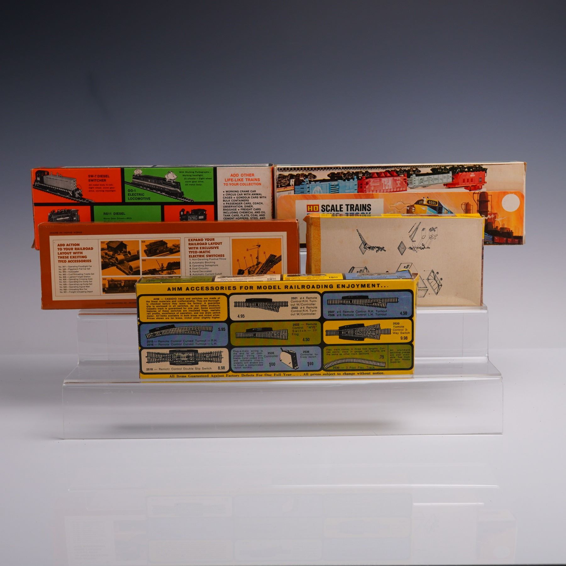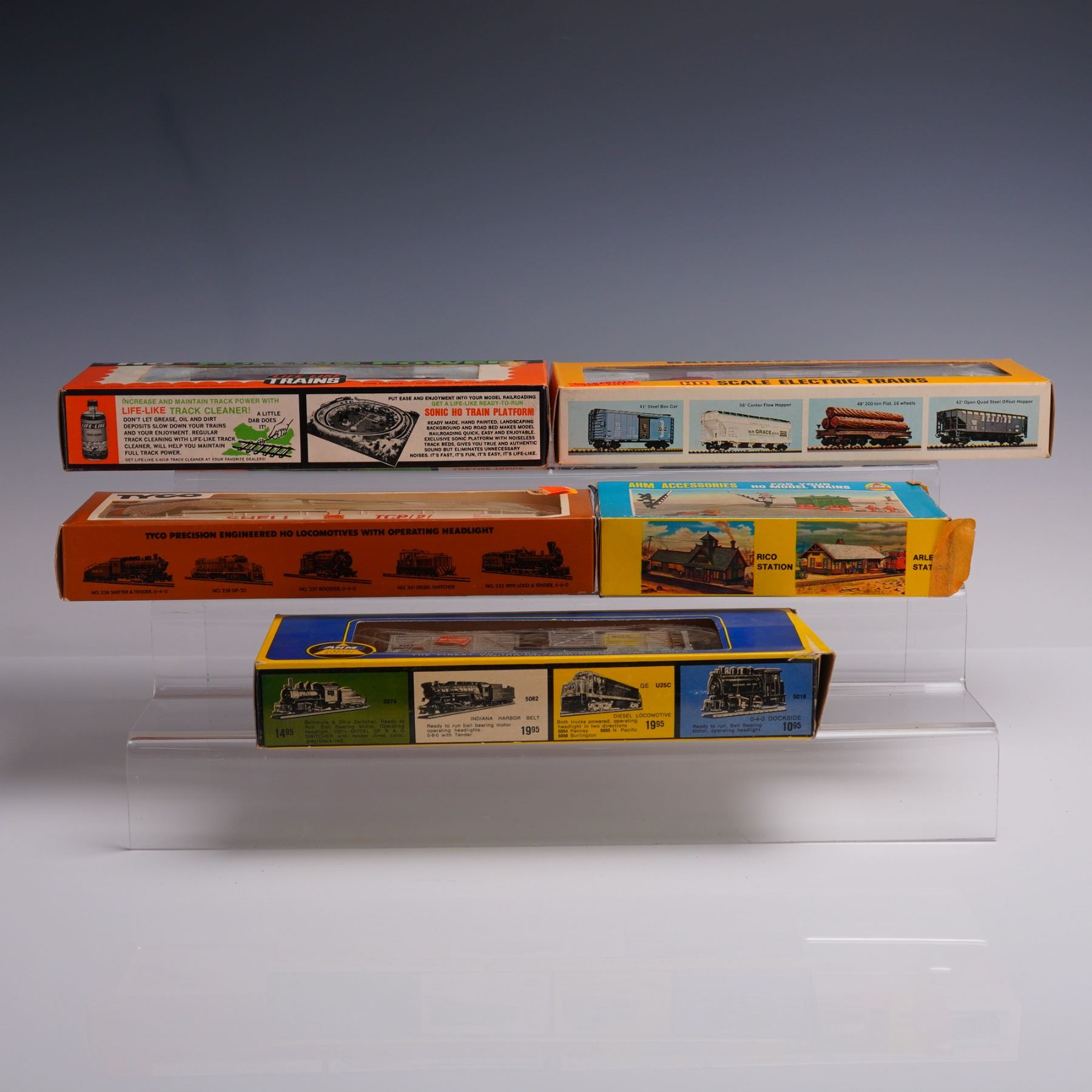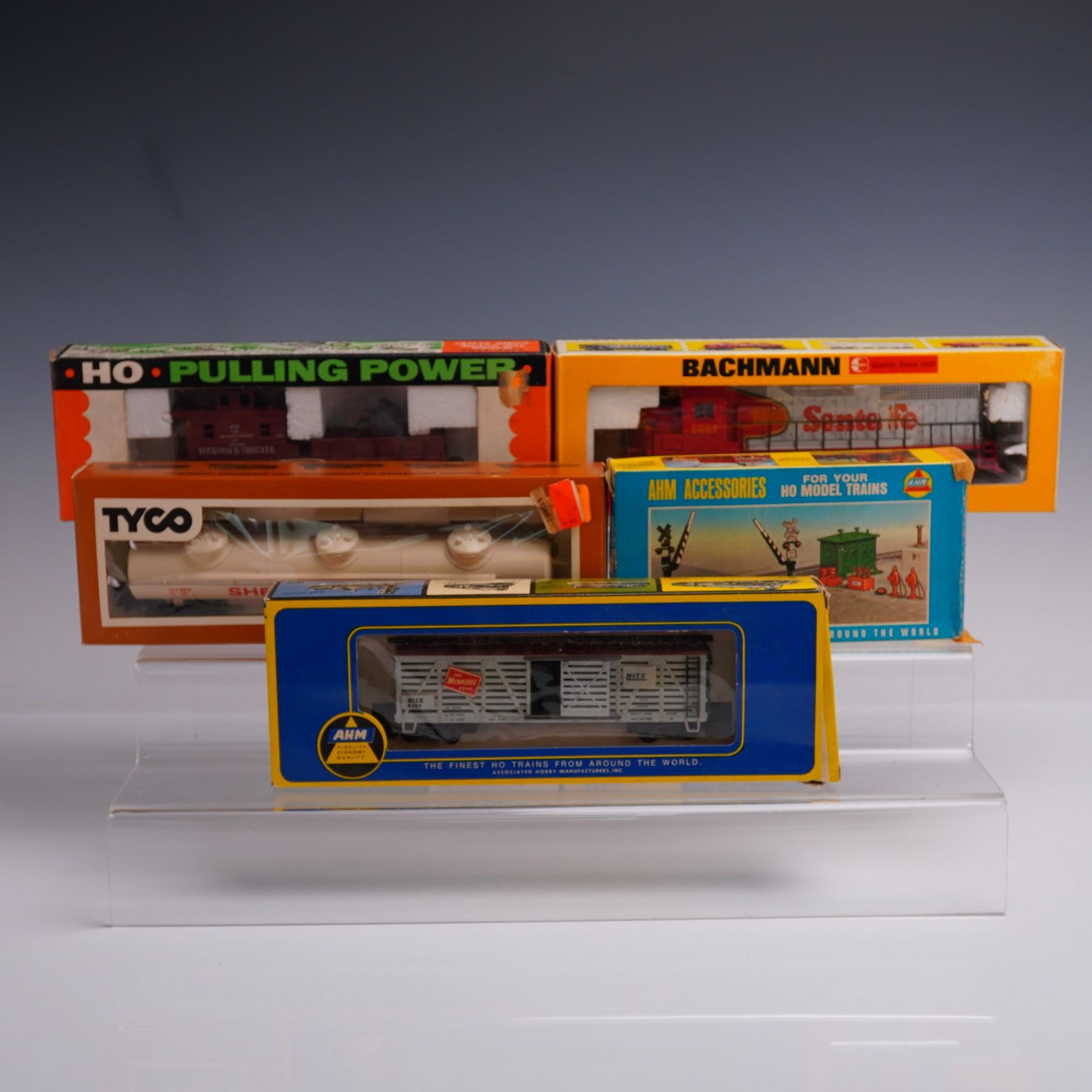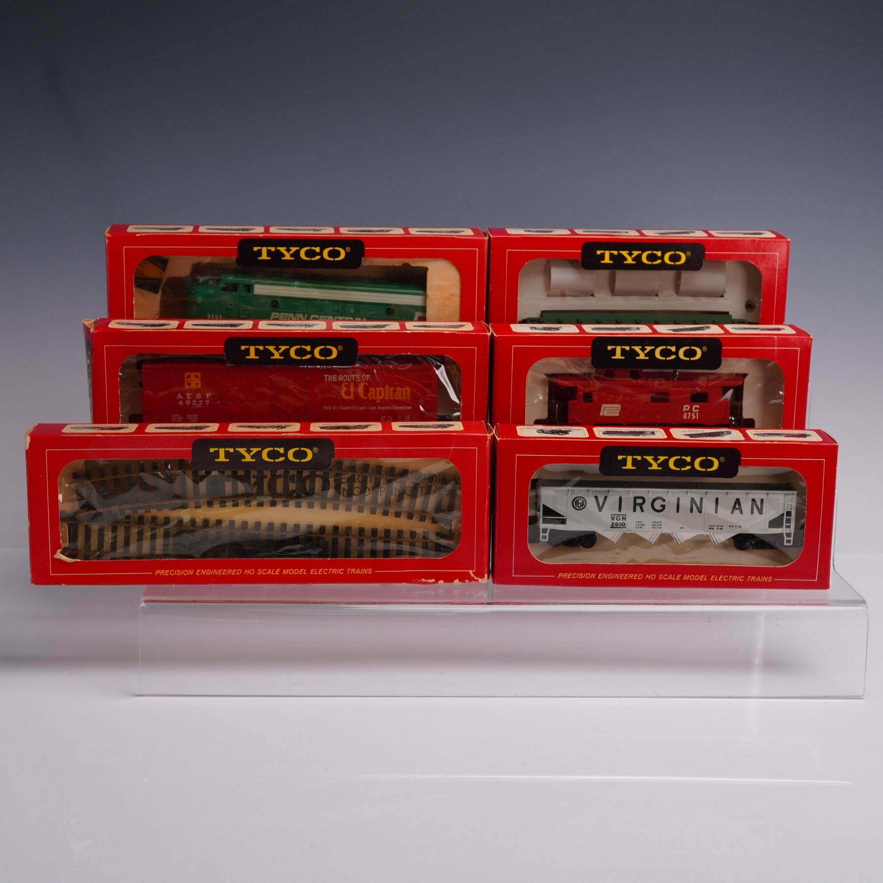 Lot of eleven HO scale model train items, primarily from TYCO and Bachmann, with original packaging. Includes a variety of cars, locomotives, accessories, and track sections. Featured items include Virginian hopper car, AT&SF "El Capitan" boxcar, Penn Central boxcar, Santa Fe diesel engine, Shell tanker, and others. Items appear to have minimal to moderate use with original boxes showing some wear. A great group for model railroad enthusiasts and collectors.