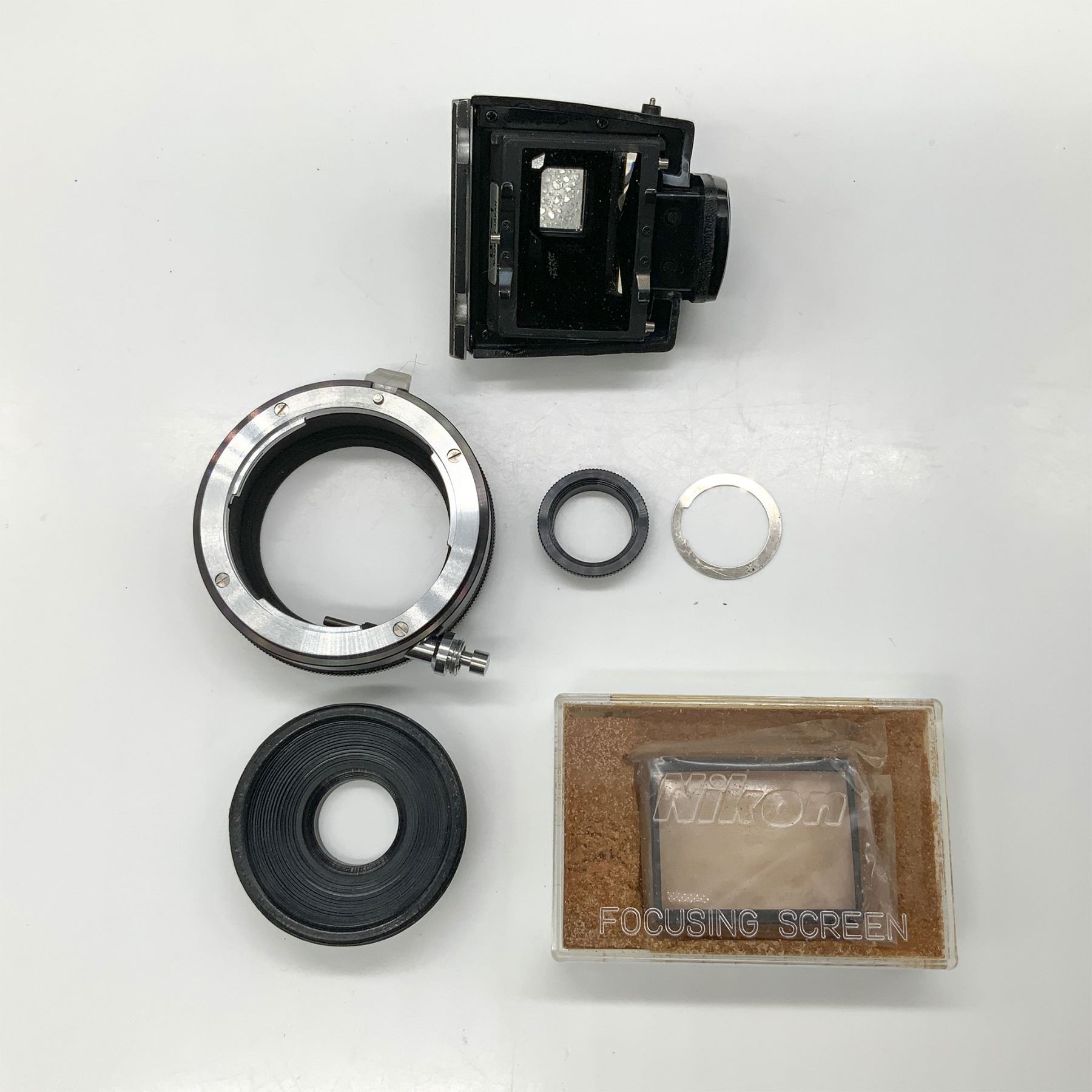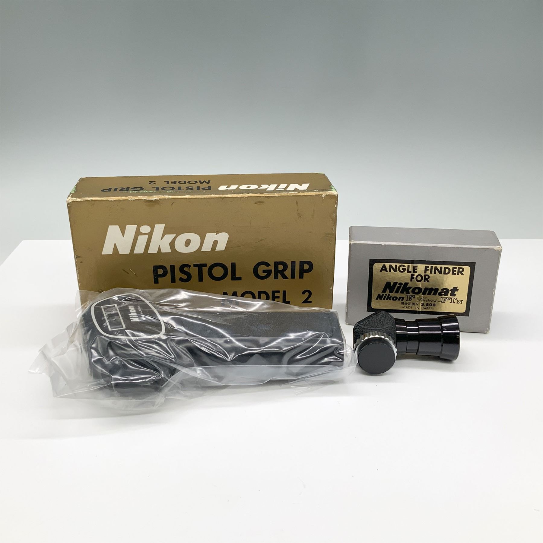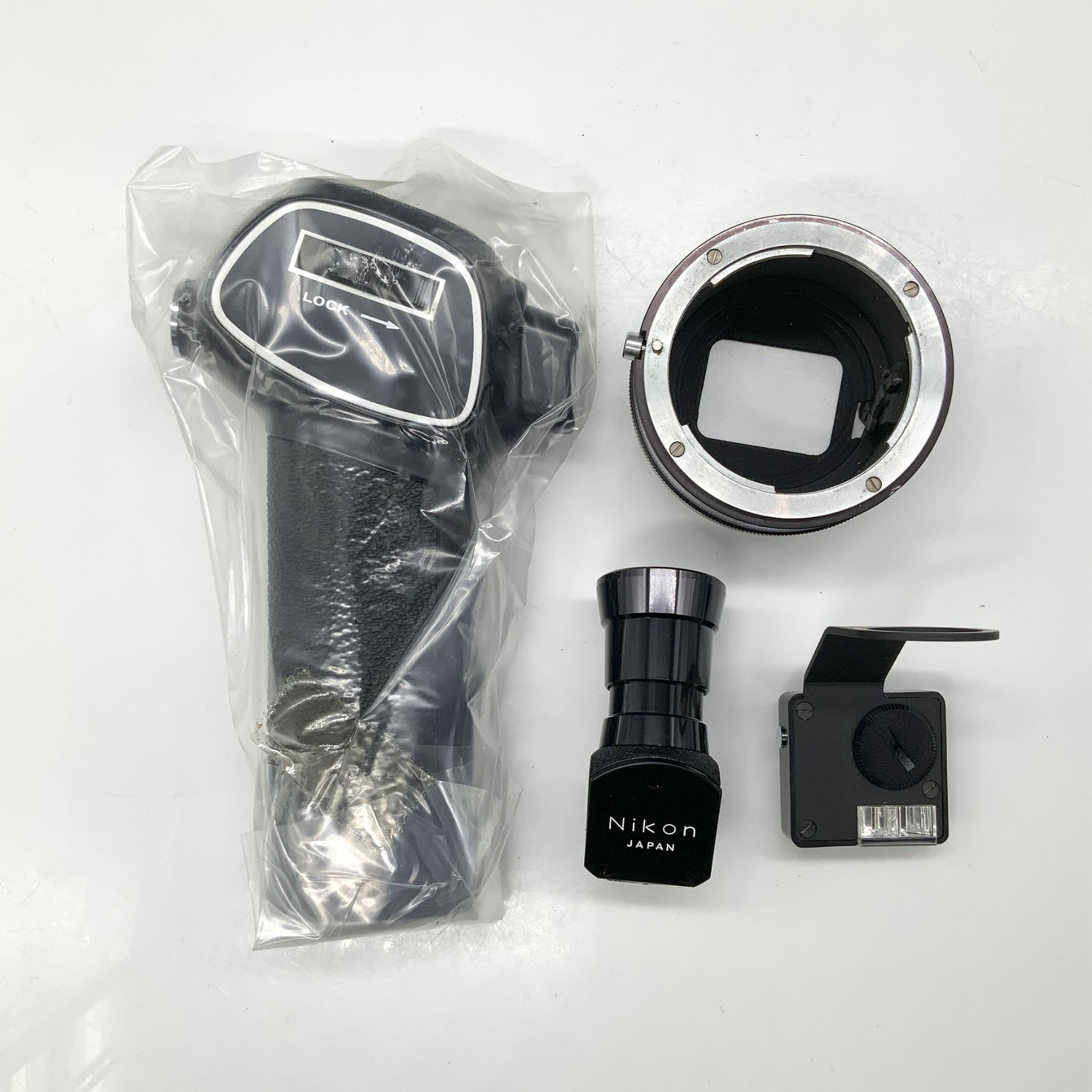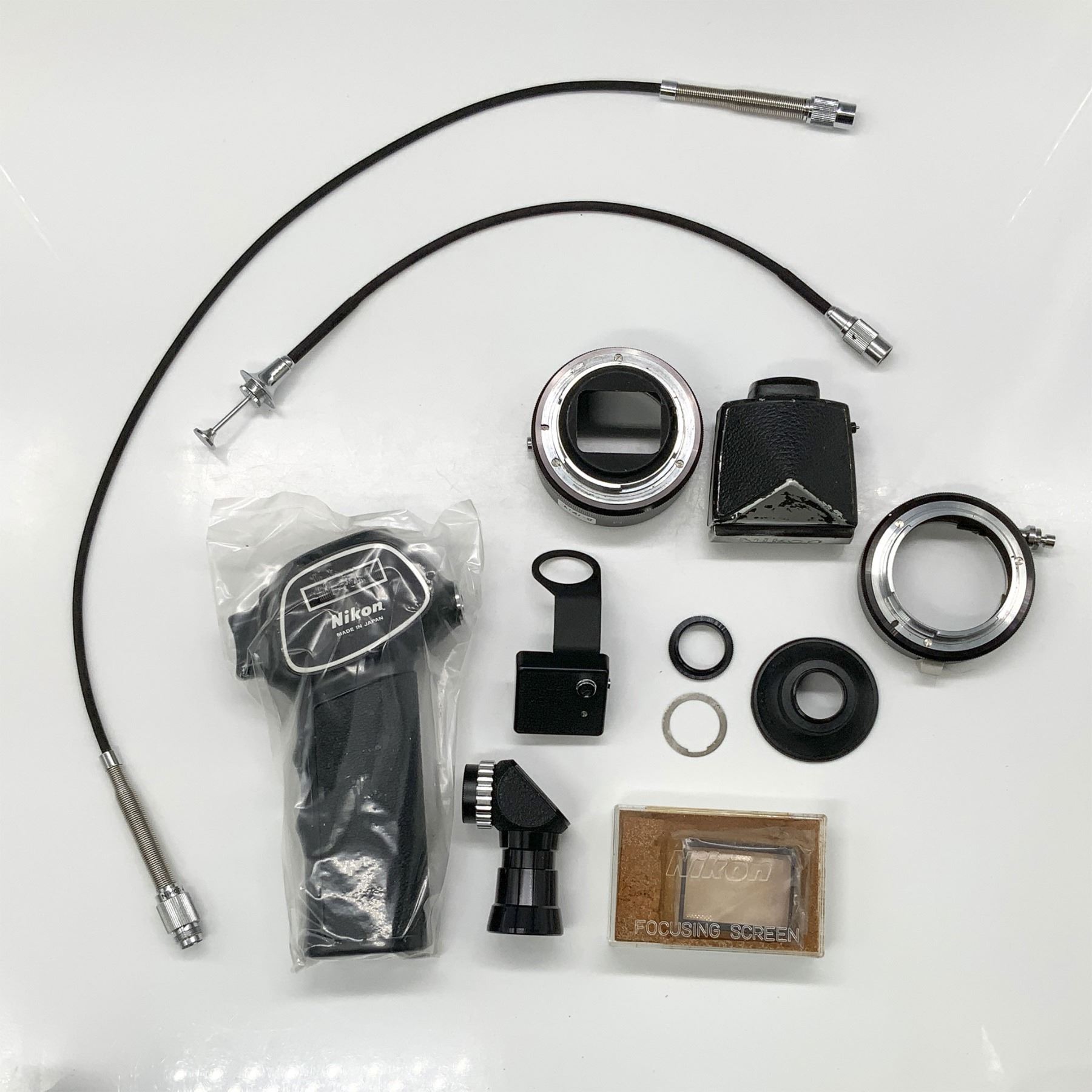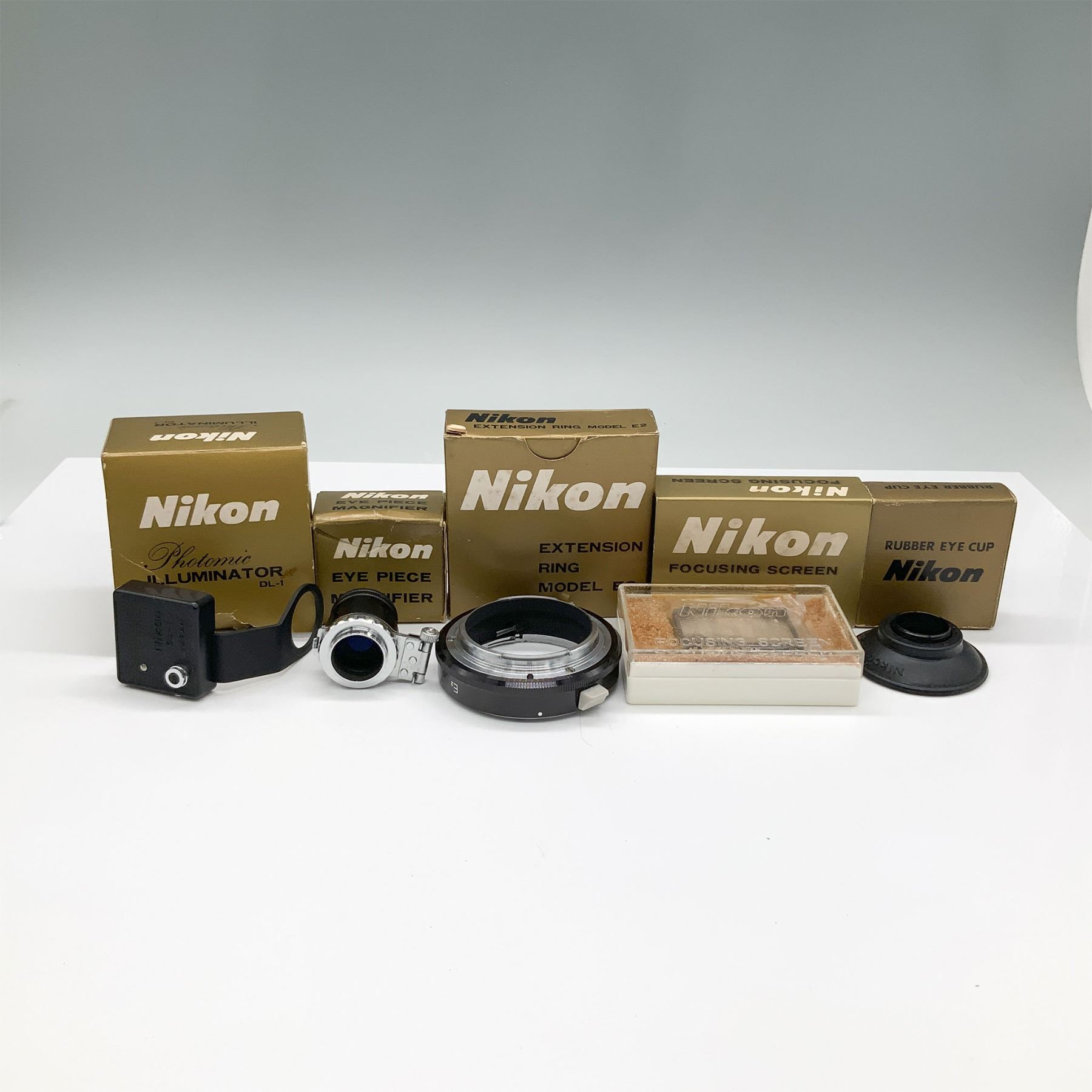 Features a collection of Nikon-branded camera accessory parts, ideal for professional and vintage photography enthusiasts. The lot includes a mix of tools and enhancements designed to support Nikon camera models. Each item is presented in its original packaging, showcasing quality craftsmanship synonymous with Nikon's reputation as a leading camera manufacturer. Items Included: Nikon Focusing Screen (Type P) - A high-precision focusing screen for improved viewfinder clarity; Nikon Angle Finder for Nikkormat Cameras - Model 3569, allows comfortable viewing at right angles for creative shots; Nikon Eye Piece Magnifier - Enhances viewfinder magnification, aiding detailed compositions; Nikon Rubber Eye Cup - Provides comfort and reduces external light interference during use; Nikon Extension Ring Model E2 - Perfect for macro photography and close-up shots; Nikon Illuminator Cable and Attachment - Essential for enhancing light during focusing; Nikon Mirror Attachment (M) - For specialized photography setups; Nikon DE-1 Viewfinder; Nikon Pistol Grip Model 2; and 2 cable releases. Some items have original boxes. The largest item measures: 5.75"H.
