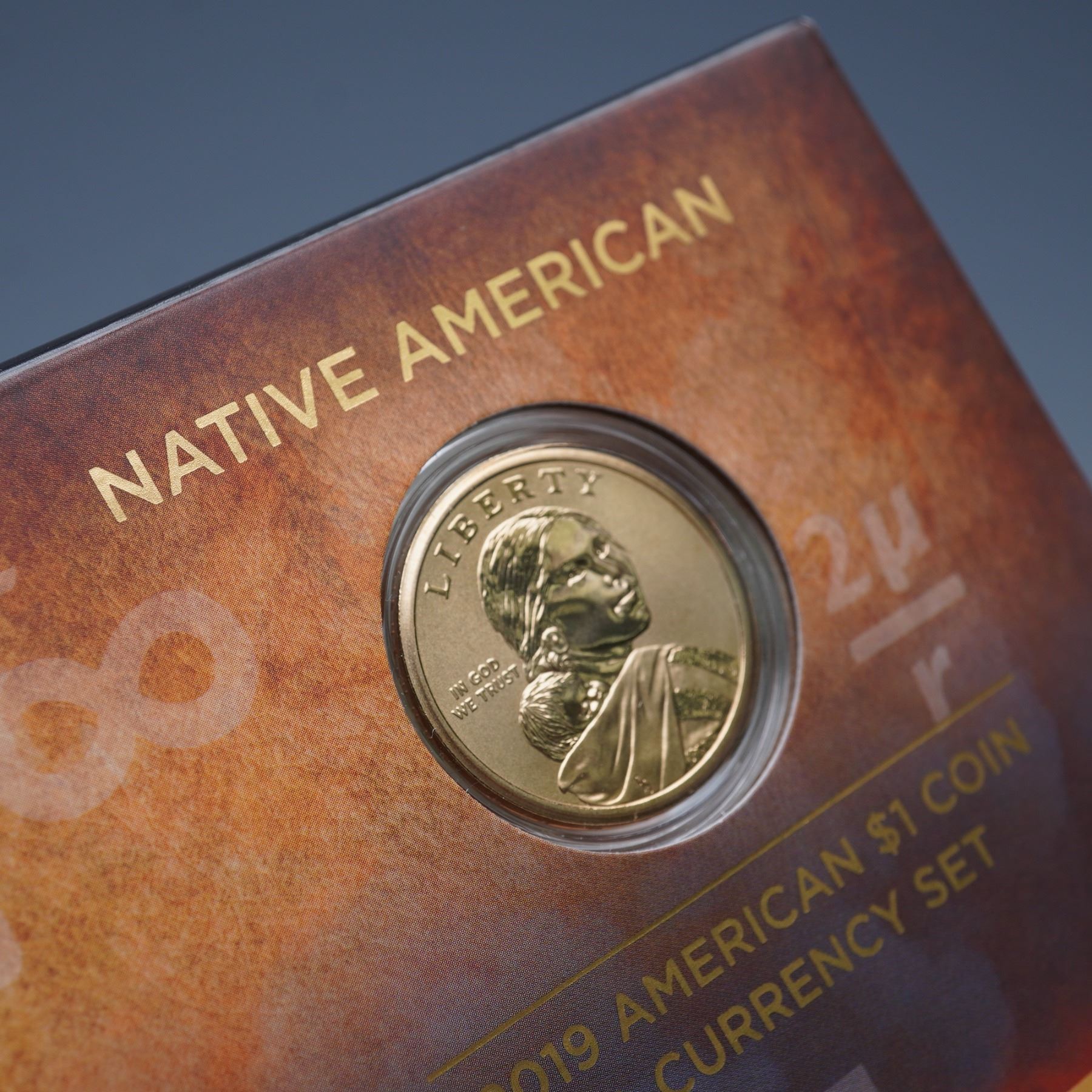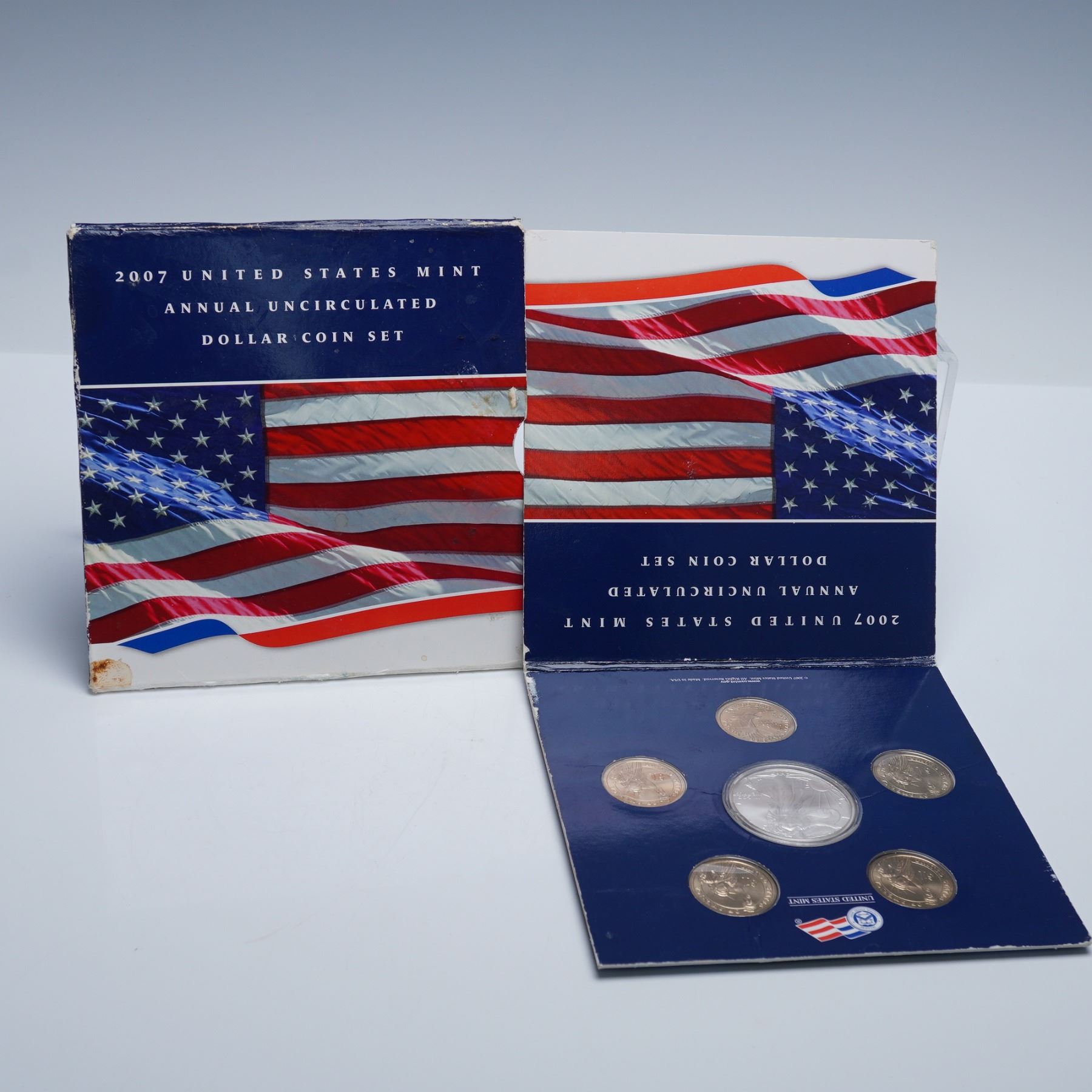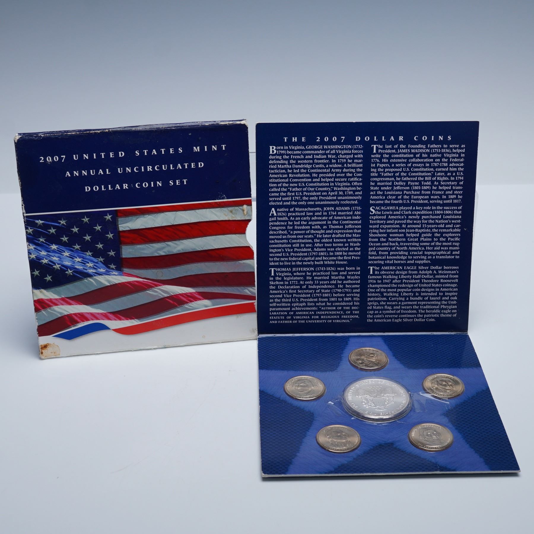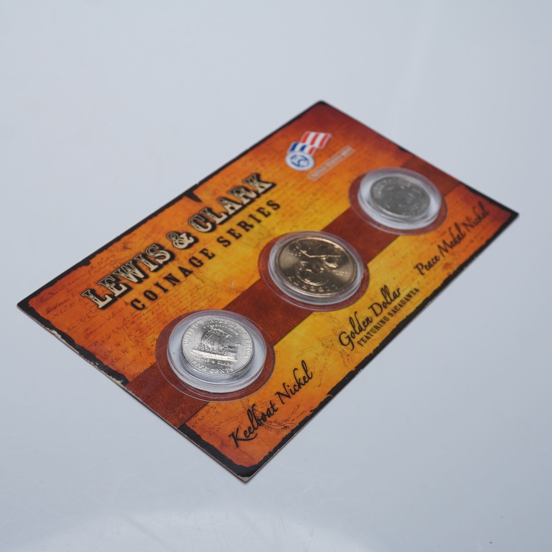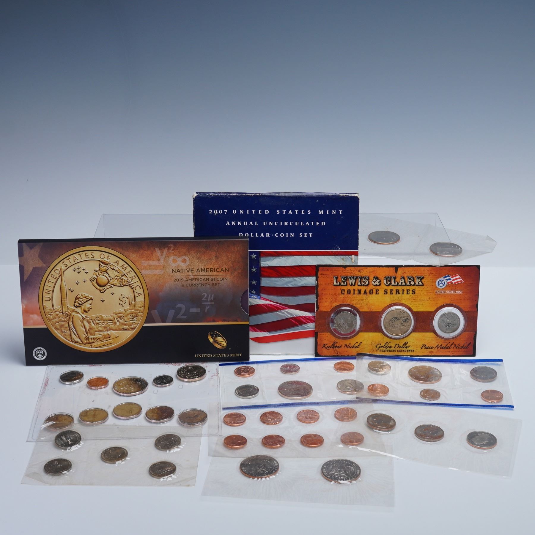 United States Mint coin collection including a '2019 Native American One Dollar and Currency Set' with dollar coin and $1 Federal Reserve Note, 'Lewis & Clark Coinage Series' containing Keelboat Nickel, Peace Medal Nickel, and Golden Dollar featuring Sacagawea, and a '2007 United States Mint Annual Uncirculated Dollar Coin Set' featuring Presidential $1 coins and American Eagle Silver Dollar. Also included are multiple U.S. Mint sets featuring Lincoln cents, Jefferson nickels, Roosevelt dimes, Washington quarters, Kennedy half dollars, and Sacagawea dollars from the Denver, Philadelphia, and San Francisco Mints with years represented including 1992, 1993, 2004, 2005, 2006, 2009, 2019, and 2021.