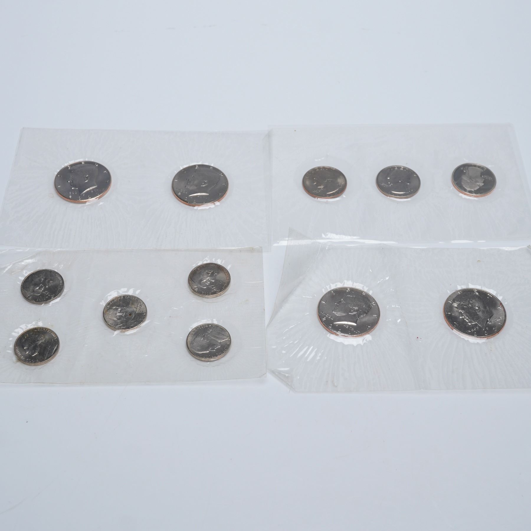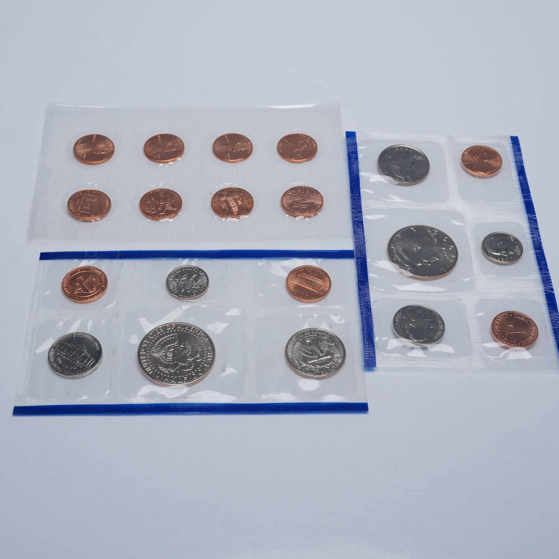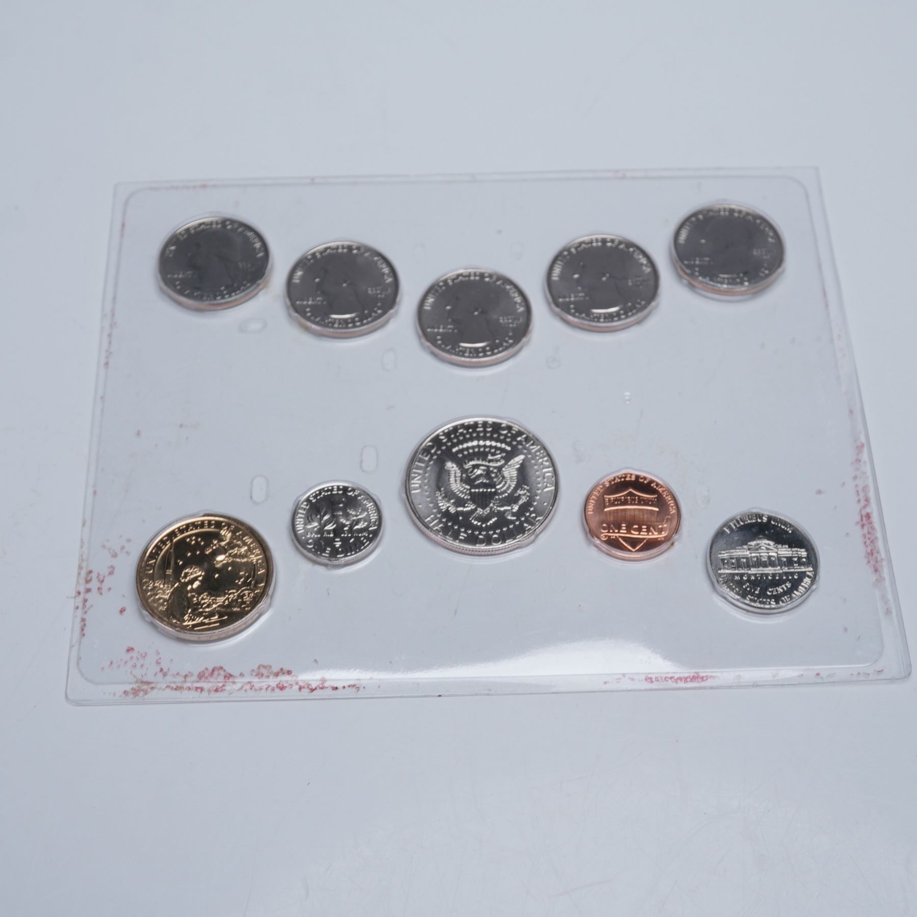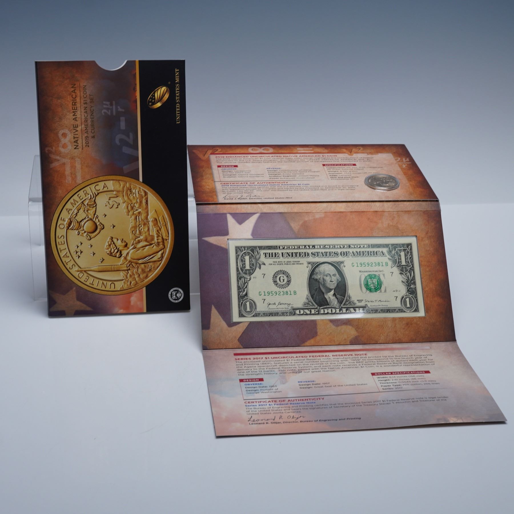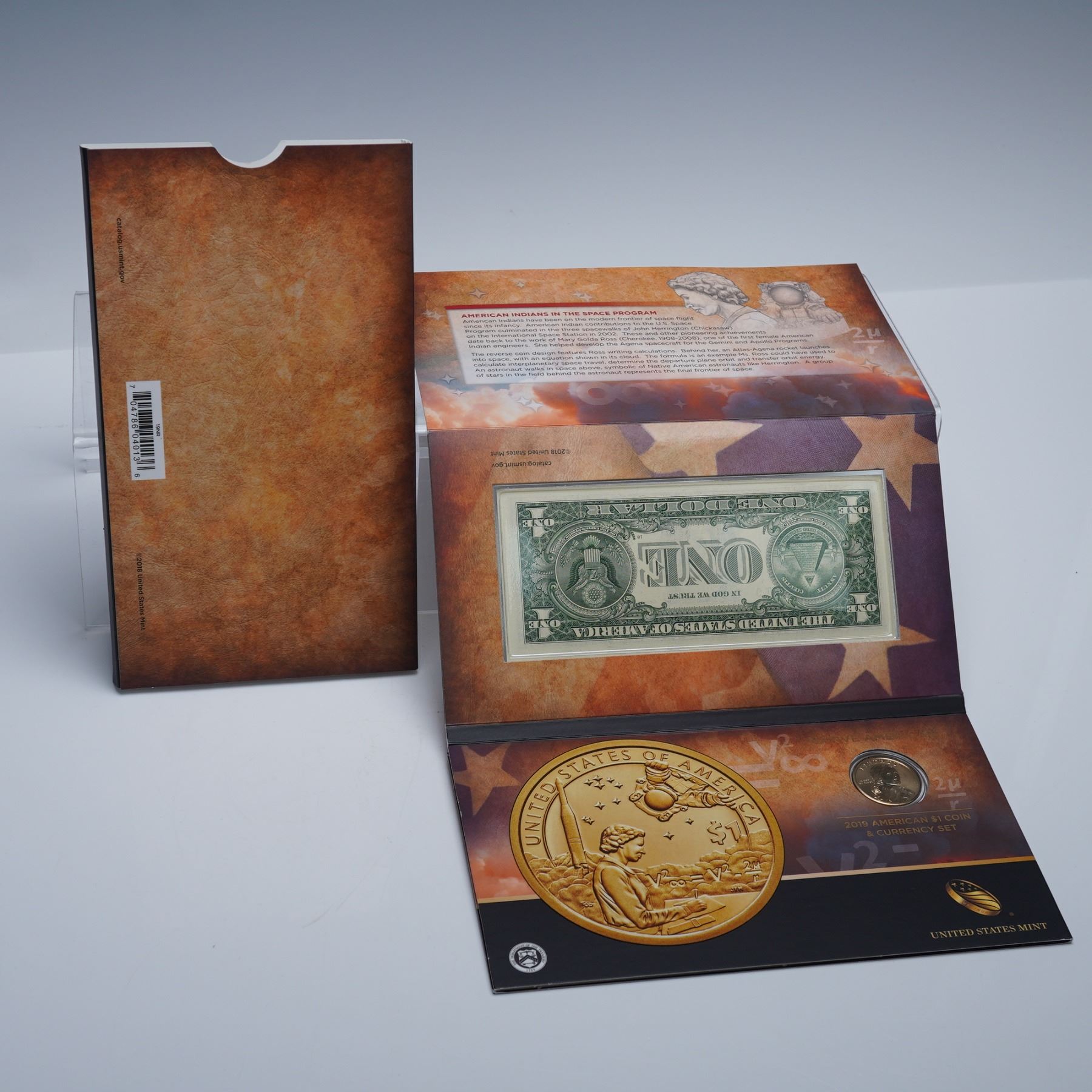 United States Mint coin collection including a '2019 Native American One Dollar and Currency Set' with dollar coin and $1 Federal Reserve Note, 'Lewis & Clark Coinage Series' containing Keelboat Nickel, Peace Medal Nickel, and Golden Dollar featuring Sacagawea, and a '2007 United States Mint Annual Uncirculated Dollar Coin Set' featuring Presidential $1 coins and American Eagle Silver Dollar. Also included are multiple U.S. Mint sets featuring Lincoln cents, Jefferson nickels, Roosevelt dimes, Washington quarters, Kennedy half dollars, and Sacagawea dollars from the Denver, Philadelphia, and San Francisco Mints with years represented including 1992, 1993, 2004, 2005, 2006, 2009, 2019, and 2021.