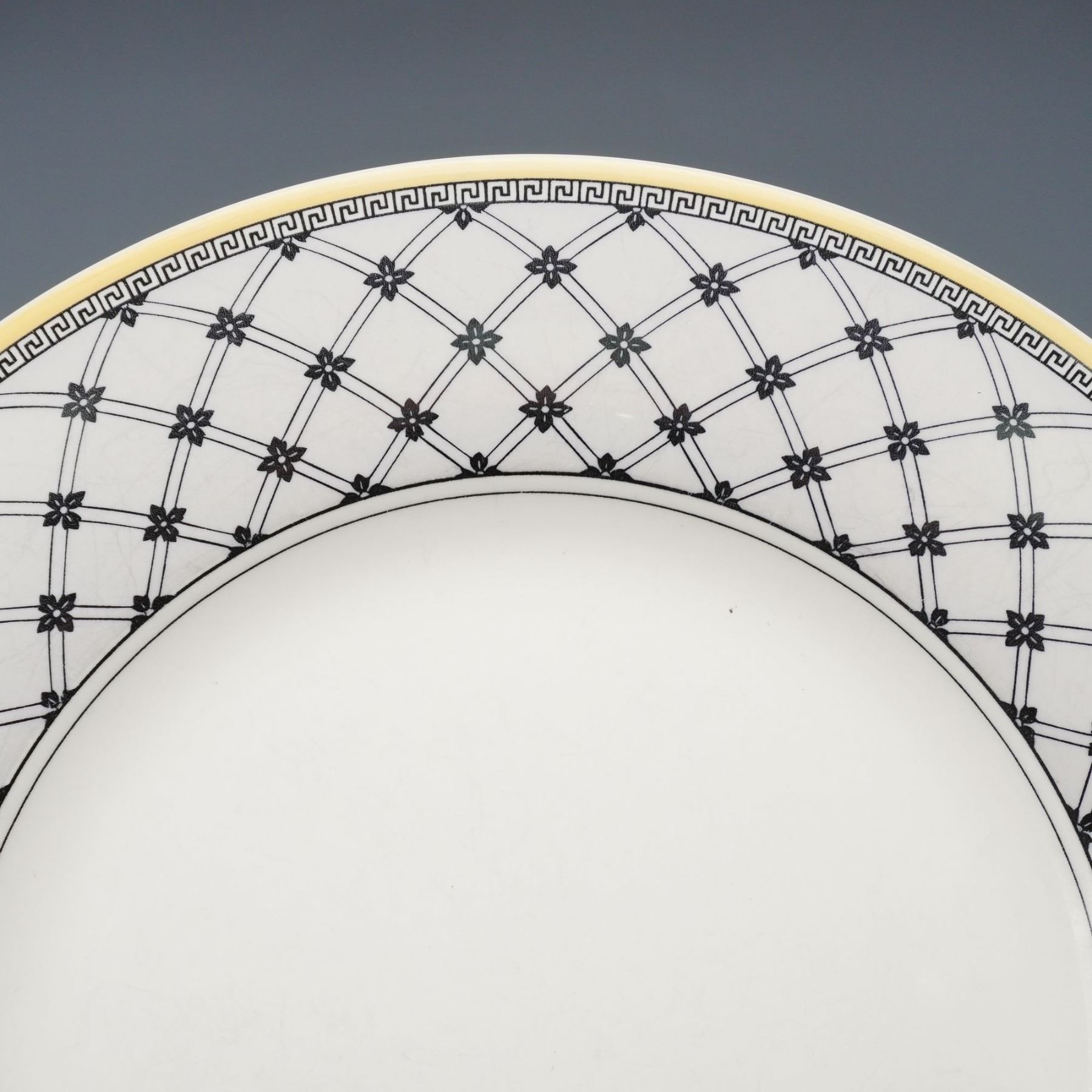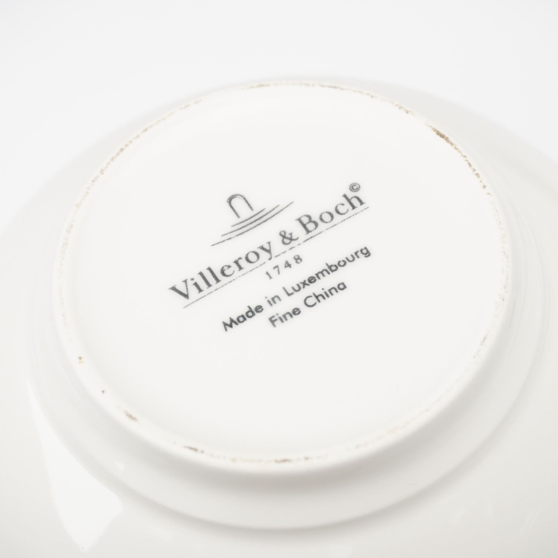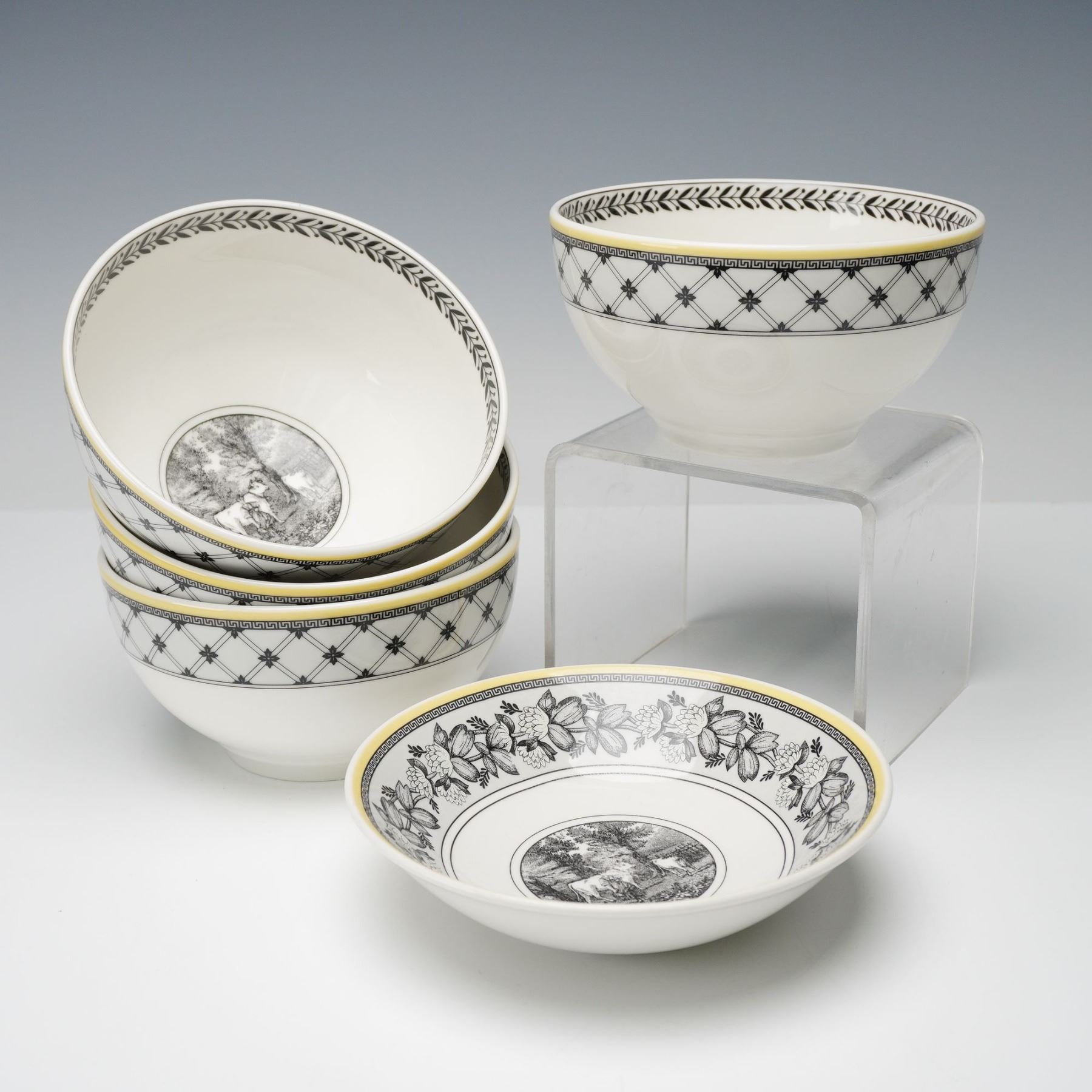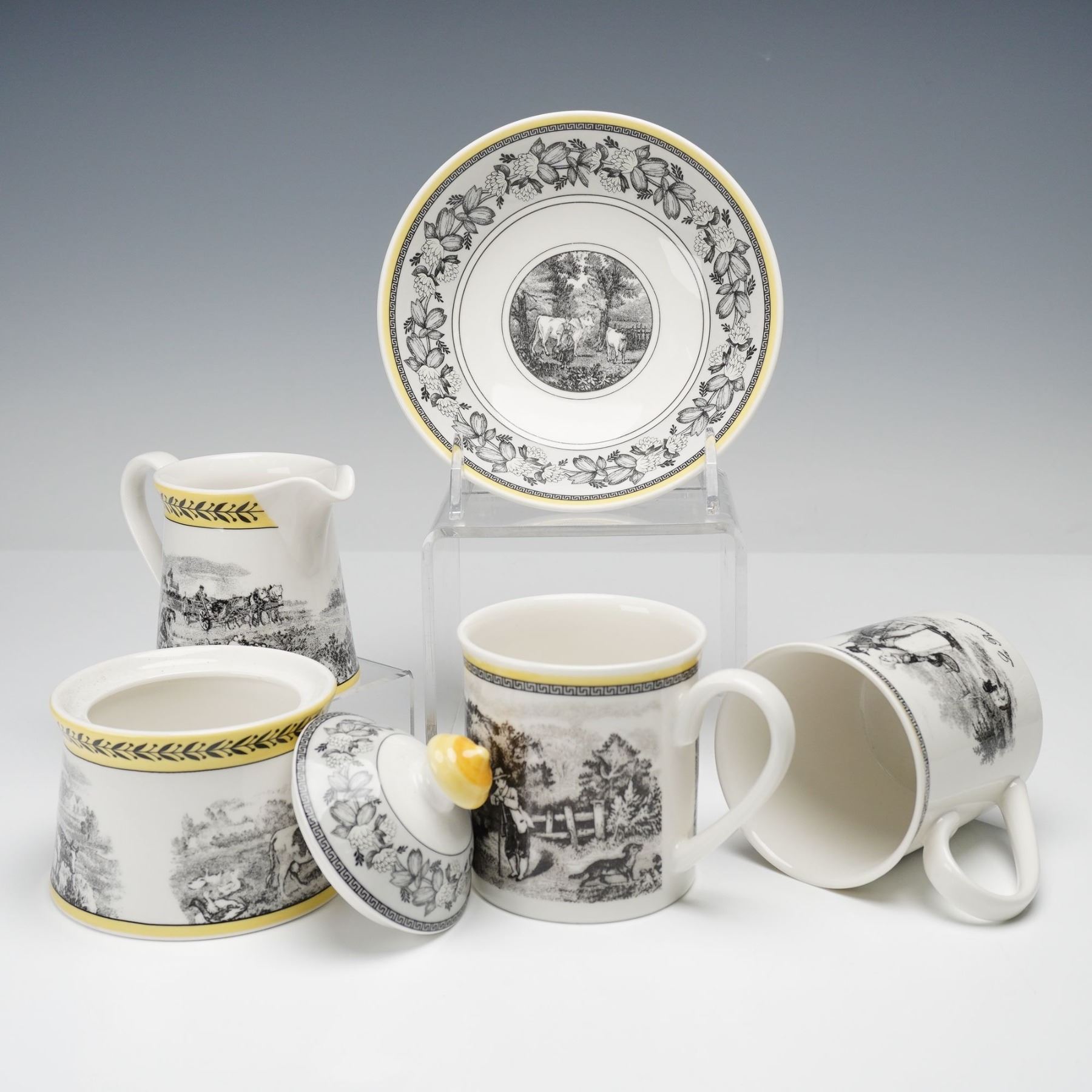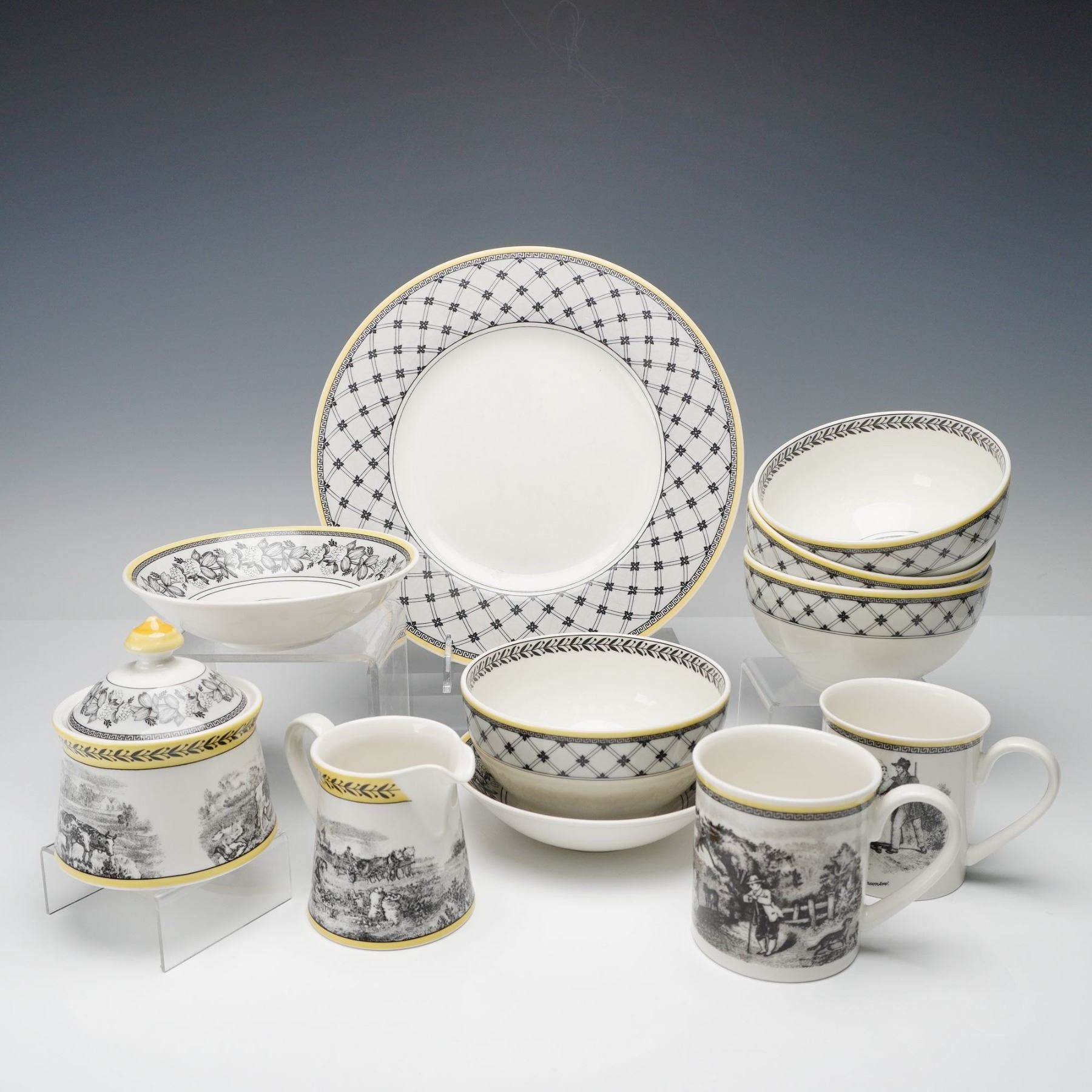 Collection of 11 mixed fine china dinnerware pieces by Villeroy & Boch, made in Luxembourg and Germany. This charming grouping combines designs from the Audun Ferme, Audun Chasse, and Audun Promenade series, each depicting detailed 18th century pastoral scenes in black-and-white toile with yellow and gold accents. The set includes one dinner plate (Promenade), two fruit bowls (Ferme), four bowls (Chasse), two mugs (Chasse), one creamer (Ferme), and one covered sugar bowl (Ferme). Each piece is crafted from fine Villeroy & Boch porcelain, marked accordingly on the base. The mix of patterns offers a refined and cohesive French country aesthetic that complements other Audun collections beautifully.