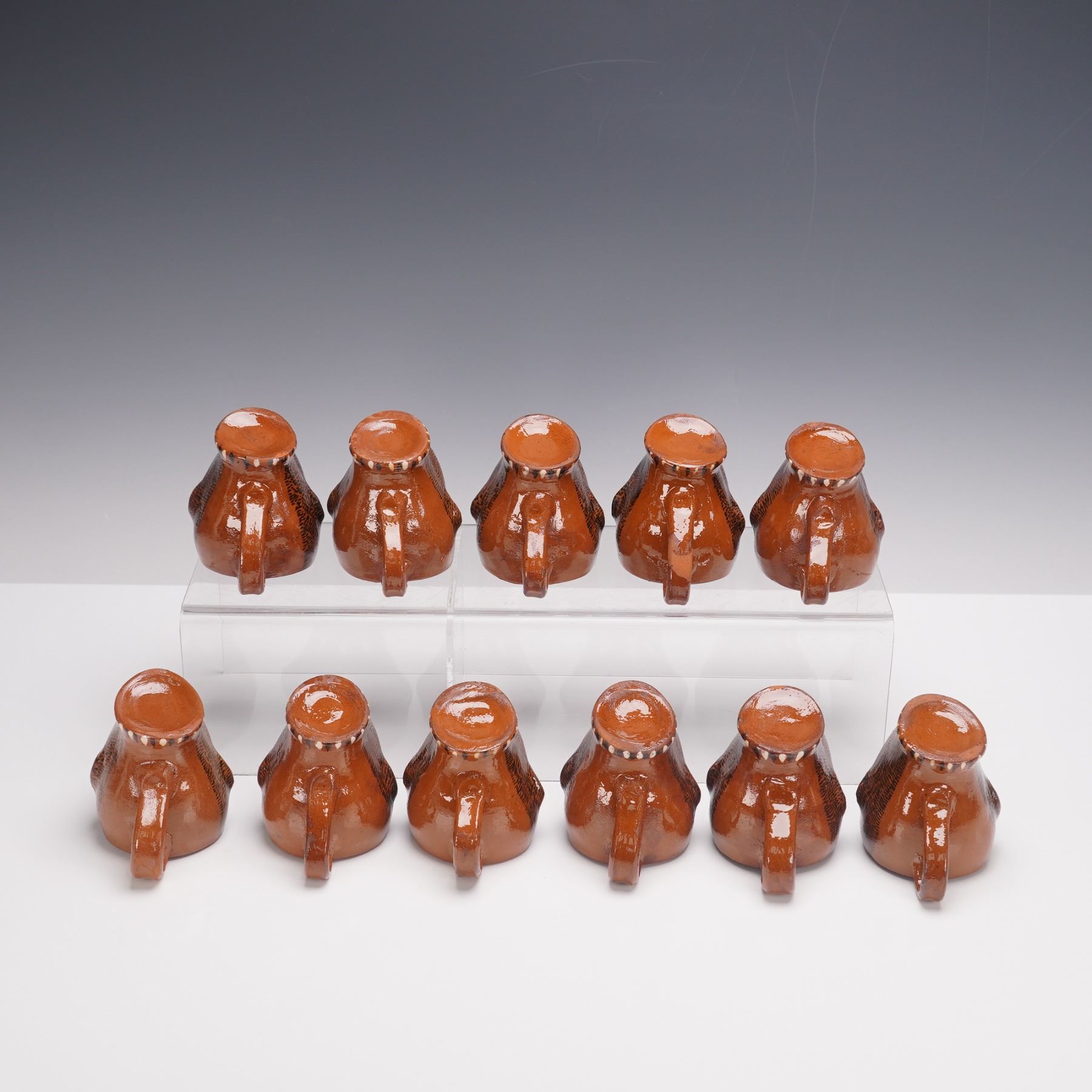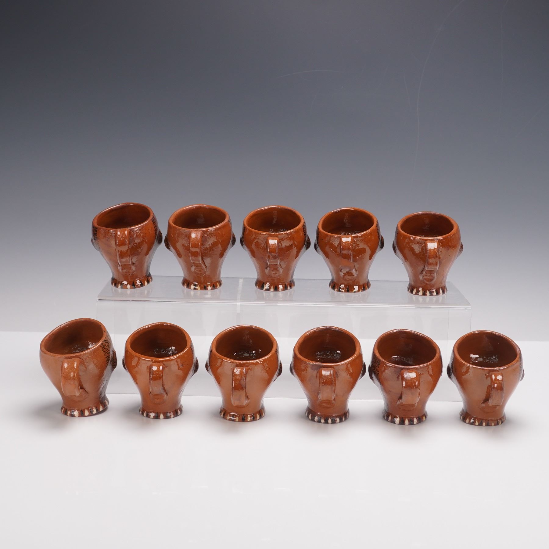 A set of eleven small ceramic jugs, each modeled in the form of a stylized head with detailed facial features, including prominent eyes, brows, and textured hair. The jugs are hand-painted in warm brown and earthy tones, with individual variations to the expressions and glaze, giving each piece a distinctive personality. Each jug has a rear handle and an open top for functional or decorative use. Together, the set presents as a striking group of ceramics with strong visual appeal.