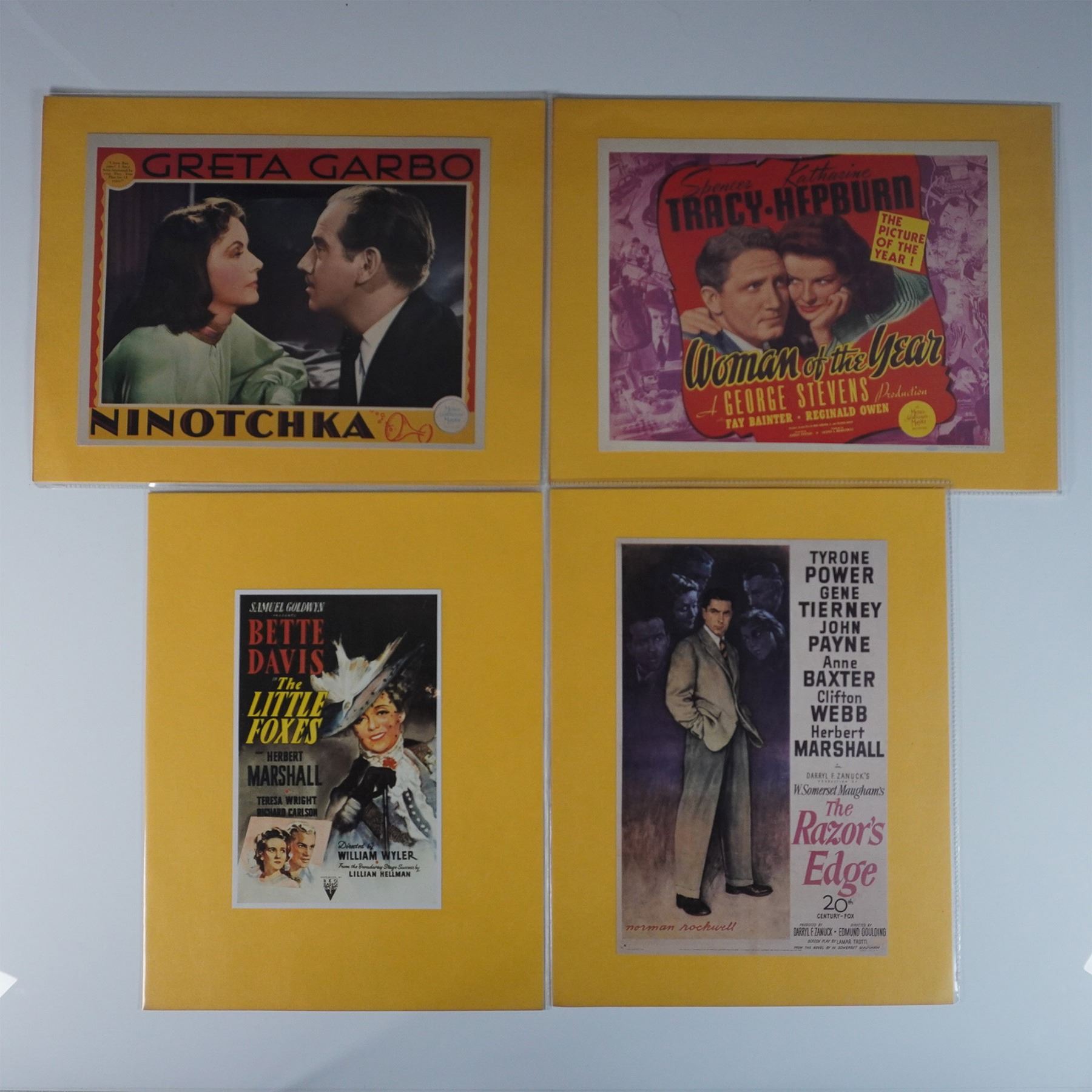 A collection of 11 vintage reproduction lobby cards featuring iconic films and legendary Hollywood actors from the Golden Age of cinema. This set includes lobby cards from The Little Foxes (Bette Davis), Ninotchka (Greta Garbo), Woman of the Year (Spencer Tracy & Katharine Hepburn), Possessed (Joan Crawford & Clark Gable), Yankee Doodle Dandy (James Cagney), The Son of the Sheik (Rudolph Valentino), The Razor’s Edge (Tyrone Power), Monkey Business (The Marx Brothers), Beyond the Rocks (Gloria Swanson), To Be or Not to Be (Carole Lombard & Jack Benny), The Barber Shop (W.C. Fields), and others. These vintage promotional pieces capture the artistry of classic Hollywood and are beautifully preserved in protective sleeves. A must-have collection for film historians, memorabilia collectors, and lovers of vintage cinema. Lot measures 9"L x 0.5"W x 11.5"H.