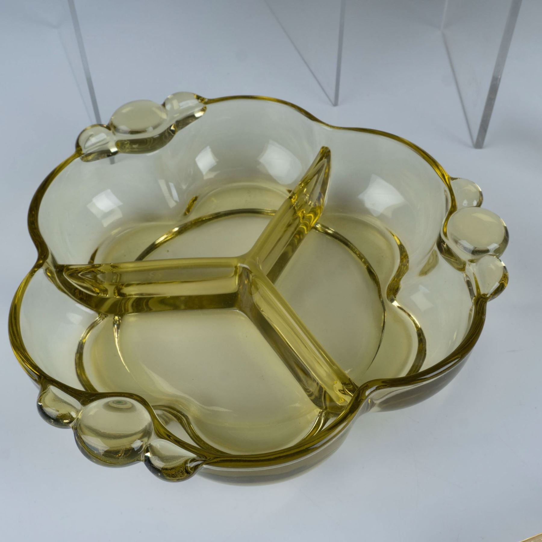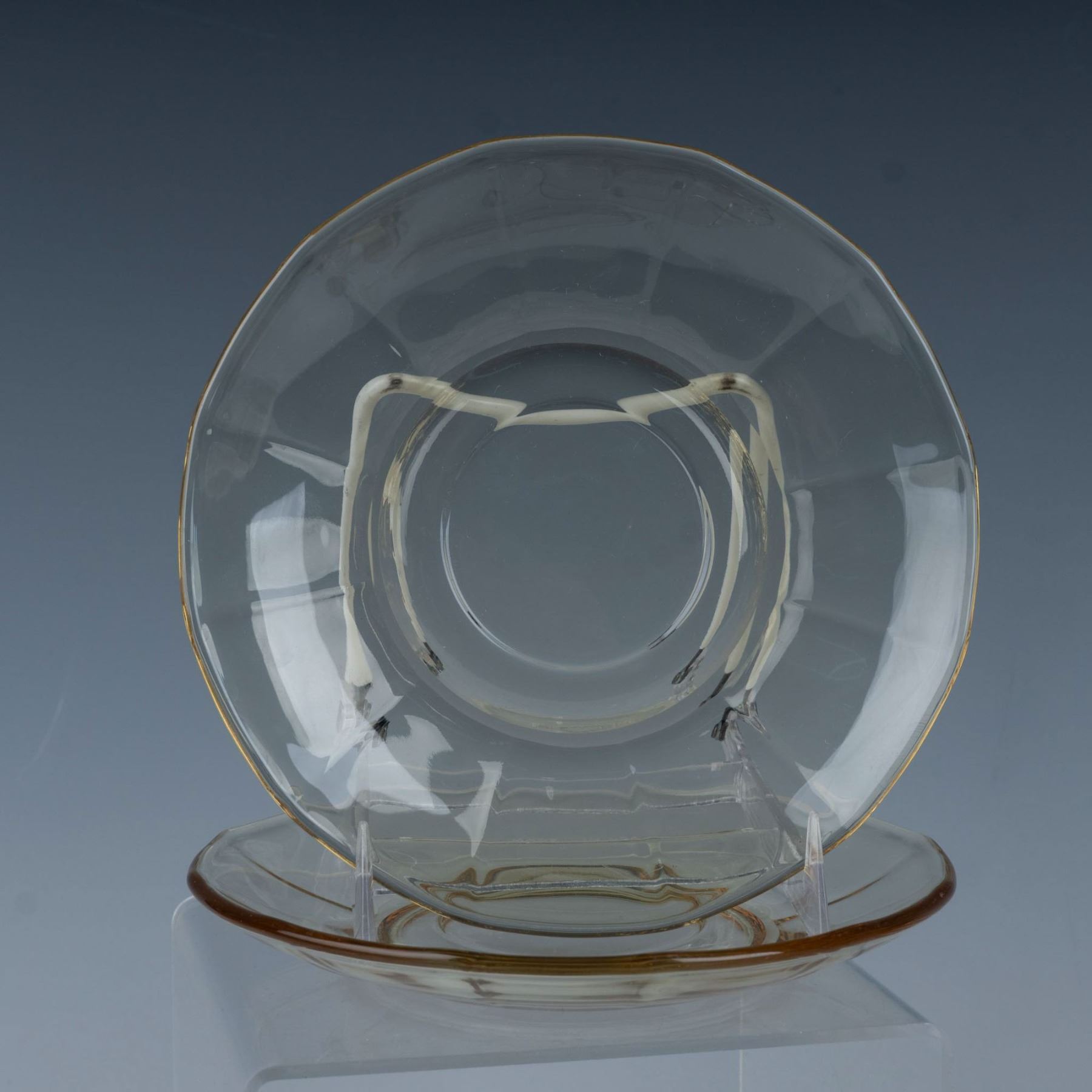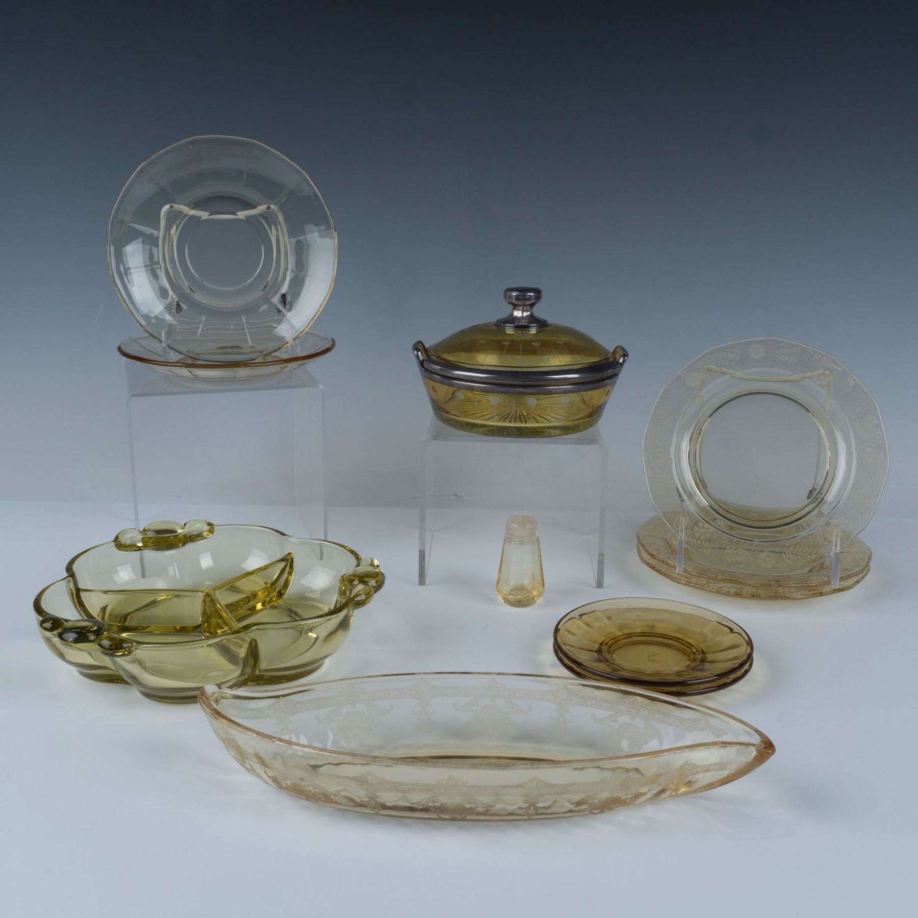 Collection includes Heisey etched Old Colony Sahara glass serving dish; 3 round etched bread plates; 2 paneled saucer plates; 2 demitasse saucers; 1 shaker; 1 etched covered dish with silverplated rims and handle; and Tiffin Citron 3 part serving dish. Largest piece 7.5"L x 7.25"W x 1.5"H.