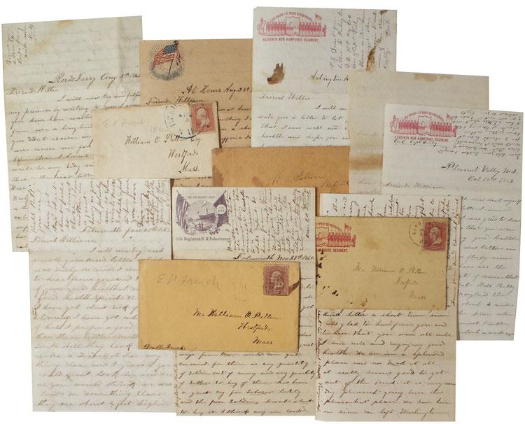 A very descriptive collection of 20 letters written by Union Soldier Edmund P. French of the hard-fighting 11th New Hampshire Infantry. French served from 4 August 1862 until 4 June 1865 and fought at Petersburg, Fredericksburg, Vicksburg, Cold Harbor, Cedar Creek, Wilderness, Spotsylvania Court House and many others. In part: 5 August 1862 from Reeds Ferry, ''…Suppose if I should tell you I have enlisted, you wouldn't believe it. Three of us went up to Manchester yesterday and enlisted and was sworn in…'' 22 September 1862 from Arlington Hts, Virginia, ''…I am way down South in Dixie…Washington isn't what I expected…Don't see nothing but Soldiers and Niggers…'' 14 October 1862 from Pleasant Valley, MD, ''…We are now in old Maryland, the Rebel Counties…about 5 miles from Harpers Ferry…where John Brown had so much trouble…I went over there…the village is a desolate place…the houses are burned to the ground, it is a horrible sight…'' 28 November 1862 from Falmouth, VA, ''…We are now near Fredericksburg, is a very large city…there are about 150 thousand Rebels over there, expect a big battle we are going on to Richmond. Burnsides says he is going to have 400,000 strong before he goes into Richmond…'' From Newport News, Virginia, ''…The talk now is that the 9th Army Corps is going to South Carolina preparing for a big battle at Charleston and 400,000 troops are coming down there so we expect to go there soon. If we don't go there we will probably go to Richmond. It will be a big battle at whichever place…'' Camp near Vicksburg, 27 June 1863, ''…12 miles from Vicksburg…it is quite a large city so you can think this may crush out the Rebellion. I do really hope they will clean out the Rebs and burn the City counted 200 guns yesterday in ten minutes yesterday morning when they were shelling and kept it up all day…'' 29 July 1863 from Milldale, Mississippi, ''…I will write something of the battle of Jackson…the 11th NH Regt was involved in it. They were under fire for 70 hours. There was 10 wounded, 1 killed there was quite a number wounded in the Mass 35th. We had to carry the wounded off the bullets came thick and fast over our heads…The Rebs evacuated in the night…'' 27 May 1864 from field camp, ''…The 11th regiment in the hottest part. They lost 170 men killed & wounded, such a slaughter I never want to see again…The Rebs made breastworks of the dead. They were piled up ten feet deep some of the fellows lay in the field three or four days. Couldn't get them off on account of the Sharpshooters…'' 8 July 1864 from camp near Petersburg, ''…There is so many dead horses mules…not only that, the poor soldiers ain't half buried. Some of them ain't put 2 feet under ground. We are two miles from Petersburg, Virginia. We have three killed in my company in week. The Sharpshooters shot him…'' 12 December 1864 near Hancock Station, ''…There is about half an inch of snow on the ground this winter. We poor soldiers of the Bloody 11th will have to stay out here only about eight months longer. I must tell you what I witnessed Saturday afternoon. I saw two young fellows hung by their neck until they were dead…These smart looking fellows were hung for trying to desert into the Rebels lines…It was a solemn sight to behold…One of the fellows smoked a cigar all the time going to the gallows…'' 22 April 1865 from the Headquarters of the 11th Regiment, ''…The Bloody 11th is at City Point…Some say we are going to be discharged. I don't see it myself. I saw a great many of Lee's army. They were paroled…'' 8 May 1865 near Alexandria, VA, ''…I should like to receive the good news that we are going to be Mustered Out. The Army of the Potomac and Sherman's Army are both on their way home…'' An outstanding Civil War lot.