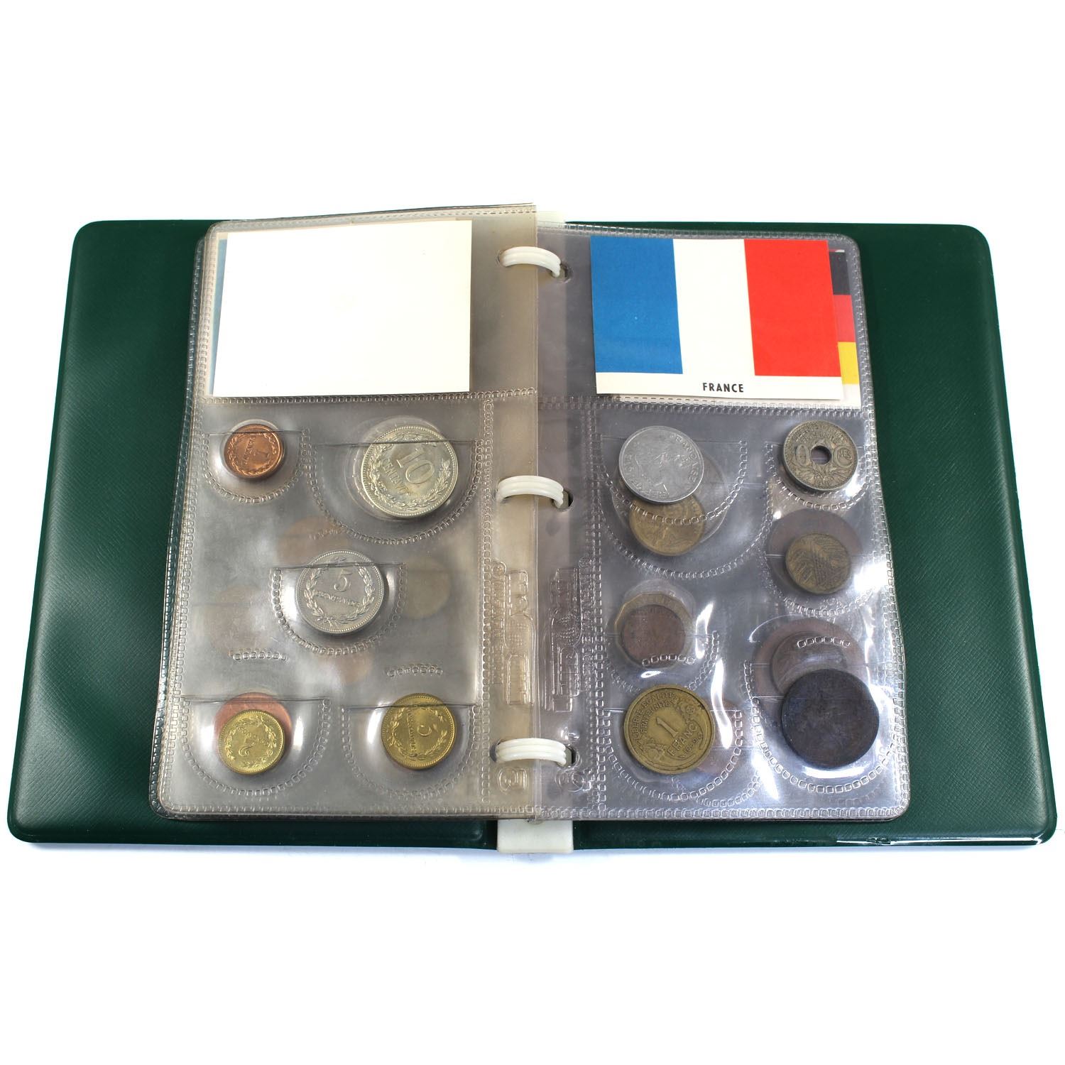 11x World Coin Sets in Plastic Pages Contained in a Small Green Binder. You will receive coin sets from Bahamas, Belgium, Bulgaria, Canada, Colombia, El Salvador, France, Germany, United Kingdom, India & Italy.