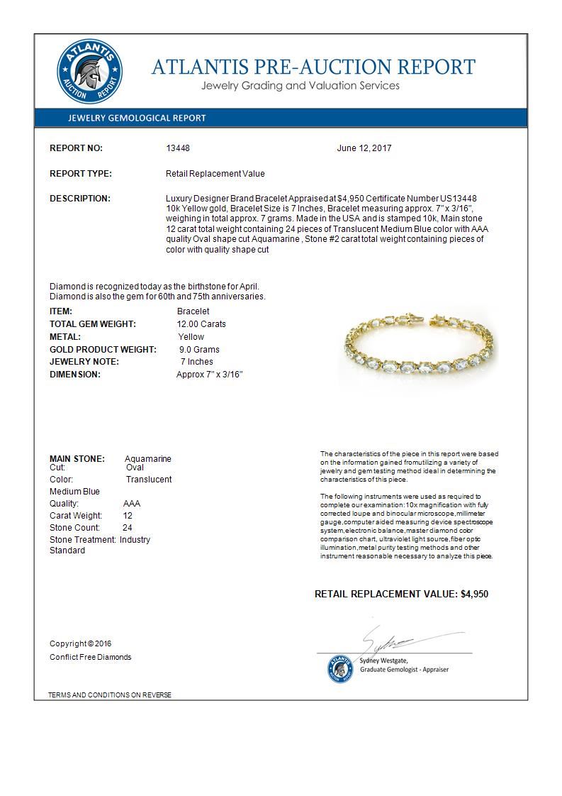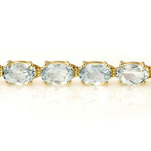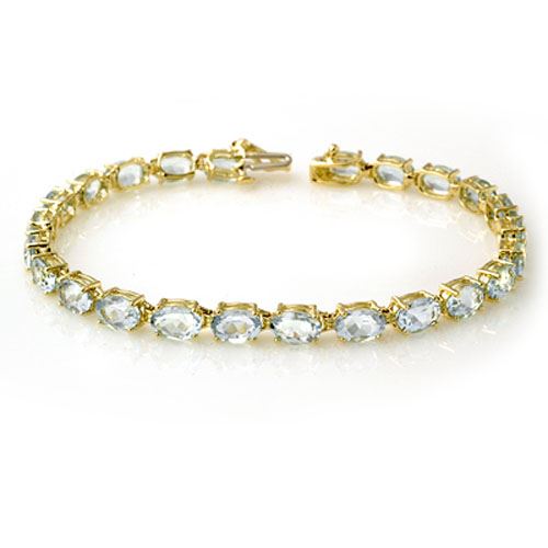 12.0 CTW Aquamarine Bracelet 10K Yellow Gold ---- Luxury Designer Brand Bracelet Appraised Retail Price at $4,950 ---- SKU Number US13448 10k Yellow gold Bracelet Size is 7 Inches, Bracelet measuring approx. 7" x 3/16", weighing in total approx. 7 grams. Made in the USA and is stamped 10k, Main stone 12 carat total weight containing 24 pieces of Translucent Medium Blue color with AAA quality Oval shape cut Aquamarine , Stone #2 carat total weight containing pieces of color with quality shape cut