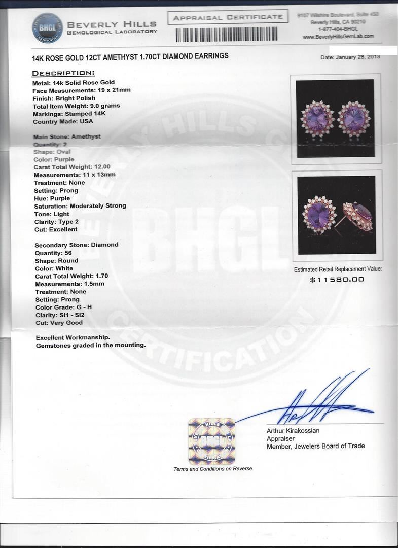 One 14KT rose gold 12.00ctw amethyst and diamond earrings. Metal: 14KT solid rose gold. Face Measurements: 19 x 21mm. Finish: Bright polish. Total Item Weight: 9.0 grams. Markings: Stamped 14K. Country Made: USA. Containing: 2 oval Amethyst with a total weight of 12.00ct. Measuring: 11 x 13mm. Color: Purple. Treatment: None. Setting: Prong. Saturation: Moderately strong. Tone: Light. Clarity: Type 2. Cut: Excellent. The amethysts are complemented by 56 round Diamonds with a total weight of 1.70ct. Measuring: 1.5mm. Treatment: None. Setting: Prong. Color Grade: G - H. Clarity: SI1 - SI2. Cut: Very good. Excellent workmanship. Gemstones graded in the setting. BHGL Appraised at $11,580.00.