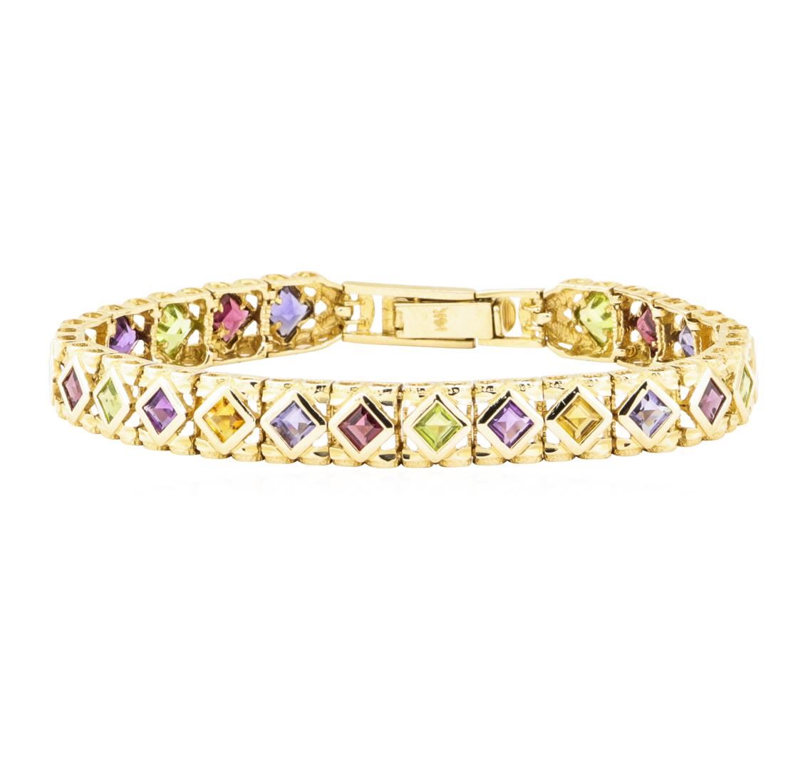 One multi-color gemstone bracelet measuring approximately seven and a half inches in length and 8mm in width featuring: 14KT yellow gold weighing 15.9 grams containing multi-colored gemstones weighing 12.00 ctw.
