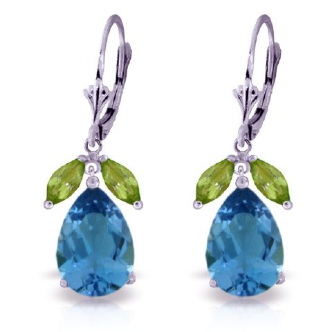 These 14k solid gold leverback earrings with peridot and blue topaz offer stunning colors that are sure to get you noticed. The contrast of the genuine peridot and blue topaz stones offers plenty of sparkle, while giving them a look that is unique. Four marquis shaped peridot stones are in each pair, with one carat of green glimmer. These stones look even more radiant and glowing when paired with twelve amazing carats contained in two pear shaped blue topaz stones. The simple and elegant leverback design makes these earrings easy to wear and security all day long. This jewelry piece is shipped in an elegant black jewelry box and is accompanied by an Appraisal Certificate. Retail price: $2507