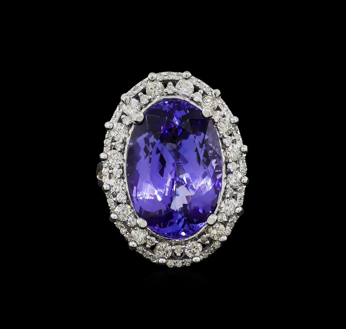One electronically tested 14KT white gold lady's cast fashion ring with a split shank double basket halo with a bright polish finish. The featured lady's ring has a shank measuring 1.87 millimeters wide. Identified with markings of 'K14'. Condition is new, good workmanship. Containing: One prong set oval modified brilliant cut natural tanzanite, measuring 17.09 x 12.04 x 8.05mm, (depth est.) 3%. bulge factor, approximate weight of 12.01ct., clarity is eye clean, medium dark, moderately strong, violetish blue color, (GIA vB 6/4), cut is very good. Transmitting light with no distortion, transparent. Colored gemstones are presumed to have been subjected to commonly used enhancement processes. Graded in the setting. Sixteen prong set round brilliant cut diamonds, measuring 2.30 - 2.20 x 1.35mm (depth est.) approximate total weight of 16 Stones = 0.66ct. Graded in the setting. Clarity SI-1 to I-1. Color: H - I Cut Good Sixteen prong set round brilliant cut diamonds, measuring 1.30 - 1.20 x 0.78mm (depth est.) approximate total weight of 16 Stones = 0.12ct. Graded in the setting. Clarity SI-1 to SI-2. Color: H - I Cut Good Forty-Eight prong set round brilliant cut diamonds, measuring 0.90 - 0.85 x 0.55mm (depth est.) approximate total weight of 48 Stones = 0.12ct. Graded in the setting. Clarity SI-1 to SI-2. Color: H - I Cut Good. Total Weight of Colored Stones 12.01ct.. Total Weight of Diamonds 0.90ct.. Total Weight of Ring 9.90gm GAS Appraised at $25,550.00.