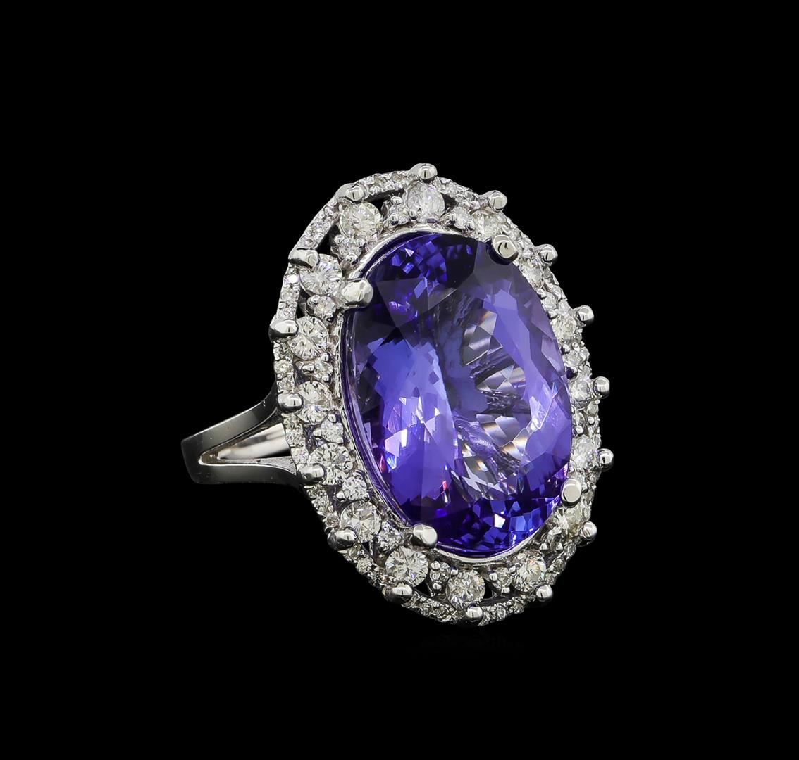 One electronically tested 14KT white gold lady's cast fashion ring with a split shank double basket halo with a bright polish finish. The featured lady's ring has a shank measuring 1.87 millimeters wide. Identified with markings of 'K14'. Condition is new, good workmanship. Containing: One prong set oval modified brilliant cut natural tanzanite, measuring 17.09 x 12.04 x 8.05mm, (depth est.) 3%. bulge factor, approximate weight of 12.01ct., clarity is eye clean, medium dark, moderately strong, violetish blue color, (GIA vB 6/4), cut is very good. Transmitting light with no distortion, transparent. Colored gemstones are presumed to have been subjected to commonly used enhancement processes. Graded in the setting. Sixteen prong set round brilliant cut diamonds, measuring 2.30 - 2.20 x 1.35mm (depth est.) approximate total weight of 16 Stones = 0.66ct. Graded in the setting. Clarity SI-1 to I-1. Color: H - I Cut Good Sixteen prong set round brilliant cut diamonds, measuring 1.30 - 1.20 x 0.78mm (depth est.) approximate total weight of 16 Stones = 0.12ct. Graded in the setting. Clarity SI-1 to SI-2. Color: H - I Cut Good Forty-Eight prong set round brilliant cut diamonds, measuring 0.90 - 0.85 x 0.55mm (depth est.) approximate total weight of 48 Stones = 0.12ct. Graded in the setting. Clarity SI-1 to SI-2. Color: H - I Cut Good. Total Weight of Colored Stones 12.01ct.. Total Weight of Diamonds 0.90ct.. Total Weight of Ring 9.90gm GAS Appraised at $25,550.00.