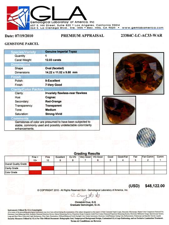 Excellent clear cognac red/orange colored specimen oval cut; lab quality evaluation 10; treatment as noted; Gem Guide wholesale $9008-$12010; full retail appraisal $48122; full lab evaluation included