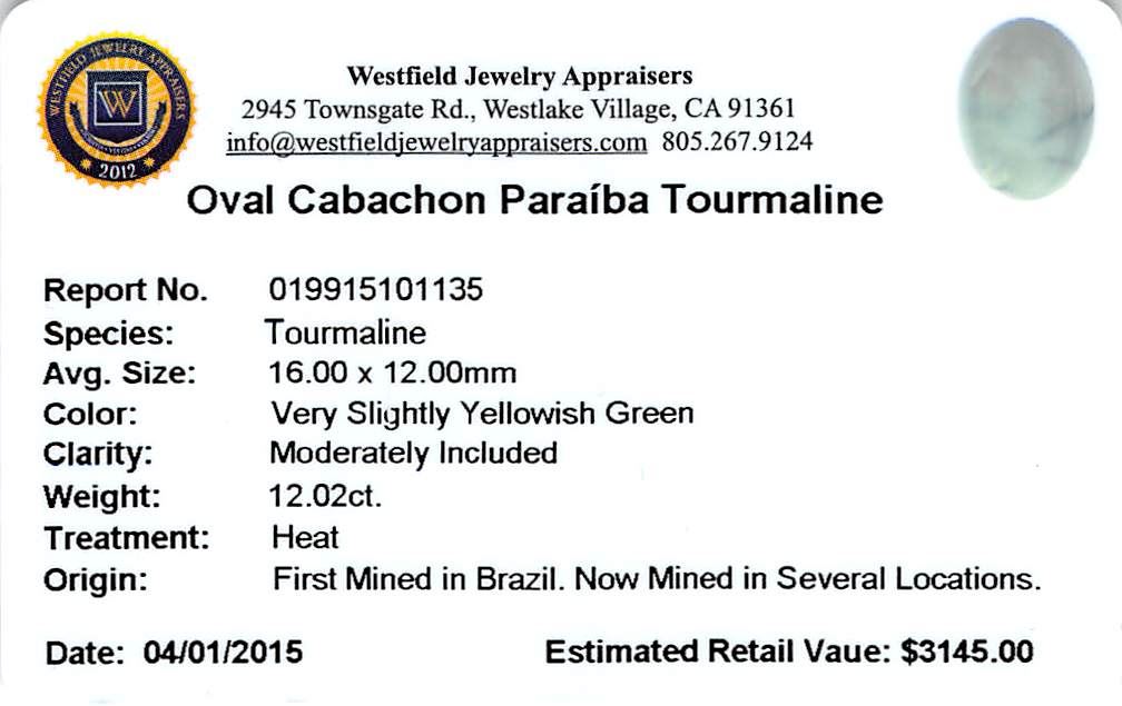 One oval cabochon cut Paraiba tourmaline exact weight 12.02ct., clarity is moderately included, cut is good. Westfield Appraised at $3,145.00.