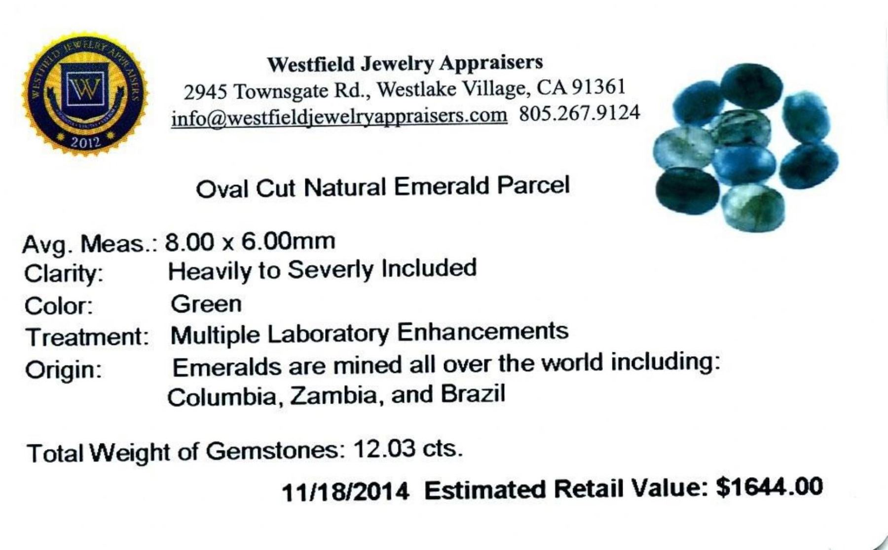 12.03cts. Oval Cut Natural Emerald Parcel Westfield Appraised.