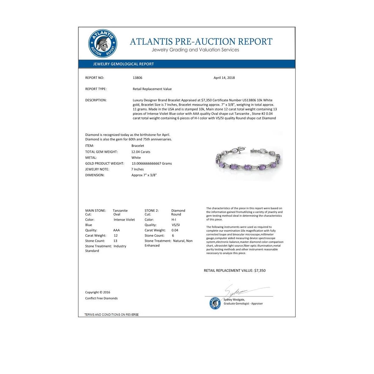 REF-95H3A -13806 ---- 12.04 CTW Tanzanite & Diamond Bracelet 10K White Gold ---- Luxury Designer Brand Bracelet Appraised at $7,350 Certificate Number US13806 10k White gold, Bracelet Size is 7 Inches, Bracelet measuring approx. 7" x 3/8", weighing in total approx. 11 grams. Made in the USA and is stamped 10k, Main stone 12 carat total weight containing 13 pieces of Intense Violet Blue color with AAA quality Oval shape cut Tanzanite , Stone #2 0.04 carat total weight containing 6 pieces of H-I color with VS/SI quality Round shape cut Diamond