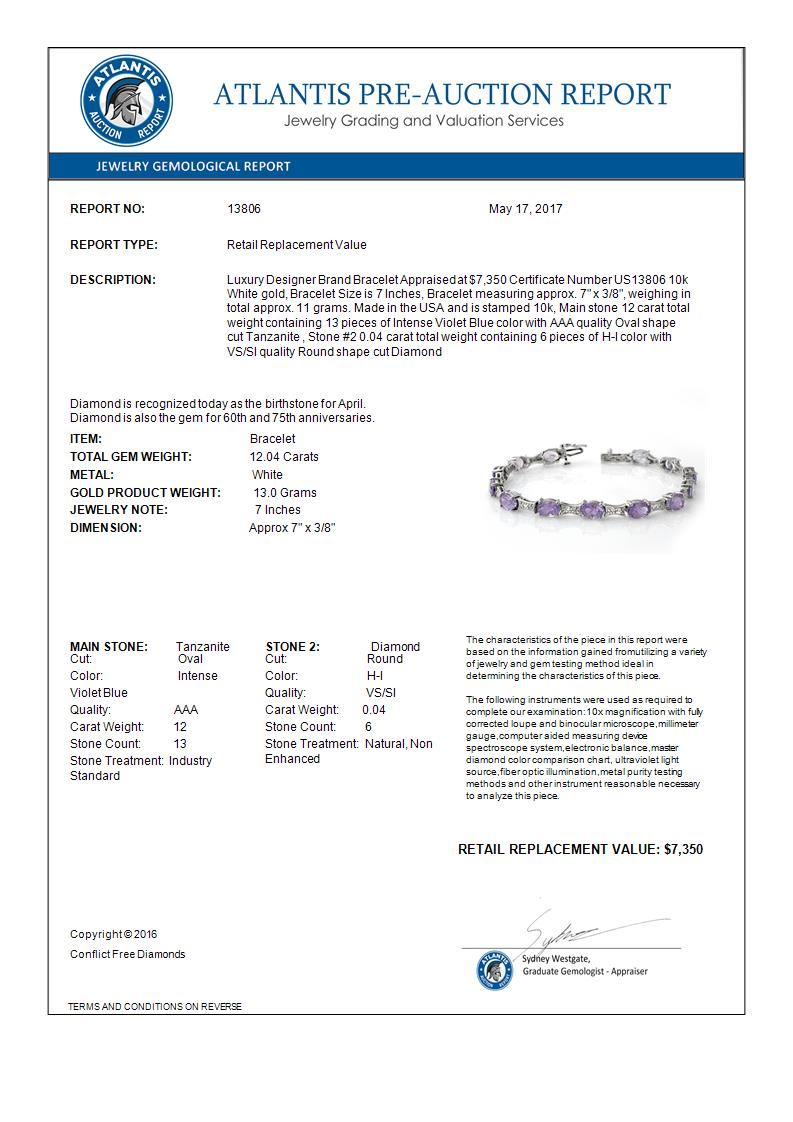12.04 CTW Tanzanite & Diamond Bracelet 10K White Gold ---- Luxury Designer Brand Bracelet Appraised Retail Price at $7,350 ---- SKU Number US13806 10k White gold Bracelet Size is 7 Inches, Bracelet measuring approx. 7" x 3/8", weighing in total approx. 11 grams. Made in the USA and is stamped 10k, Main stone 12 carat total weight containing 13 pieces of Intense Violet Blue color with AAA quality Oval shape cut Tanzanite , Stone #2 0.04 carat total weight containing 6 pieces of H-I color with VS/SI quality Round shape cut