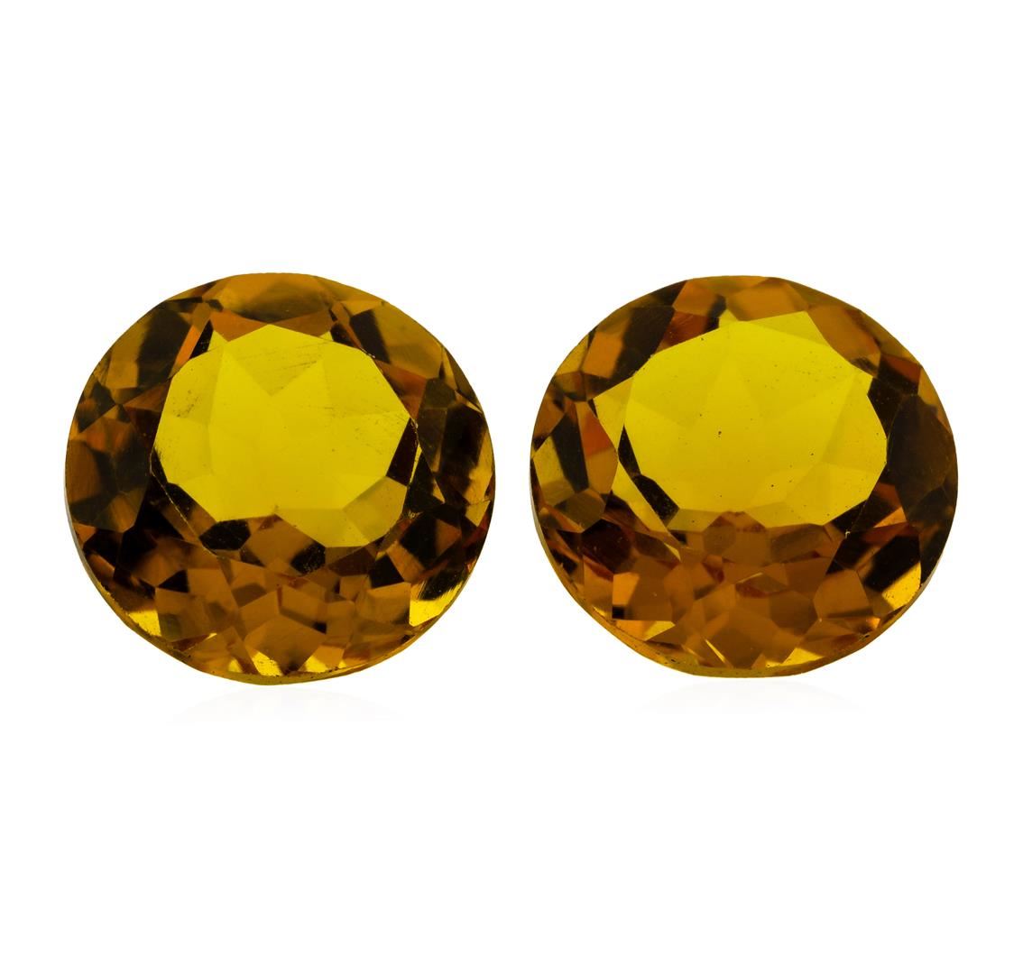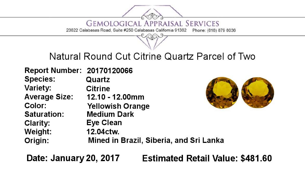One natural round cut citrine quartz parcel of two with an exact weight of 12.04ctw., clarity is eye clean, yellowish orange, medium dark. Gemological Appraisals Services estimates the retail value at $481.6 GAS Appraised.