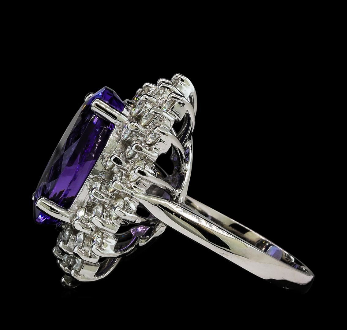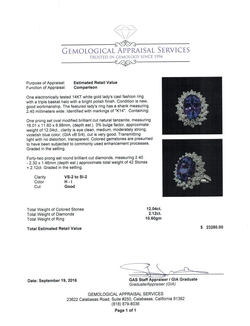 One electronically tested 14KT white gold lady's cast fashion ring with a triple basket halo with a bright polish finish. The featured lady's ring has a shank measuring 2.40 millimeters wide. Identified with markings of 'K14'. Condition is new, good workmanship. Containing: One prong set oval modified brilliant cut natural tanzanite, measuring 16.01 x 11.60 x 8.98mm, (depth est.) 3%. bulge factor, approximate weight of 12.04ct., clarity is eye clean, medium, moderately strong, violetish blue color, (GIA vB 5/4), cut is very good. Transmitting light with no distortion, transparent. Colored gemstones are presumed to have been subjected to commonly used enhancement processes. Graded in the setting. Forty-Two prong set round brilliant cut diamonds, measuring 2.40 - 2.30 x 1.46mm (depth est.) approximate total weight of 42 Stones = 2.12ct. Graded in the setting. Clarity VS-2 to SI-2. Color: H - I Cut Good. Total Weight of Colored Stones 12.04ct.. Total Weight of Diamonds 2.12ct.. Total Weight of Ring 10.60gm. GAS Appraised at $23,280.00.
