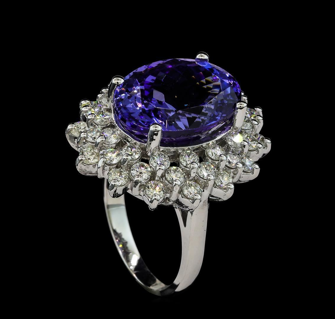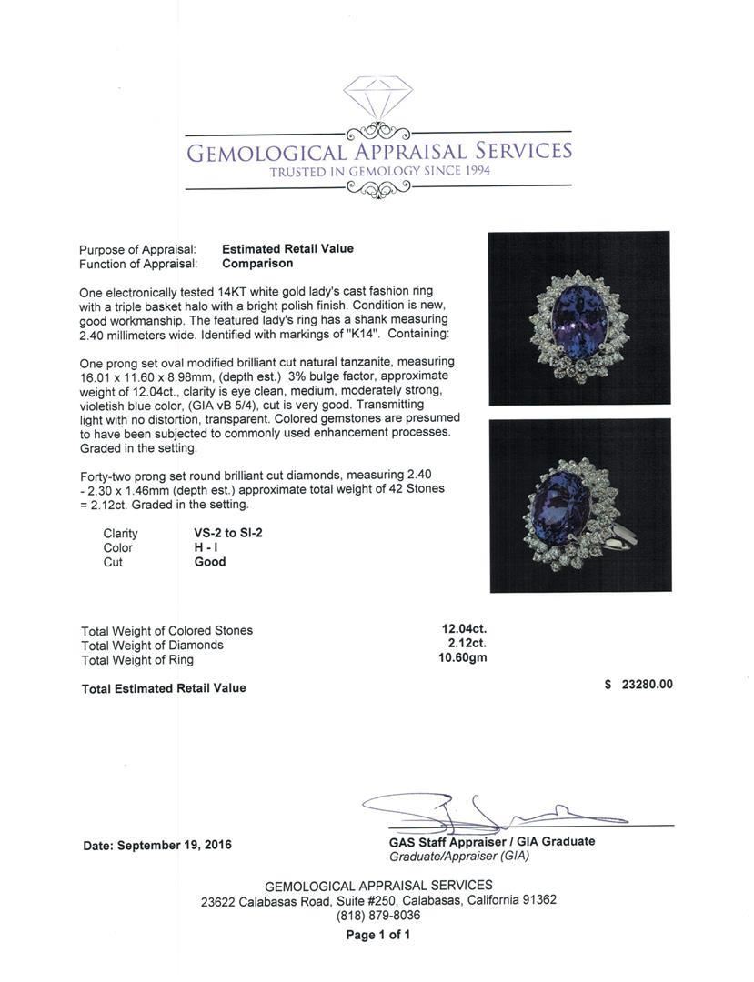 One electronically tested 14KT white gold lady's cast fashion ring with a triple basket halo with a bright polish finish. The featured lady's ring has a shank measuring 2.40 millimeters wide. Identified with markings of 'K14'. Condition is new, good workmanship. Containing: One prong set oval modified brilliant cut natural tanzanite, measuring 16.01 x 11.60 x 8.98mm, (depth est.) 3%. bulge factor, approximate weight of 12.04ct., clarity is eye clean, medium, moderately strong, violetish blue color, (GIA vB 5/4), cut is very good. Transmitting light with no distortion, transparent. Colored gemstones are presumed to have been subjected to commonly used enhancement processes. Graded in the setting. Forty-Two prong set round brilliant cut diamonds, measuring 2.40 - 2.30 x 1.46mm (depth est.) approximate total weight of 42 Stones = 2.12ct. Graded in the setting. Clarity VS-2 to SI-2. Color: H - I Cut Good. Total Weight of Colored Stones 12.04ct.. Total Weight of Diamonds 2.12ct.. Total Weight of Ring 10.60gm. GAS Appraised.