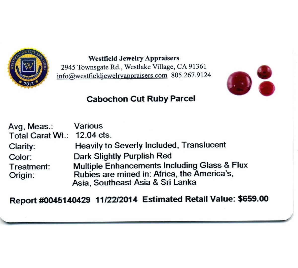 12.04ctw. Cabochon Cut Ruby Parcel. Westfield Appraised at $659.00.