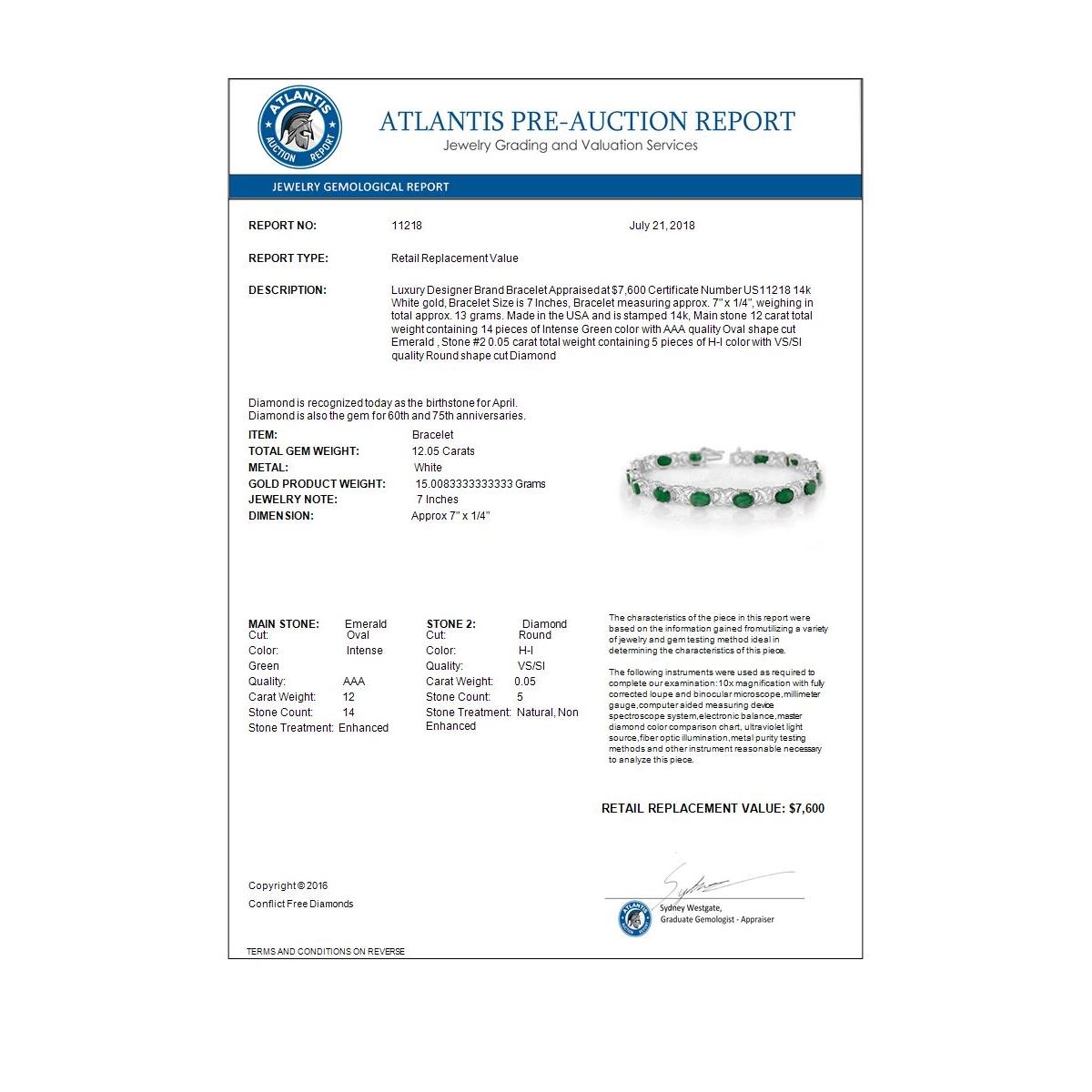 REF-106F2N -11218 ---- 12.05 CTW Emerald & Diamond Bracelet 14K White Gold ---- Luxury Designer Brand Bracelet Appraised at $7,600 Certificate Number US11218 14k White gold, Bracelet Size is 7 Inches, Bracelet measuring approx. 7" x 1/4", weighing in total approx. 13 grams. Made in the USA and is stamped 14k, Main stone 12 carat total weight containing 14 pieces of Intense Green color with AAA quality Oval shape cut Emerald , Stone #2 0.05 carat total weight containing 5 pieces of H-I color with VS/SI quality Round shape cut Diamond