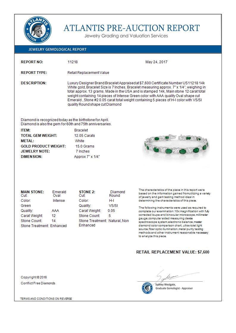 12.05 CTW Emerald & Diamond Bracelet 14K White Gold ---- Luxury Designer Brand Bracelet Appraised Retail Price at $7,600 ---- SKU Number US11218 14k White gold Bracelet Size is 7 Inches, Bracelet measuring approx. 7" x 1/4", weighing in total approx. 13 grams. Made in the USA and is stamped 14k, Main stone 12 carat total weight containing 14 pieces of Intense Green color with AAA quality Oval shape cut Emerald , Stone #2 0.05 carat total weight containing 5 pieces of H-I color with VS/SI quality Round shape cut